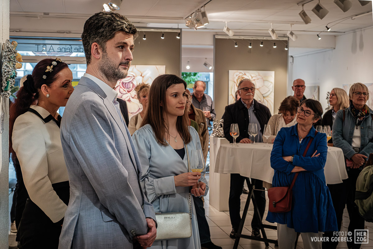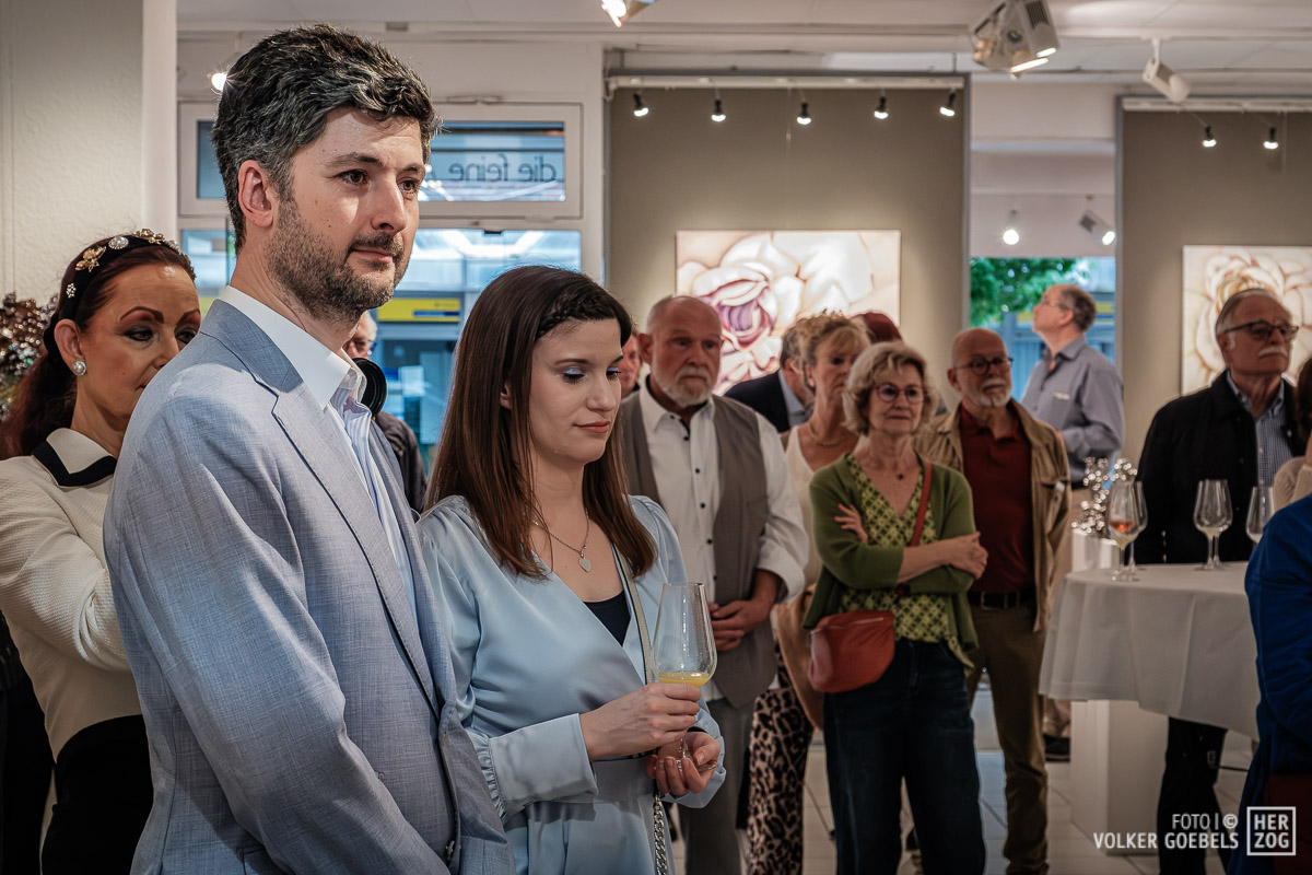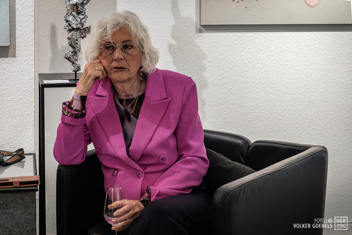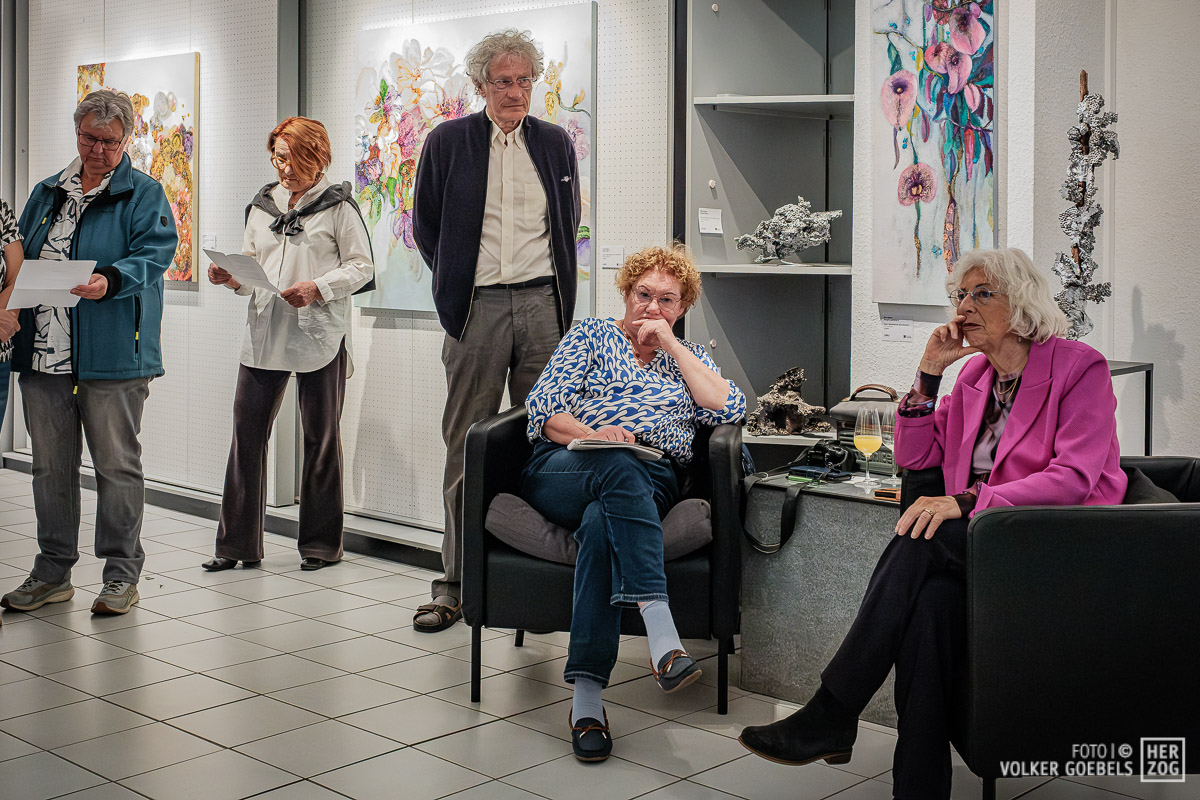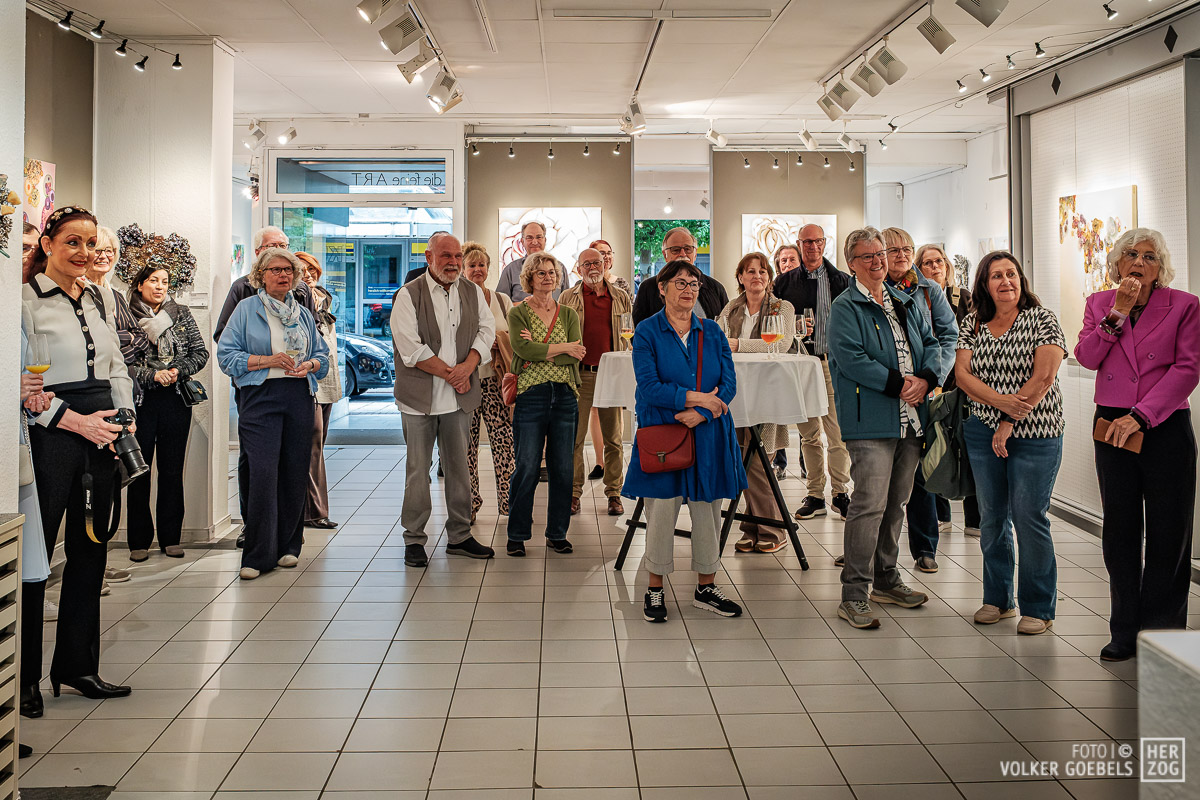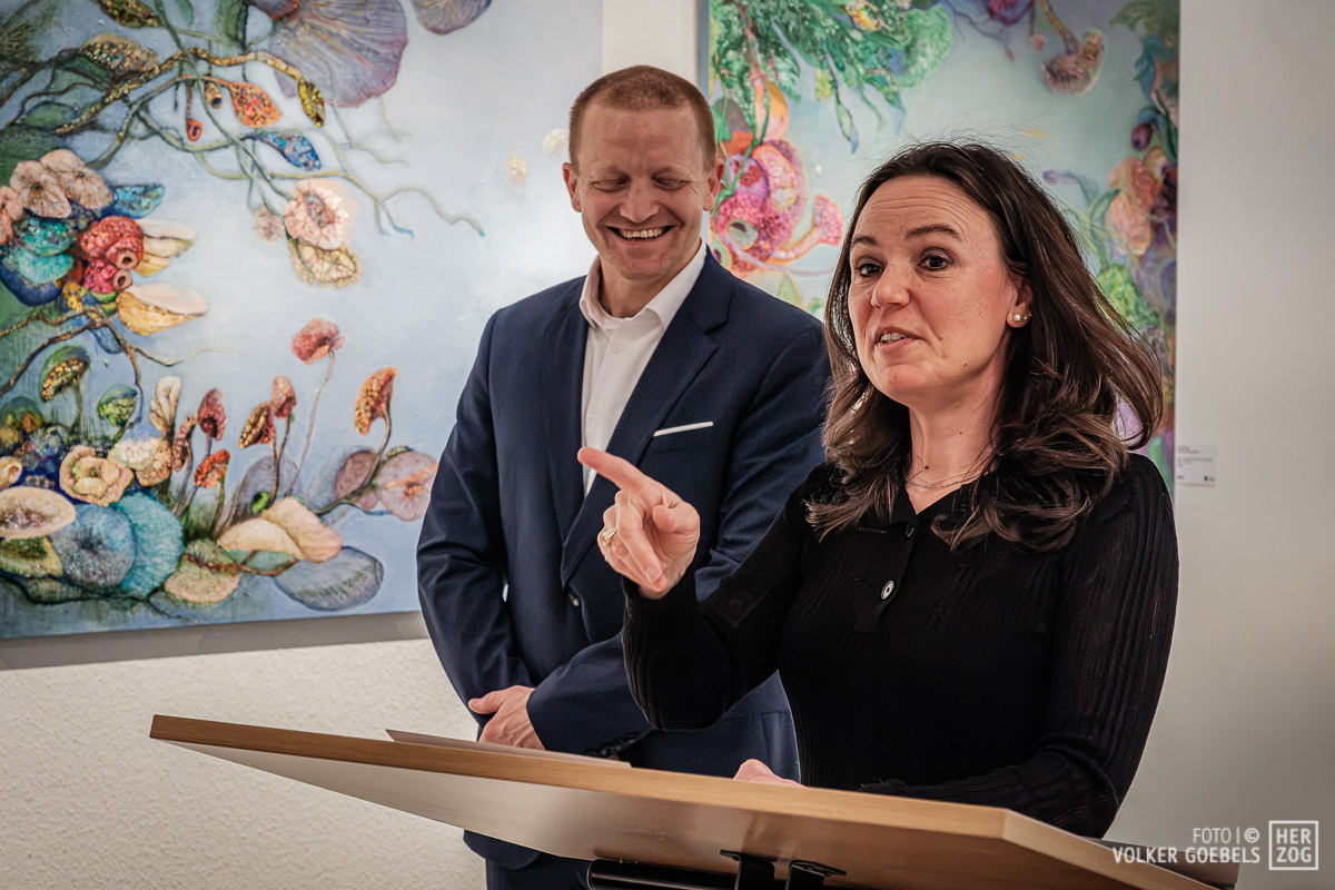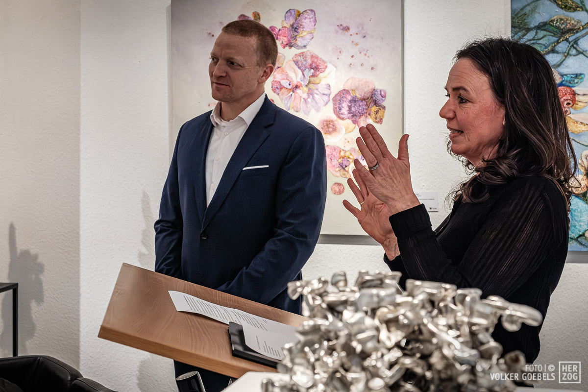 Die Galerie An der Zitadelle präsentiert Ruttens Malerei in Kombination mit Plastiken von Max Engels. Alexandra Simon-Tönges hat die Künstler und ihre Werke anlässlich der Vernissage vorgestellt. Bemerkenswert sei der abwechslungsreiche kompositorische Aufbau der Gemälde von Rutten, so die Kunsthistorikerin. „Der Fokus liegt teils auf ungewöhnlichen Stellen im Bild, dennoch erzeugt Ena immer eine sehr vielschichtige, zugleich dynamische und harmonische Bildordnung. Vielleicht ist es genau das, was ihre Arbeiten so lebendig macht: Sie wirken nicht konstruiert, sondern gewachsen“, überlegte Simon-Tönges in ihren einführenden Worten.