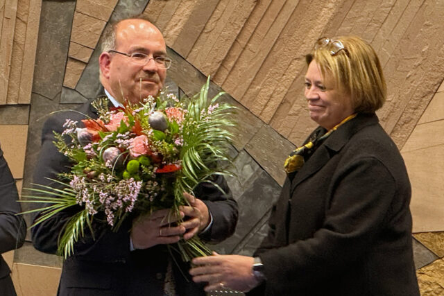 Die feierliche Vereidigung von Ralf Nolten nahm Helga Conzen (CDU) als dienstältestes Kreistagsmitglied vor; sie ist seit 1999 im Kreistag. „Haben Sie bitte weiter den Mut, sich für unsere Demokratie zu engagieren. Erheben Sie Ihre Stimme“, sagte Ralf Nolten und bezeichnete den Kreistag als „Schule der Demokratie“. Hier würde „Heimat geschaffen, Orientierung gegeben und für Zusammenhalt gesorgt“. Der neue Landrat, der seit dem 1. November im Amt ist, appellierte, immer „fair und respektvoll miteinander umzugehen.“ Es sei wichtig, bei Problemen nach Lösungen zu suchen, Dienstleister für die Menschen zu sein und „Mut zur Zukunft“ zu haben. „Wenn wir uns gemeinsam ins Zeug legen, haben wir eine gute Zeit vor uns“, sagte Landrat Nolten.