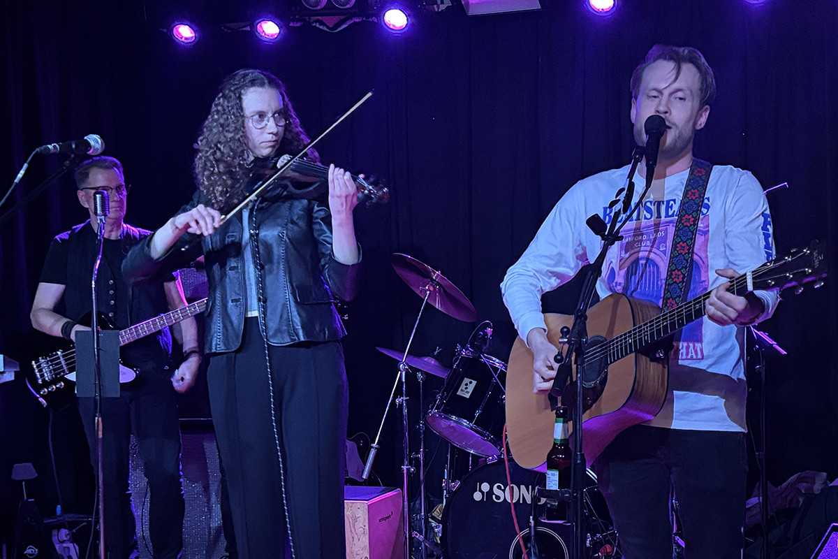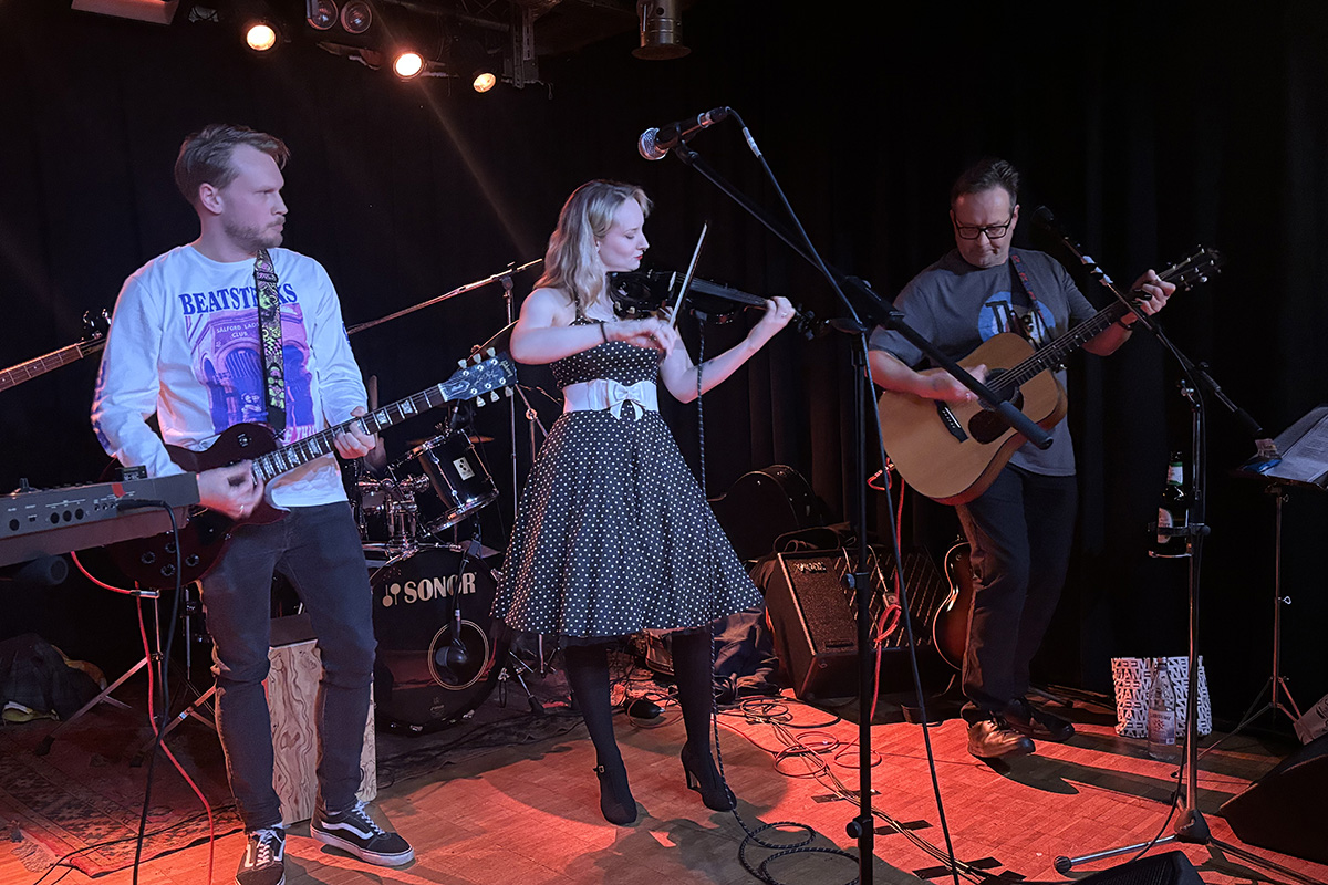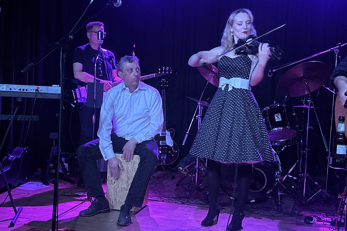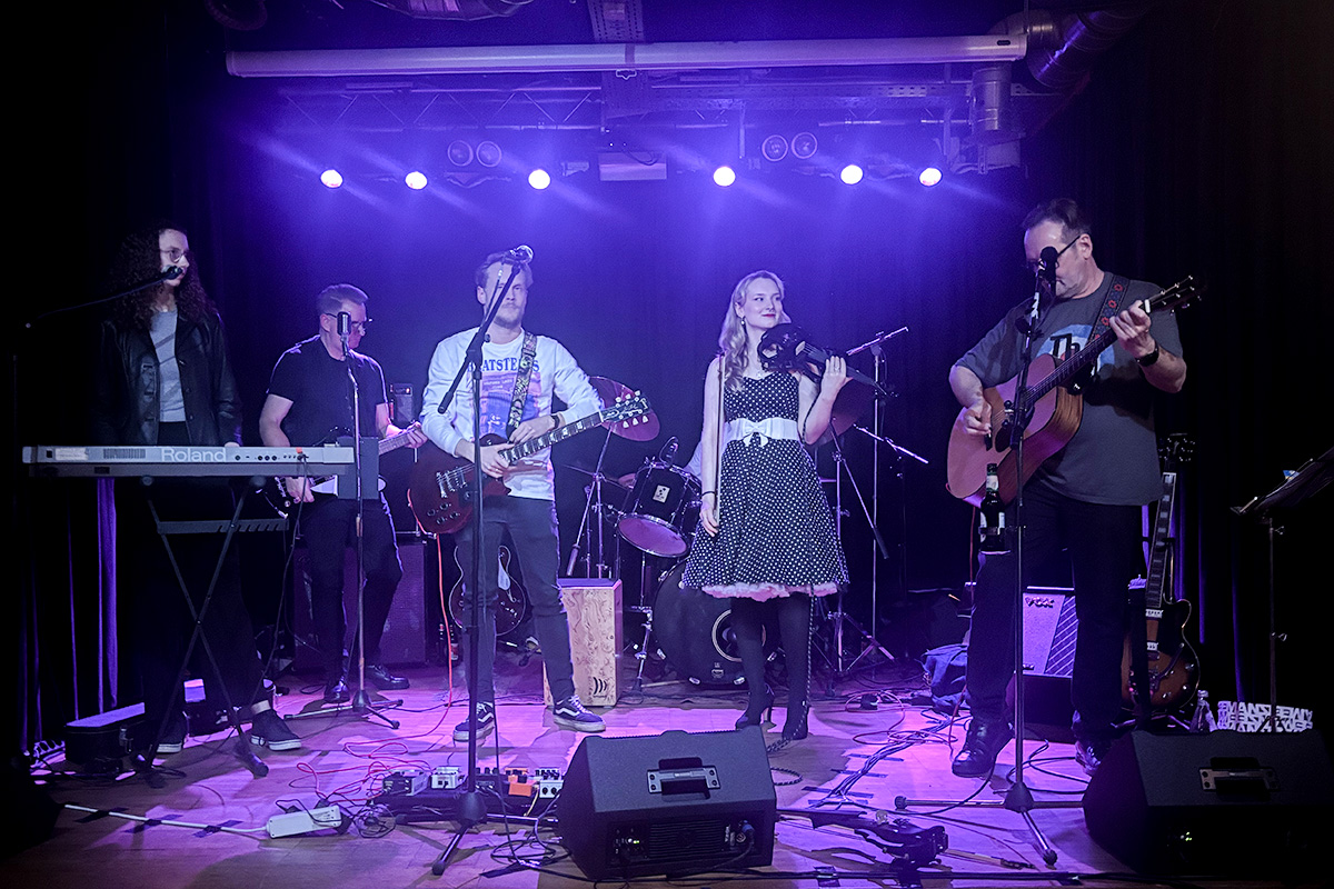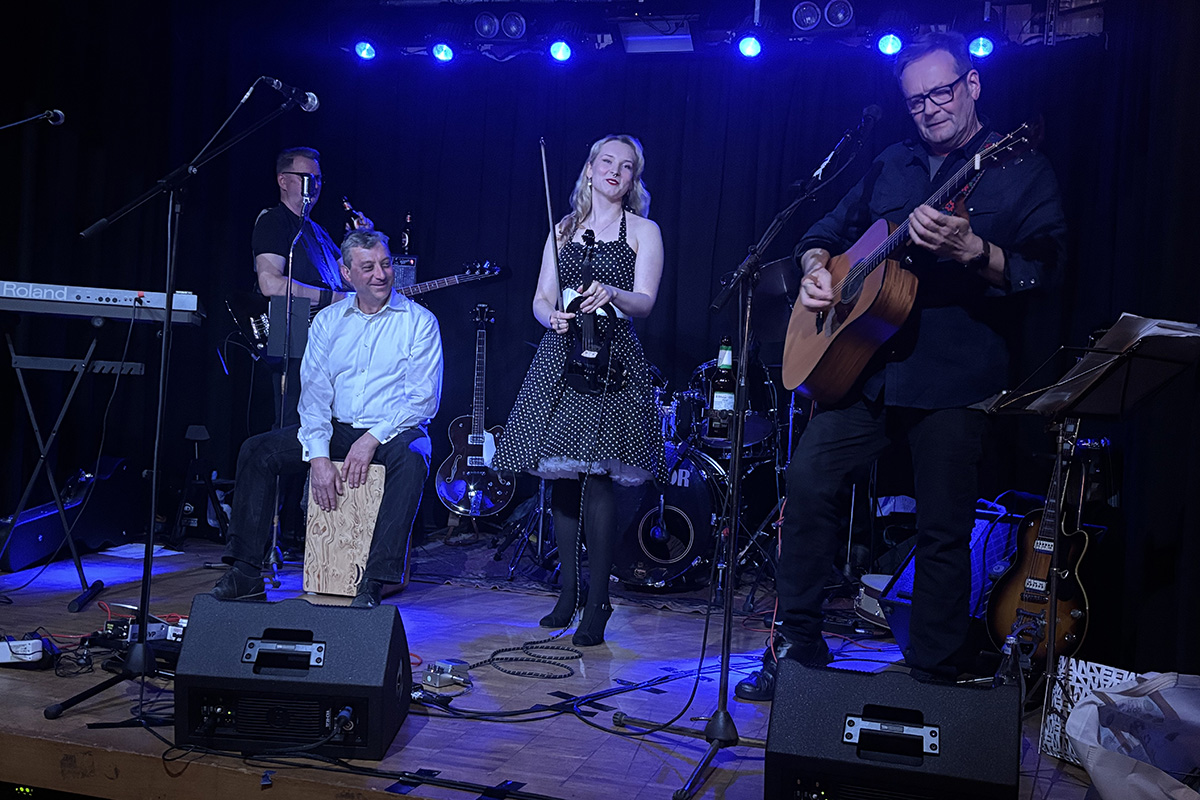 Ein besonderes Highlight folgte später am Abend: Die Band holte sich Verstärkung aus der eigenen Familie auf die Bühne. Jannis, der Sohn des Gitarristen, unterstützte die Band mit einer Gitarre, ebenso seine Schwester Merle mit einer Geige. Dazu kam die Tochter Marit des Schlagzeugers am Keyboard und ebenfalls an der Geige. Für einen Song wuchs die Formation so zu einer sechsköpfigen Band an – ein Moment, der nicht nur musikalisch, sondern für die Band auch emotional herausstach. Auch klanglich zeigte sich die Band flexibel: Für einen ruhigeren Part wechselte der Schlagzeuger auf eine Cajón und brachte damit eine andere, akustischere Atmosphäre ins Set.
