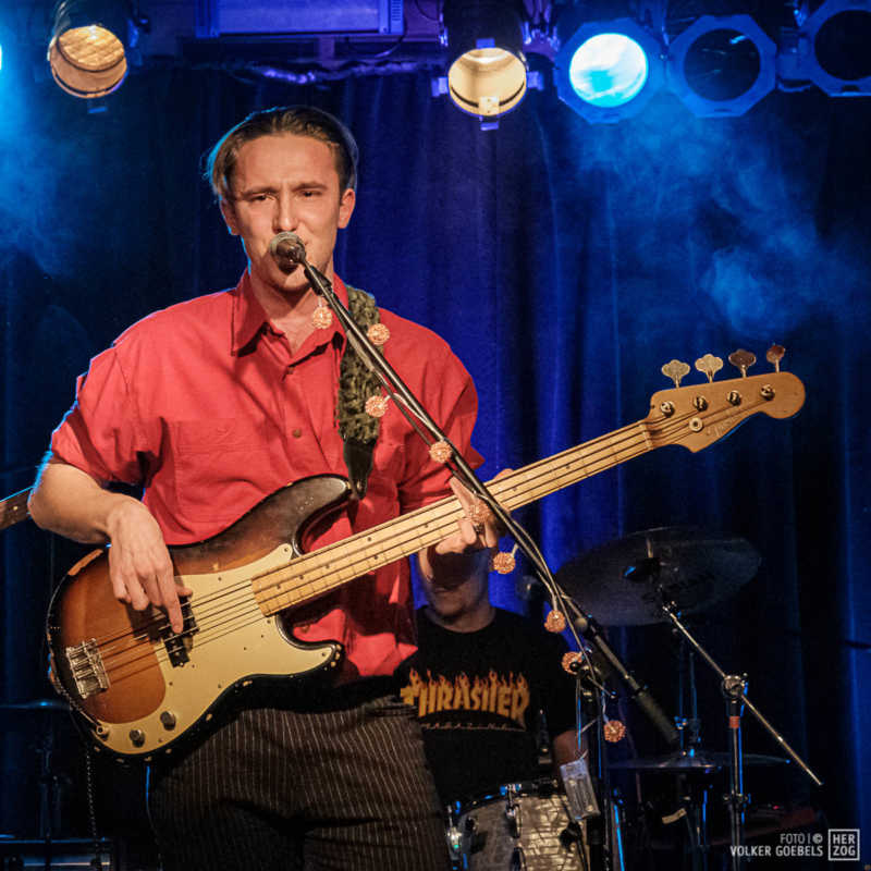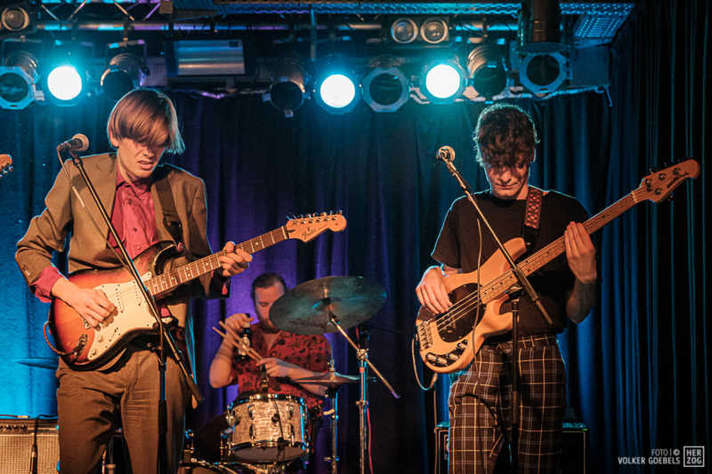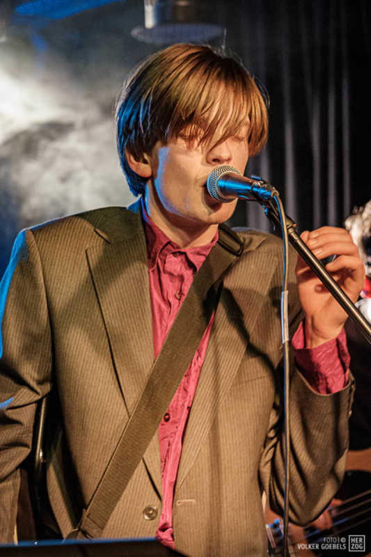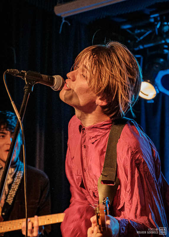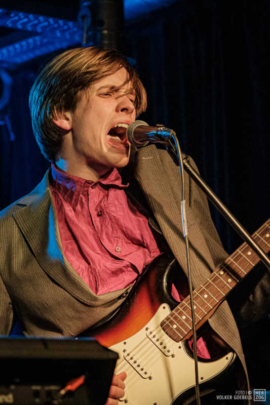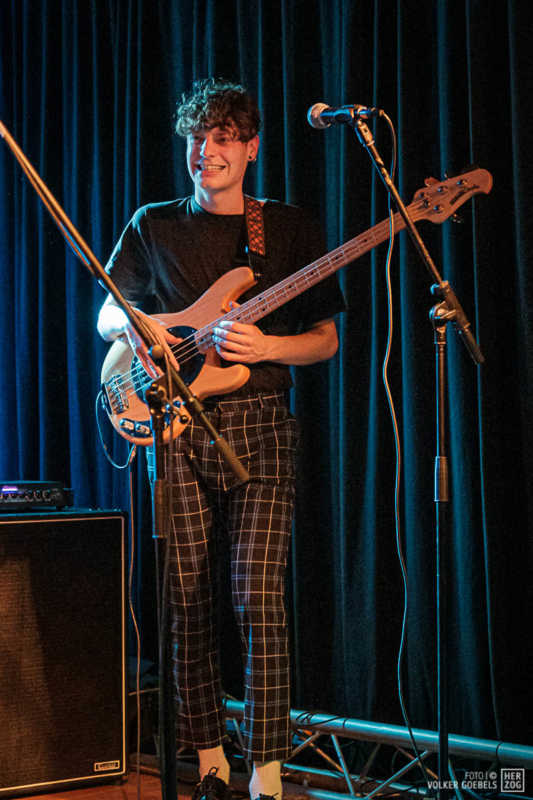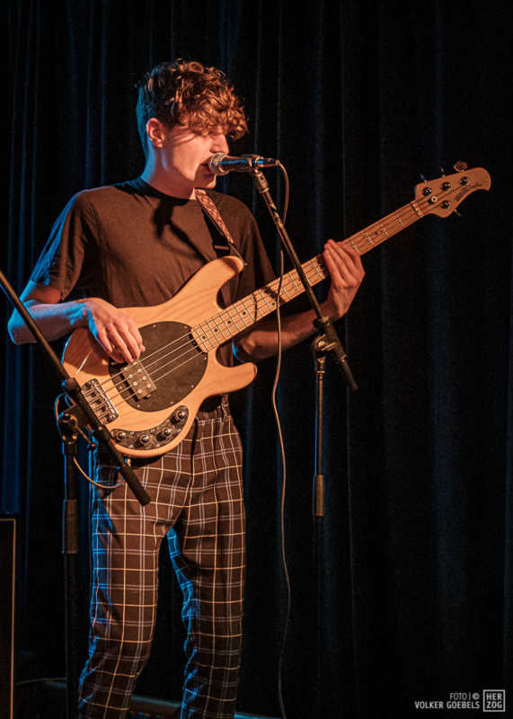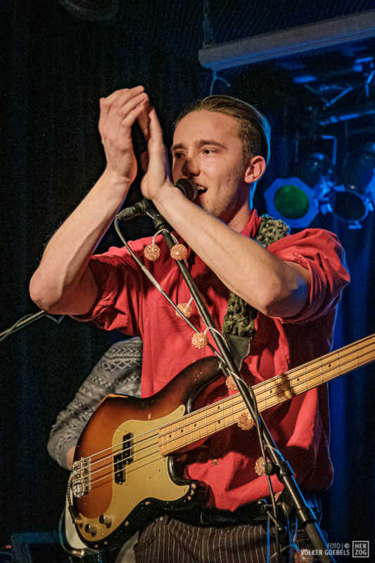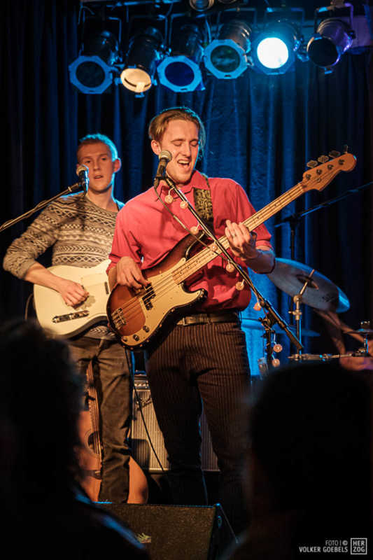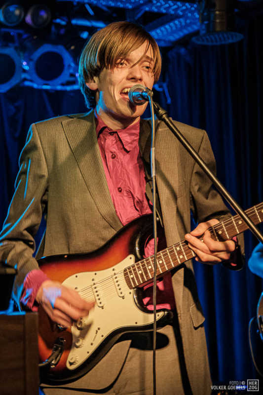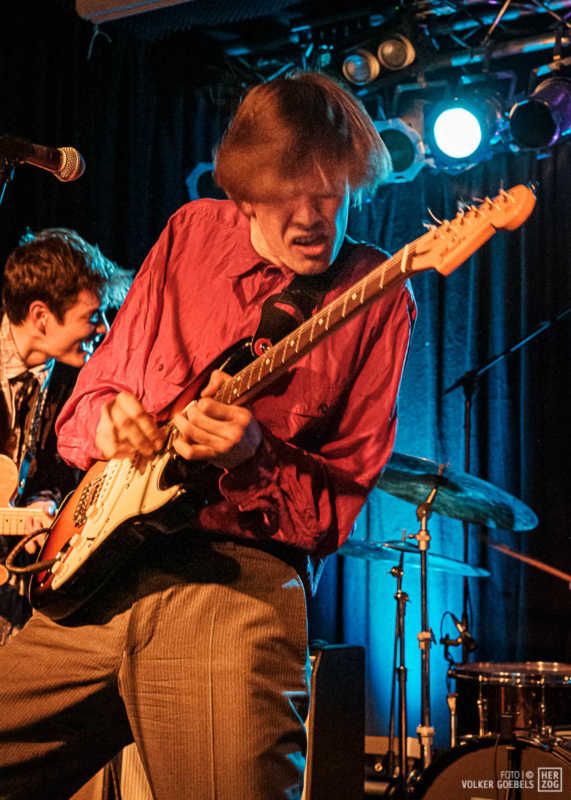 Action ist angesagt, die Band mag nicht ruhig bleiben, und da offenbar auch viele Zuhörer nicht wissen, wohin mit der erzeugten Energie, setzen sie diese halt in rhythmische Bewegungen auf der Tanzfläche um. Power-Pop, Surf und Garage heißt die Gangrichtung laut Info, dabei setzen die Vier bei „Sly smiled Berlin child“ voll auf wildes ungestümes 60ies-Flair. Da schütteln nicht nur Floris und Bassist Simon ihre halblangen Wuschelhaare.