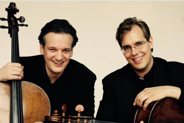 „Cello Duello“ ist zugleich Name und Programm. Ein musikalischer Wettstreit, den die Künstler Jens Peter Maintz und Wolfgang Emanuel Schmidt mit ihren Streichinstrumenten auf der Bühne austragen.