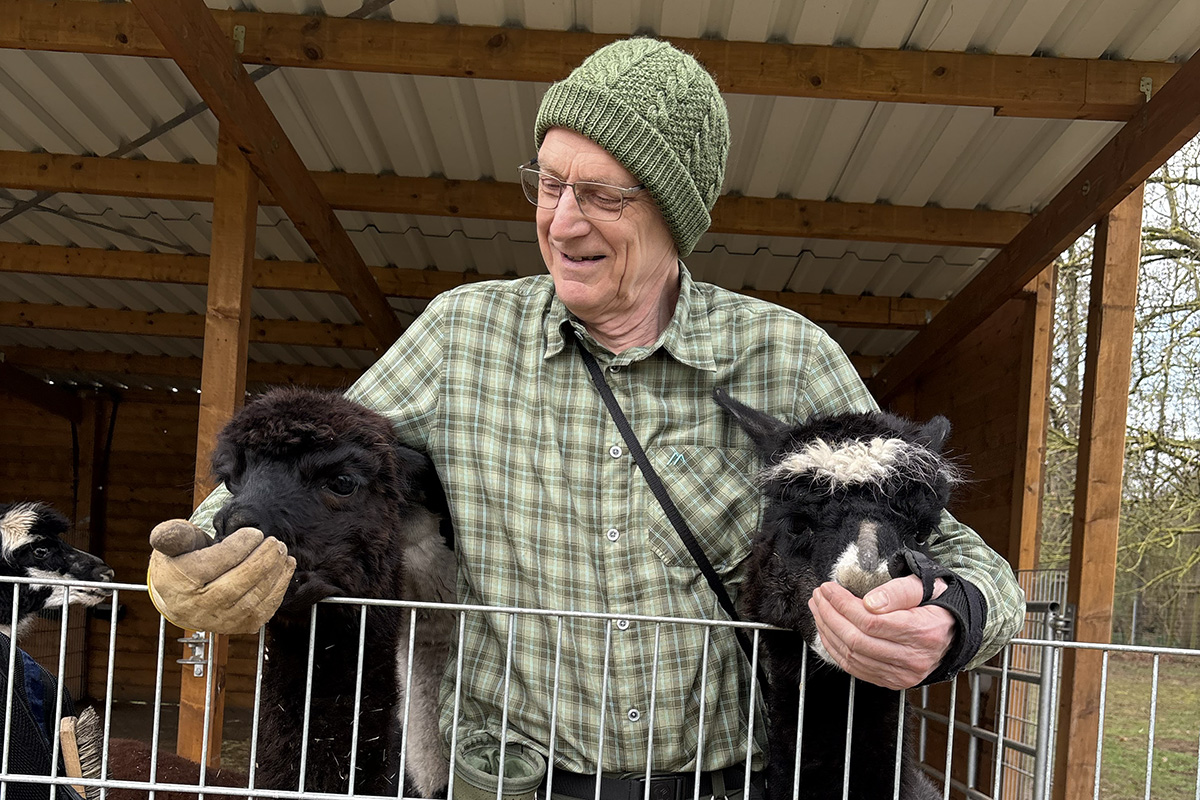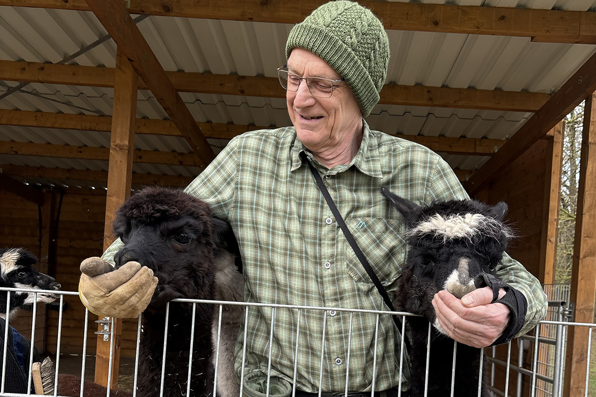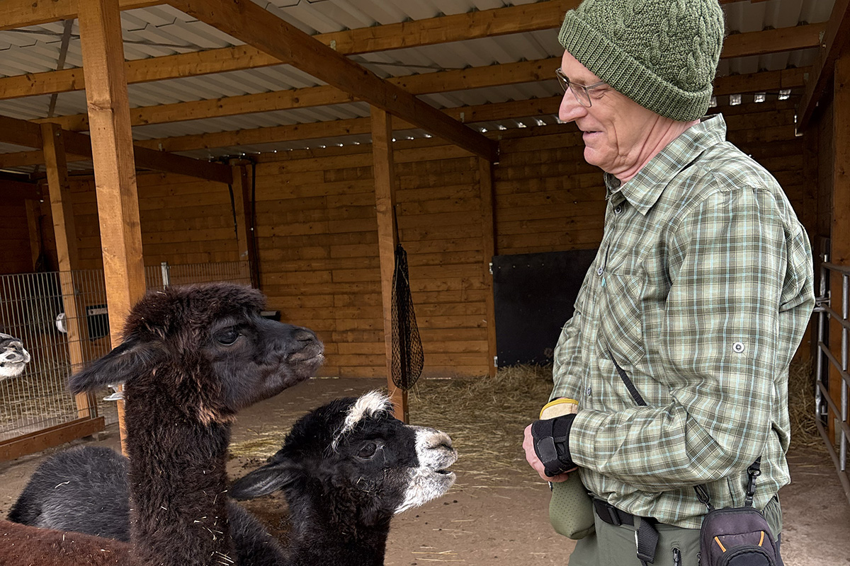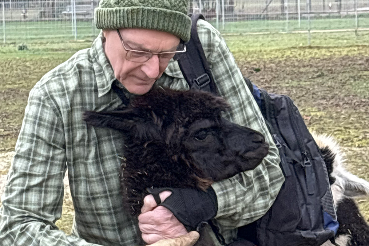 Reinhold war und ist eigentlich IT-Spezialist, hat sein Berufsleben in der Welt der Großcomputer bei der IT-Firma mit den drei ebenso großen Buchstaben verbracht und war deshalb auch lange aus Jülich weg. Obwohl wir gemeinsame Jugendfreunde haben, lernten wir uns erst im Rentenalter bei den Senioren im Netz kennen, wo er sein Fachwissen an uns weiterreichte bis es ihm eines Tages selbst gereicht hat. Er hatte sich wohl verliebt, in die Alpakas.