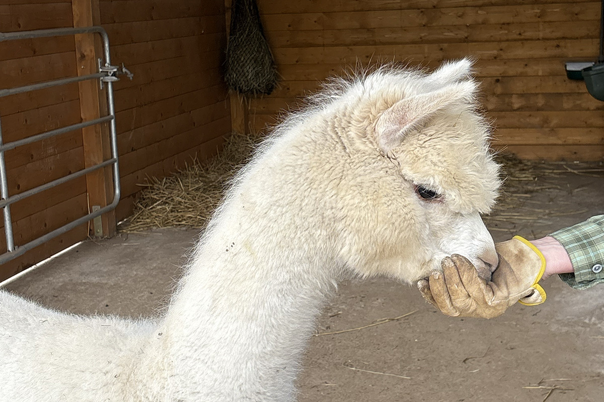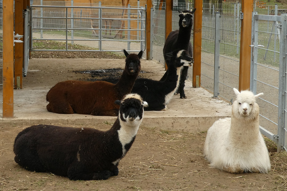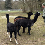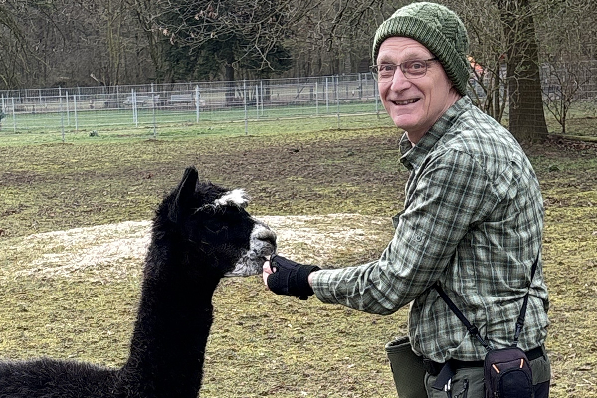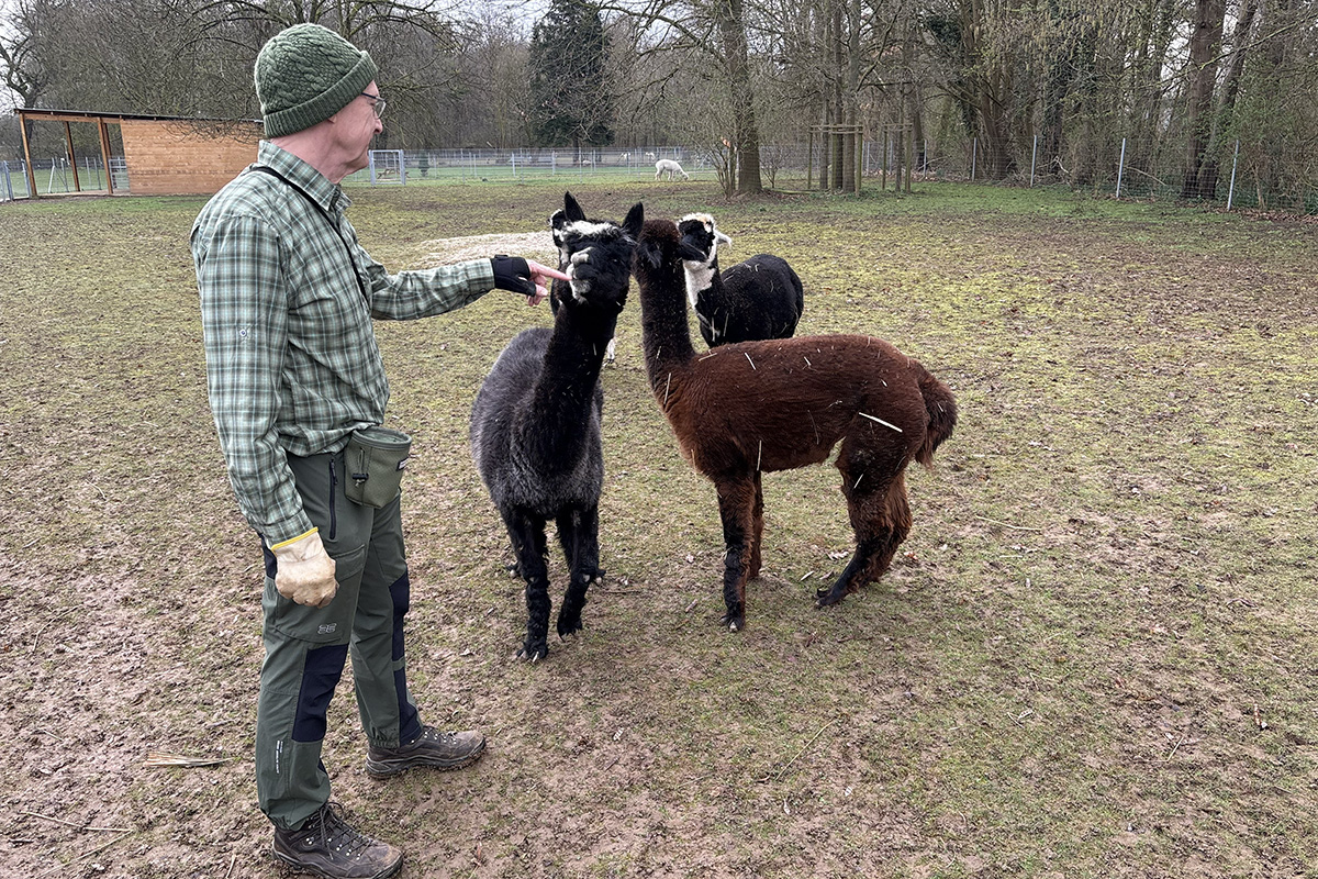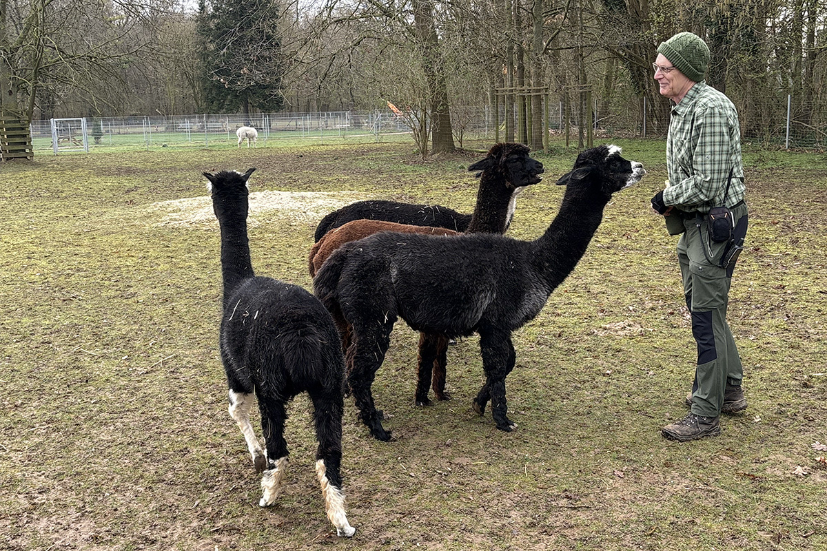Der schicke und einzige Herr im Gehege lebt für sich allein, separiert im Abseits, aber mit Blickkontakt zu den benachbarten Damen. Für den Herren, der zwar fein aussieht, sich aber nicht immer fein benimmt, gilt: „Nur gucken, nicht anfassen“, weil es einmal zu einer Verletzung kam. Verletzt waren allerdings nicht die Stuten, sondern der Hengst. Er war wohl etwas zu aufdringlich und hat einen drüber bekommen. Zu Anfang waren alle Tiere zusammen. „Da Alpaka-Hengste die Stuten generell anhaltend belästigen, besteht insbesondere die Gefahr von Fehlgeburten, daher diese Vorsichtsmaßnahme“, erklärt der Naturliebhaber. „Hengst Olaf ist im Sommer 2025 überhaupt erst in die Pubertät gekommen, vorher waren ihm die Mädels so ziemlich egal“, ergänzt er grinsend. Natürlich hofft der Jülicher Zoo auch auf Nachwuchs. Die Tragzeit beträgt zwölf Monate. Da der Hengst Olaf und die Stuten Hadassa als Leittier, Meriva, Olympia und Joyce anfangs alle zusammen waren, ist die Hoffnung auf Nachwuchs im kommenden Juli oder August durchaus berechtigt. Reinholds „Intim“-beobachtungen lassen jedenfalls hoffen.