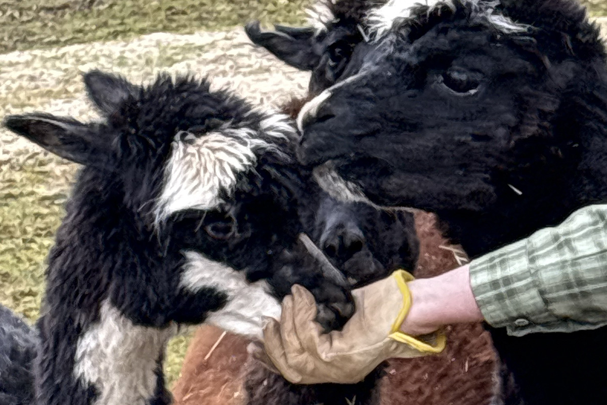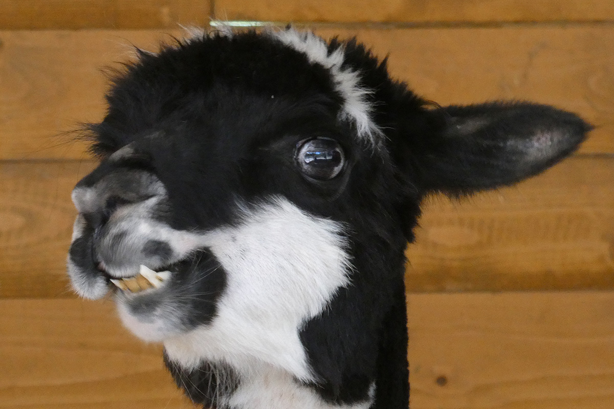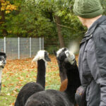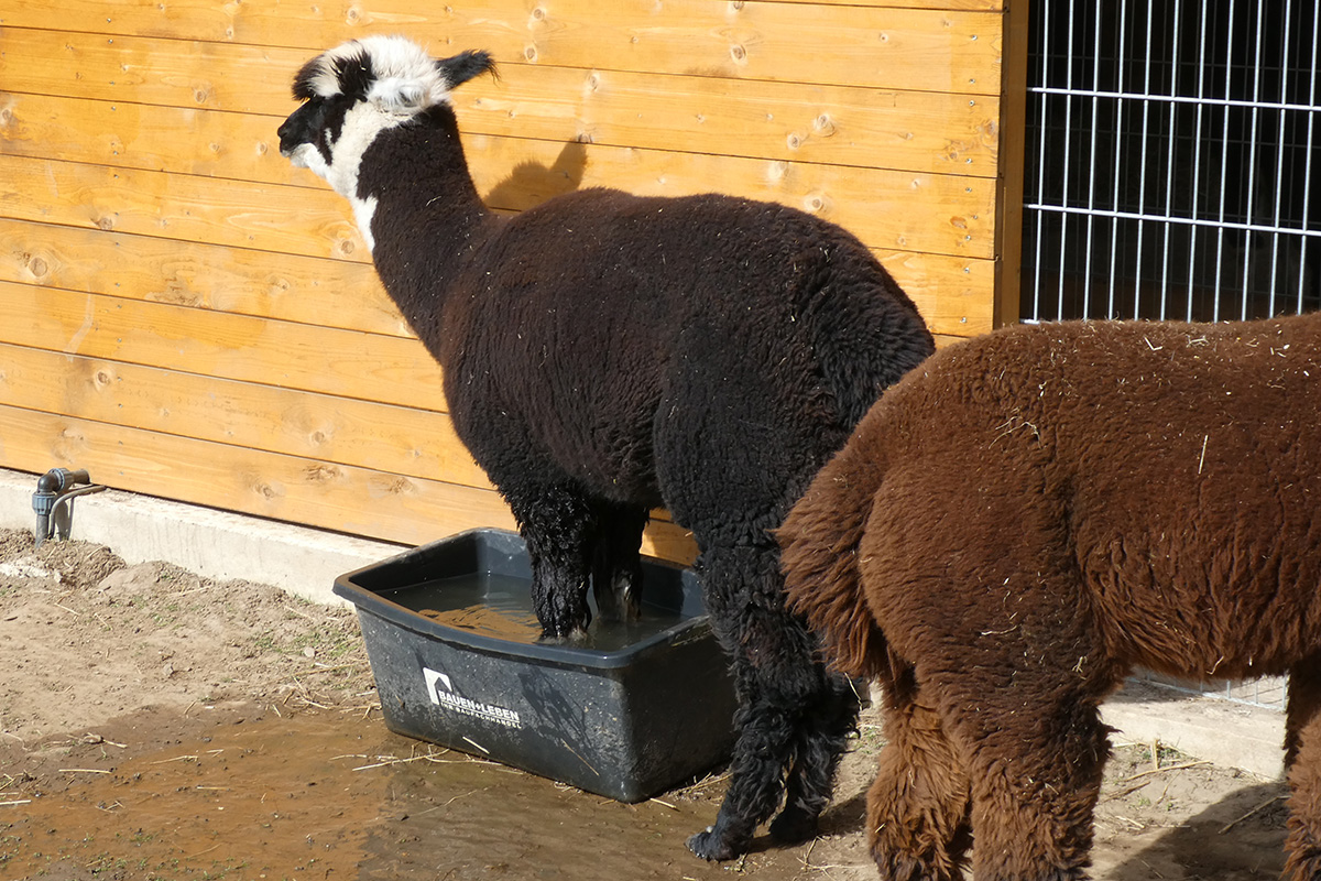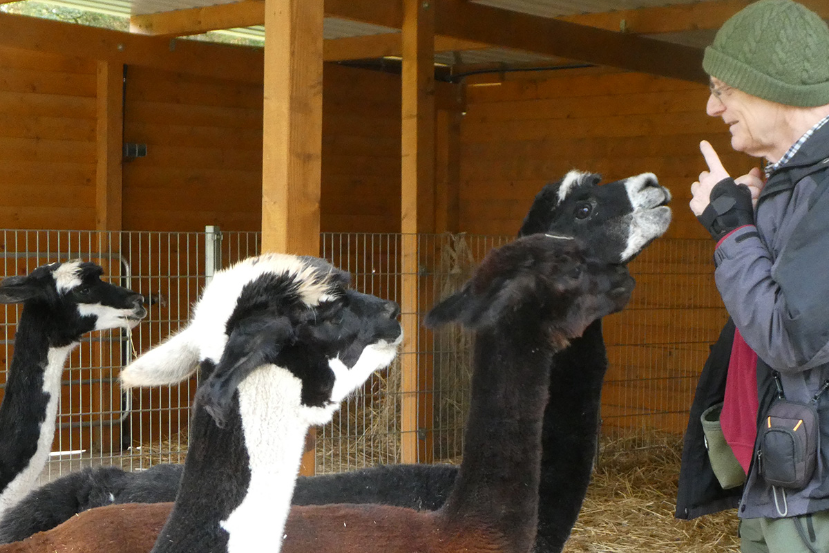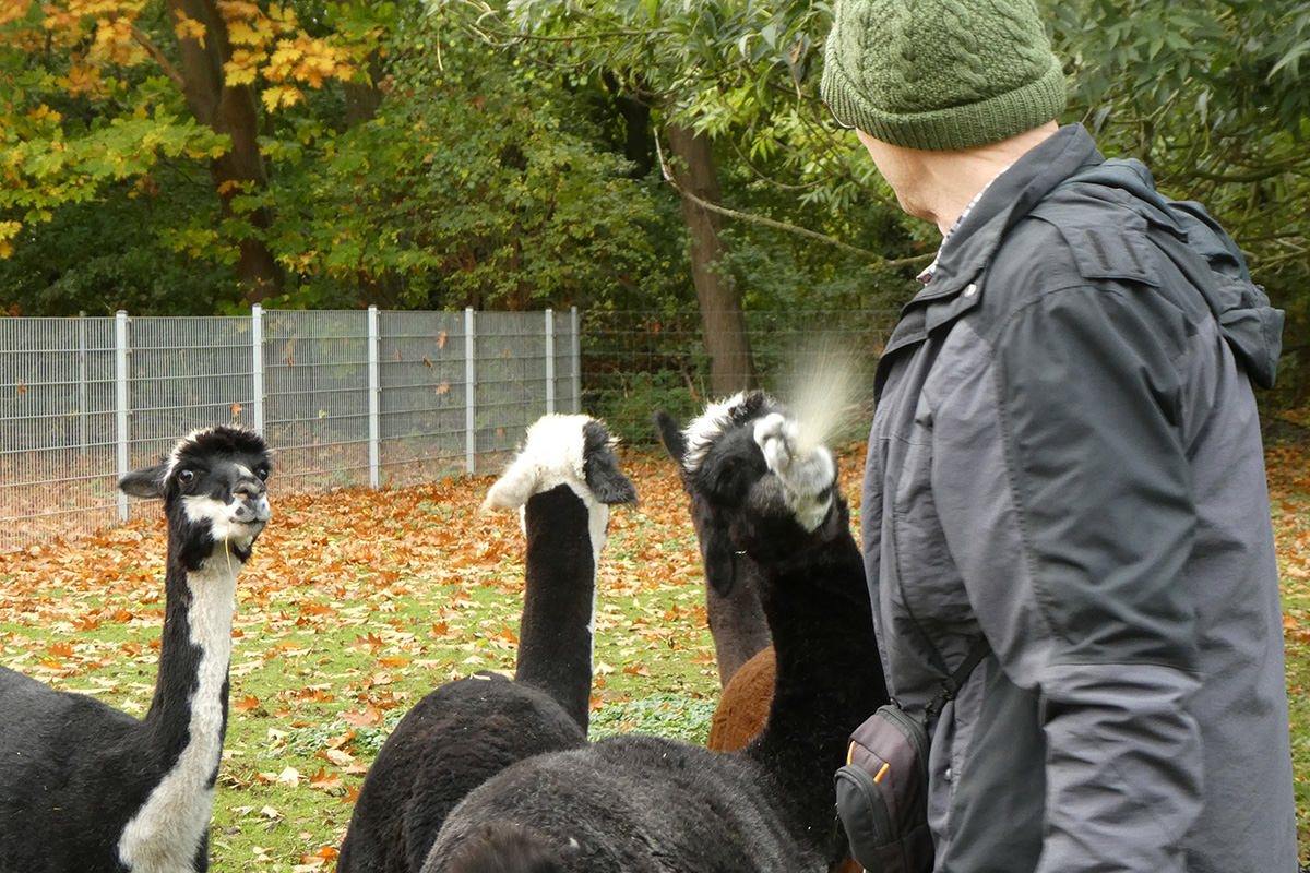 Es ist wie im Film: „Wir können auch anders“ meint wohl speziell das Leittier Hadassa immer wieder. „Wenn ich Hadassa nerve, legt sie oft erst mal nur den Kopf zurück. Wenn ich darauf nicht reagiere, kommt meist erst mal noch eine kleine Menge Spucke, die mir gezielt ins Gesicht fliegt. Wenn mir eines der Tiere in die Hand spuckt, dann nimmt nur dieses Tier noch Futter von meiner Hand an, kein anderes mehr. Jedes Tier hat seinen eigenen Spuckegeruch und empfindet den Fremdgeruch als unerträglich. Menge und Zusammensetzung der Spucke sind steuerbar. Ist der Ärger groß, gibt’s ne Portion Mageninhalt, und das riecht dann besonders unangenehm. Aber auch das lässt sich noch steigern. Nach Silvester war Hadassa vermutlich durch das Feuerwerk noch gereizt und schlecht gelaunt. Ich habe die Frechheit besessen, mich mit den Besuchern zu unterhalten statt Hadassa zu verwöhnen. Dann hat mich Frau Raufbold einfach von hinten in den Oberarm gebissen. Es hat zwar nicht geblutet, Alpakas haben keine scharfen Zähne, aber die Quetschung ergab zwei ordentliche Blutergüsse. Mein Arm war eine Woche lang berührungsempfindlich. Aber eigentlich sind es friedliche Tiere“, beschwichtigt der ehrenamtliche Helfer. Er besucht „seine“ Alpakas mehrmals in der Woche. Es gibt ein festes Begrüßungsritual: Wenn er kommt, gucken sie schon aufmerksam und wenn er dann ruft, kommen sie im gestreckten Galopp angerannt. „Ich habe immer Angst, dass möglicherweise bei einigen die Bremse versagt, besonders bei Hadassa. Auf dem Rückweg zum Stall hüpft sie dann aufgeregt um mich herum und wir rennen zusammen zurück zum Stall. Dabei fühle ich mich zuweilen wie der, ,Der mit dem Wolf tanzt‘.“