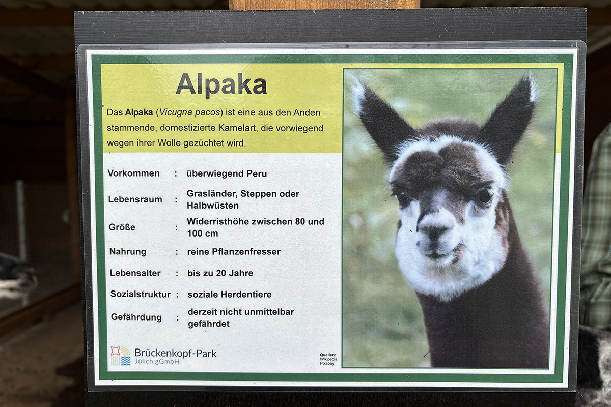 Eigentlich gibt es in Jülich zwei Alpaka-Männer. Der eine ist Reinhold Niederhagen, also ein Mann und auch Mensch. Der andere heißt Olaf, ist zwar auch ein Mann, aber kein Mensch, sondern ein Alpaka. Er ist immer trés chic gekleidet, denn er läuft stets im hellweißen Fell-Anzug im Brückenkopf-Park auf und ab. Die Alpakawolle ist auf Grund ihrer besonderen Eigenschaften sehr beliebt und teurer als Schafwolle. Die Faser ist einerseits äußerst stark und widerstandsfähig, fühlt sich aber trotzdem weich und geschmeidig an. Alpakawolle besitzt eine hohe thermische Kapazität. Sie kühlt bei Hitze und wärmt bei Kälte. Die Alpakas stammen aus den Anden, wo es nachts frisch und tags warm ist. Sie sind also stets passend gekleidet. Zudem ist die Wolle wegen ihrer stark antibakteriellen Wirkung die perfekte Wahl für Allergiker.