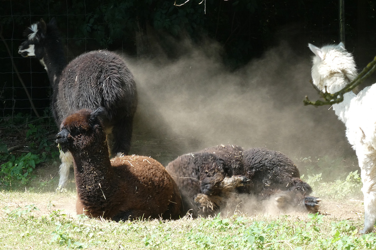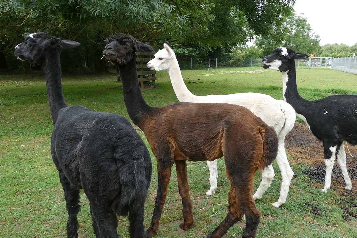 Die Jülicher Tiere werden einmal im Jahr im späten Frühjahr, bevor die Sommerhitze kommt, geschoren. „Du brauchst zwei Leute zum Festhalten und einen zum Scheren. Die ursprünglichen Wildtiere wurden gezielt auf die Wolllieferung hin gezüchtet. Das hat wie bei den Schafen zur Folge, dass sie ohne Schur in freier Wildbahn gar nicht überleben könnten. Von unseren haben wir letztes Jahr fast 15 Zentimeter Wolle runter geholt“, erläutert Reinhold. Das Jülicher Alpaka-Gehege ist vom eigentlichen Zoo ausgegliedert und befindet sich im Brückenkopf-Park in Sichtweite des Floßteiches, den die Kinder gerne als Wasserspielplatz nutzen. Sie gehen dann gerne mit ihren Eltern die paar Schritte weiter zum Gehege. „Das ist allerdings kein Streichelzoo“, erklärt Reinhold, der schon mal mit blauen Flecken nach Hause kam.