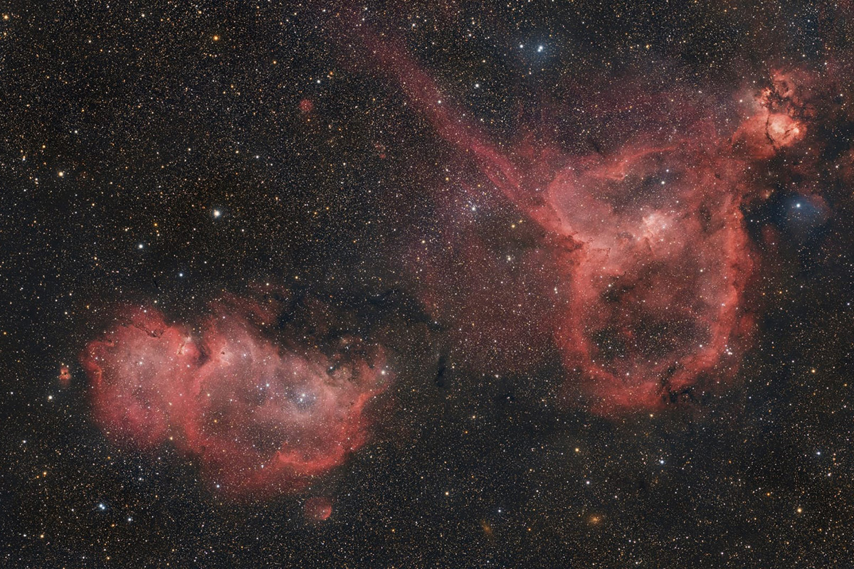 Ein Blick in den Himmel zeigt uns das hell leuchtende Herz des Universums. Also, wortwörtlich, denn was Sie hier sehen, ist der sogenannte Herz-Nebel (oder IC 1805, wie wir Hobby-Astronomen ihn nennen). Er besteht aus zwei Teilen, dem „Herz“ (rechts) und der „Seele“ (links). Dieser etwa 7500 Lichtjahre entfernte Nebel besteht aus riesigen Wasserstoff- und Staub Wolken und ist im Sternenbild Cassiopeia zu finden.