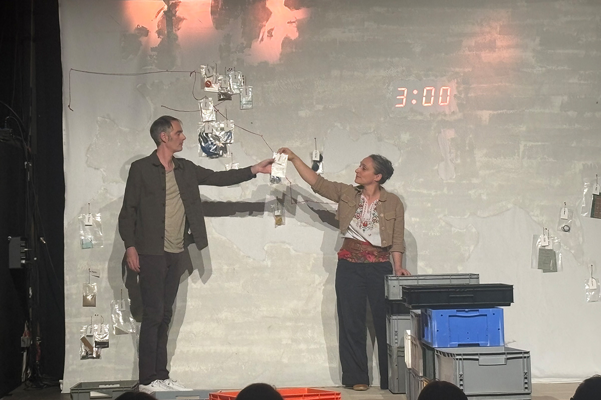 Das Stück beginnt mit der Frage „Ich oder ich?“ – eine Einladung, darüber nachzudenken, ob man die gleiche Meinung teilt oder nicht. Auch Wortspiele mit dem Begriff „Grenze“ sind Teil der Aufführung. Im Mittelpunkt stehen kurze Geschichten, die jeweils drei Minuten dauern. Sie handeln von einzelnen Menschen, die geflüchtet sind – etwa von Syrien in die Niederlande oder von Deutschland nach Amerika in der Zeit nach dem Zweiten Weltkrieg. Auch Themen wie Einsamkeit, Konsum, Nachhaltigkeit und Heimweh kommen vor – sogar ein Neandertaler spielt eine Rolle. Manche Geschichten konnten in drei Minuten kaum zu Ende erzählt werden – ein Zeichen dafür, wie kurz diese Zeitspanne ist.