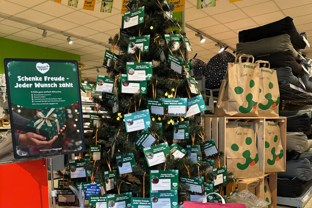 In den Fressnapf-Märkten Jülich, Düren-Rölsdorf, Niederzier, Alsdorf und Übach-Palenberg stehen festlich geschmückte Weihnachtsbäume mit den Herzenswünschen der Tierheim-Tiere – auf Kärtchen notiert von den Pflegerinnen und Pflegern. Die Wünsche reichen von Spezialfutter über stabiles Papageienspielzeug bis hin zu wärmenden Decken für Hunde, sagt Jürgen Plinz.