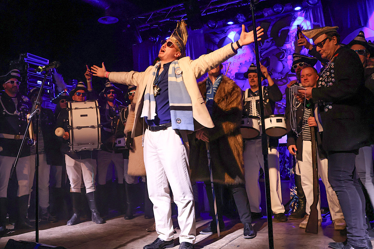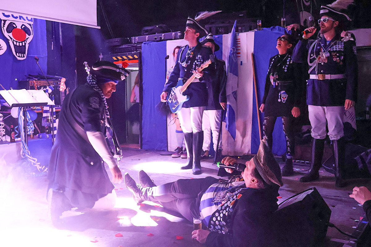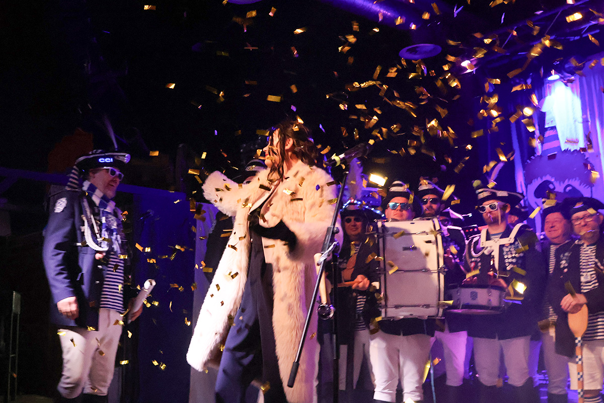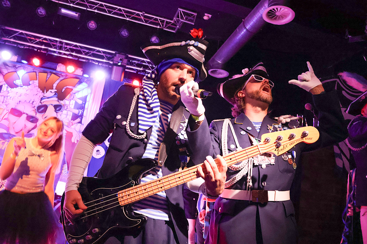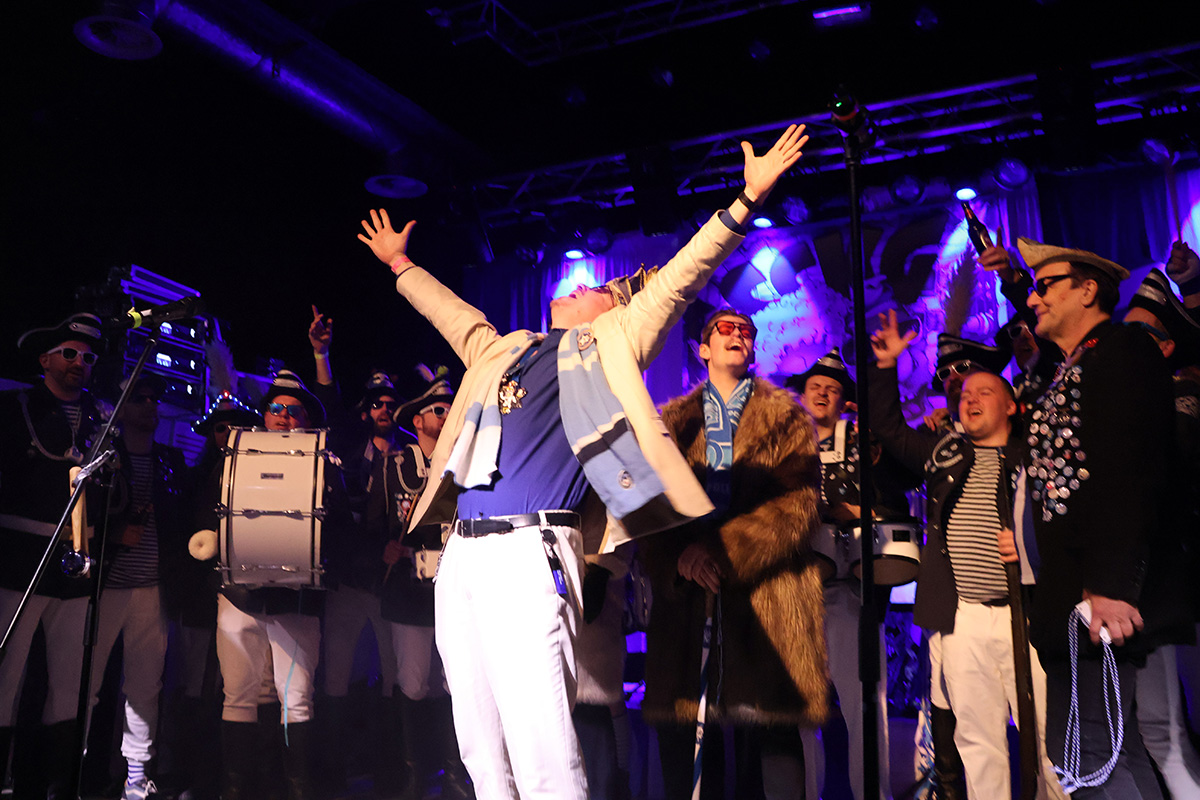 Nach 40 Jahren auf der Bühne zeigt sich aber auch: Personell wächst und ergänzt man sich – und das trotz Doppelbesetzungen. Wenige Musiker verbrachten den Abend durchgängig auf derselben Position, es wurde etwa munter zwischen der Hauptband Les 6 Kölsch 1 Cola und der Band der Prinzengarde getauscht. Und selbst das Dreigestirn sprang zwischenzeitlich musikalisch ein. Dass Prinz Ole (Schlüter) I. dabei auch vielfach in Liedern wie „Prinz Prinz“ am Bass eingesetzt wurde, war ein nettes Schmankerl, das sich durch den Abend zog.
