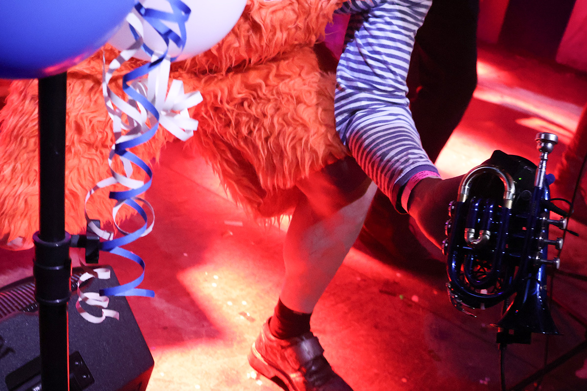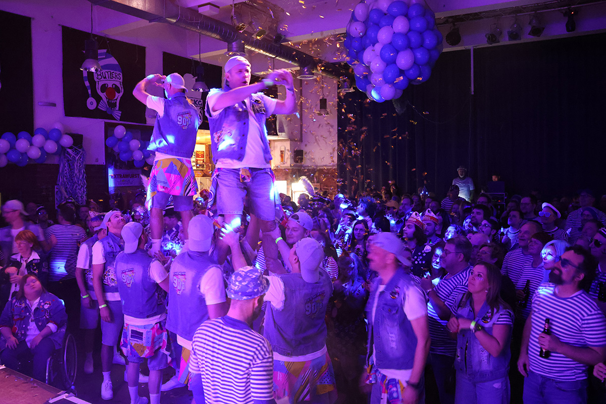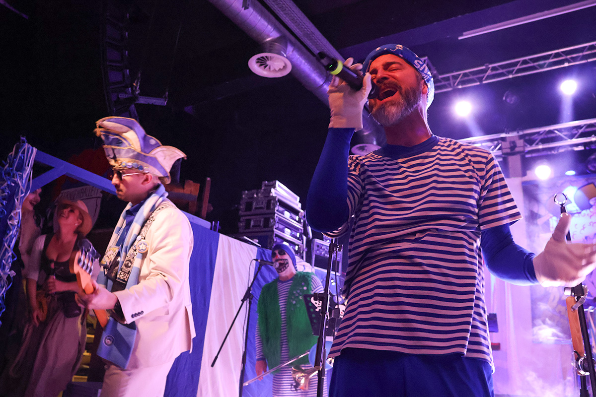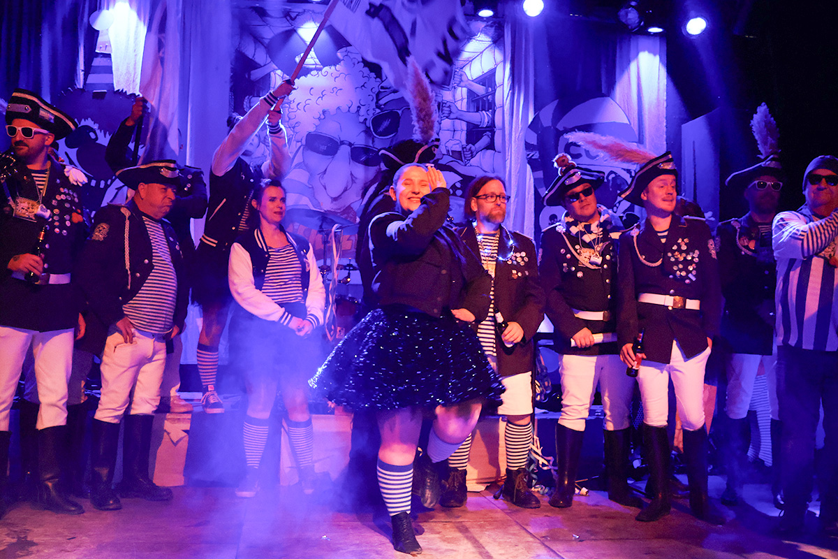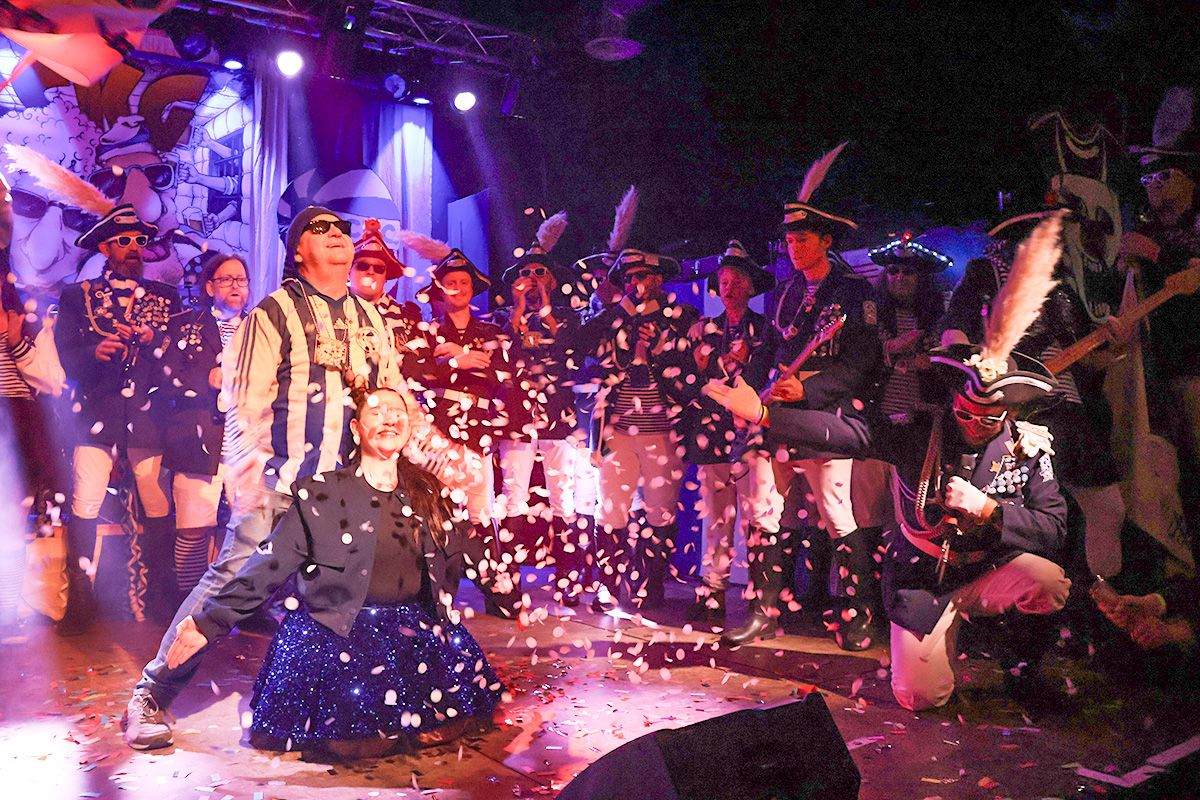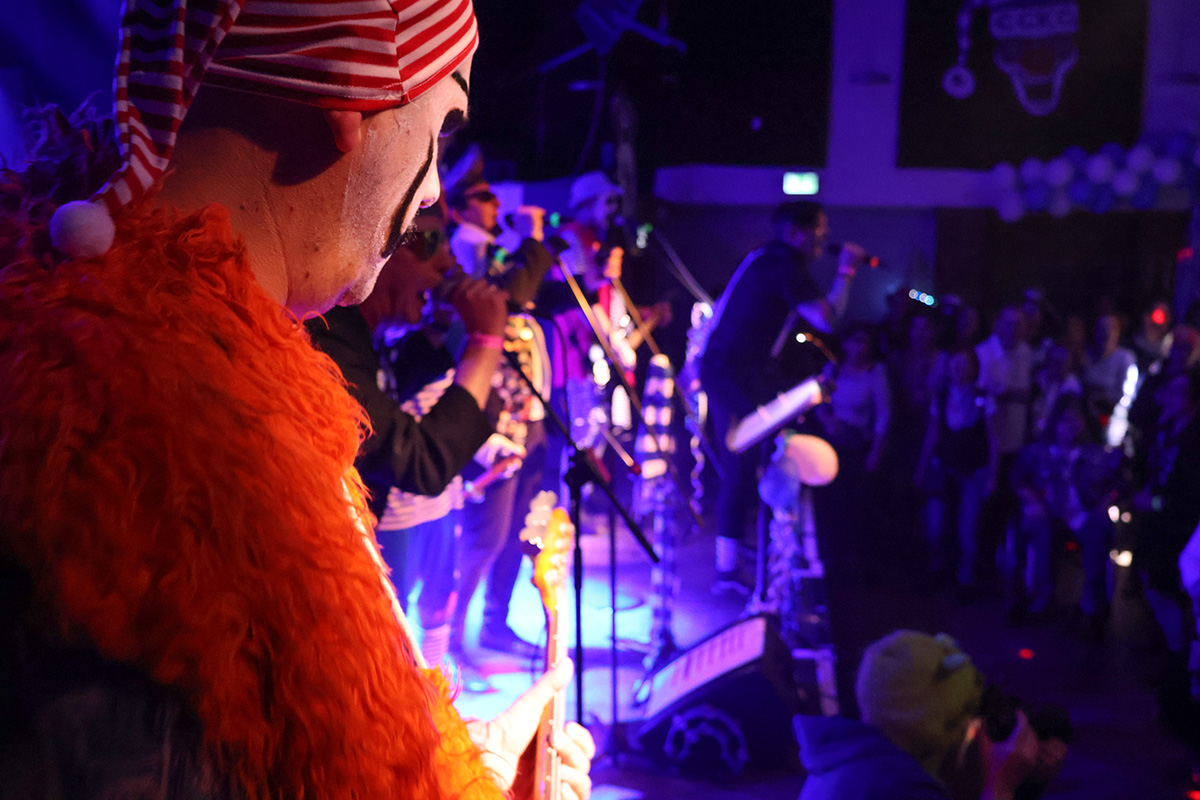 Nach 40 Jahren auf der Bühne zeigt sich aber auch: Personell wächst und ergänzt man sich – und das trotz Doppelbesetzungen. Wenige Musiker verbrachten den Abend durchgängig auf derselben Position, es wurde etwa munter zwischen der Hauptband Les 6 Kölsch 1 Cola und der Band der Prinzengarde getauscht. Und selbst das Dreigestirn sprang zwischenzeitlich musikalisch ein. Dass Prinz Ole (Schlüter) I. dabei auch vielfach in Liedern wie „Prinz Prinz“ am Bass eingesetzt wurde, war ein nettes Schmankerl, das sich durch den Abend zog.