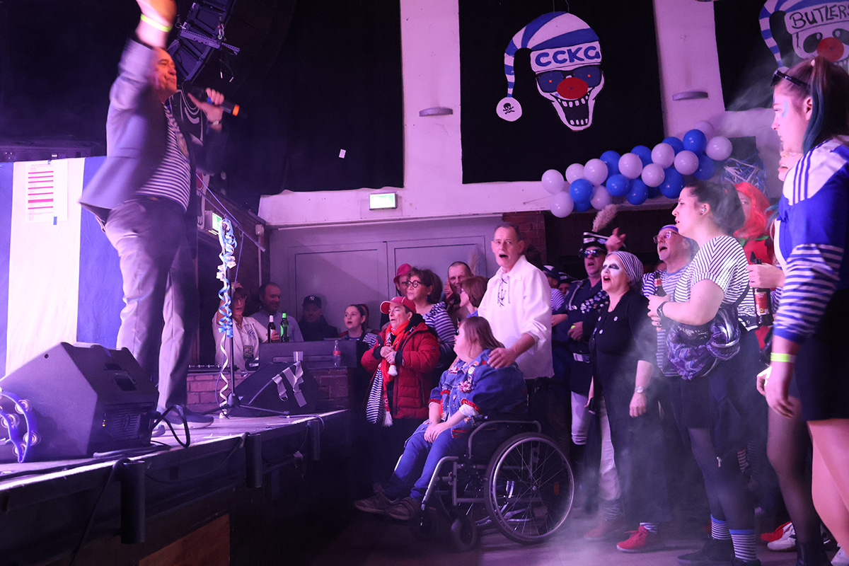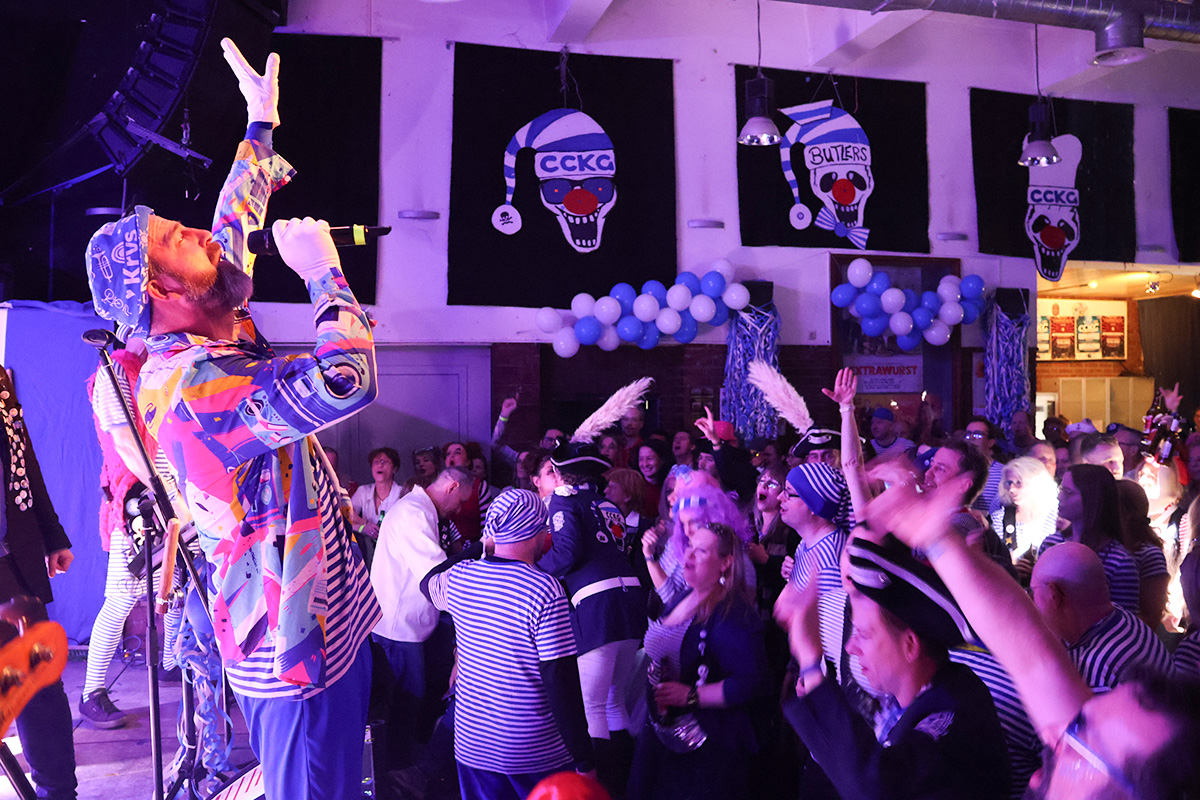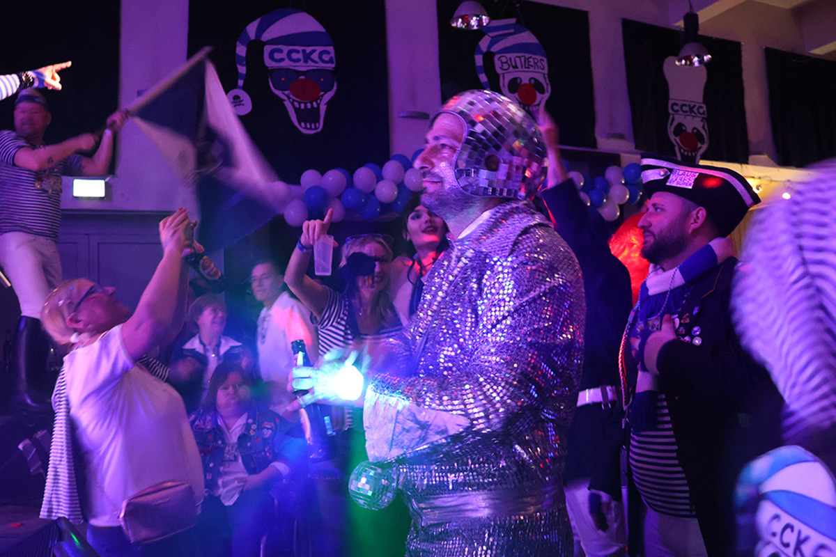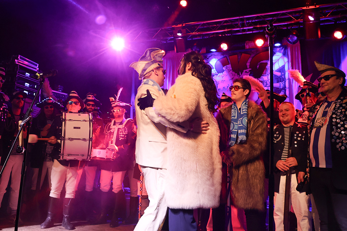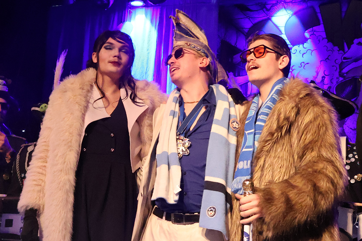 Insgesamt gilt: Die Liebe zum Verein war allenthalben spürbar. Bei den ausgewählten Erkennungsliedern des Dreigestirns glänzten Prinz und Deftigkeit (Denis) Etzkorn I. mit Hymnen darüber, Prinz der CCKG zu sein und etwa in der KuBa-Kneipe zu feiern. Heraus stach dabei Jungfrau Patricia I. (Pasqual Werth) mit der Italo-Ballade „Felicità“. Doch auch der Auftritt der Bühnen-Butler bekannte sich mit „Blau, blau, blau ist eine geile Farbe“ und zeigte sich – wie schon in vergangenen Jahren mit „Kein Kölsch für Nazis“ – politisch: „F_ck die AfD“ und „Die CCKG lassen keine Nazis rein“ waren Teil des Zugabentextes. Fast wie nebenbei meisterte Fatima Abdellaoui in zwei Prüfungsteilen ihre „Butler-Prüfung“, bestehend aus Testfragen und einer Aufgabe, und wurde vom Publikum somit als Dienstjüngste offiziell aufgenommen. Vizepräsident Mock schloss den Programmpunkt mit „Du darfst demnächst in die Meisterschule gehen. Die kostet ein Heidengeld und dauert ewig, aber egal.“ Man merkt: Bei der CCKG ist es trotz allem auf der Bühne gewohnt locker im Umgang geblieben. Ebenso ein neues Gesicht im Amt: Dottore Bob, dereinst selbst Butler, dann als Bühnenarzt im Einsatz, übernahm in der Session 2026/27 die Zeremonienmeisterei.