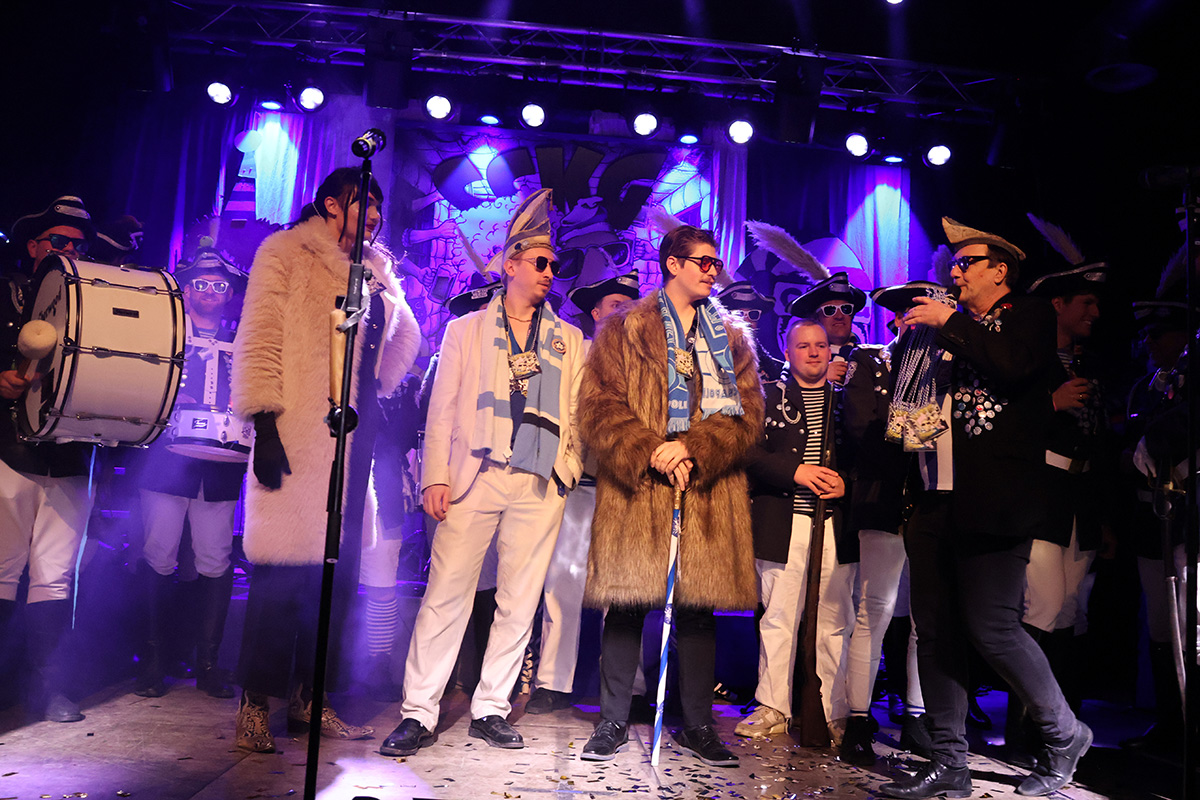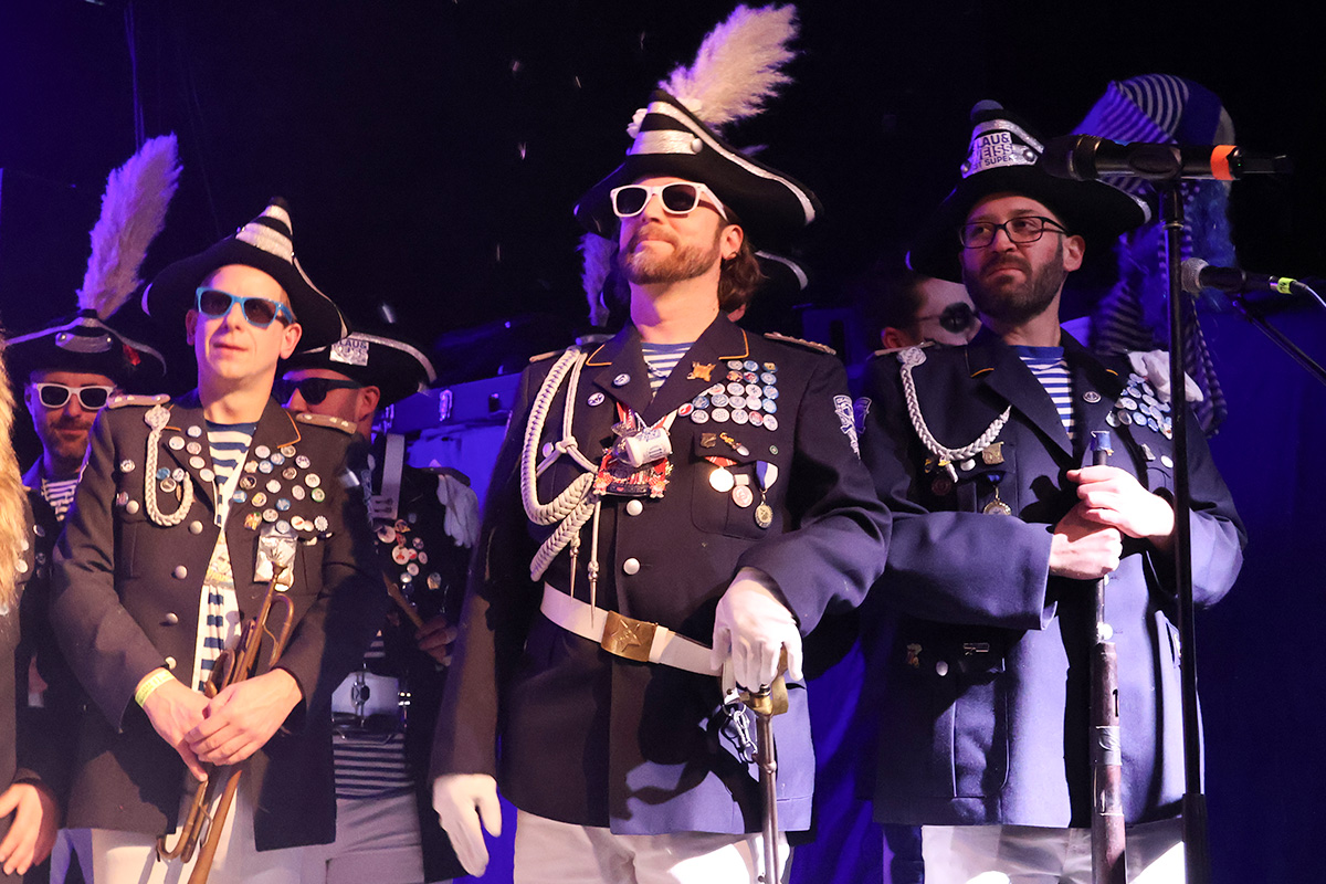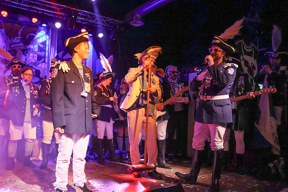 Eine weitere Amtseinführung gab es beim Auftritt der Prinzengarde. Hauptmann Hacky Hackhausen übergab Garde-Mitglied Jona Windels, als einzigem unter 18-jährigem Gardisten, die Aufgabe des Hauptmanns der jungen Garde. Er habe schließlich schon einen Hauptmann-Geburtstag, begründete Hackhausen die Ehrerweisung und verwies auf seinen eigenen. Die Garde spielte in diesem Jahr zudem nicht nur „Alaaf’man“ (unterstützt vom Tanzquintett „Die toten Funken“) auf, sondern brachte erneut ein neues Stück mit: Mit „Bitte nur ein’n Korn“ unter dem Pseudonym „Wir sind Garde“ – auf Grundlage von „Nur ein Wort“ von Wir Sind Helden – brachten sie Stimmung in den KuBa.