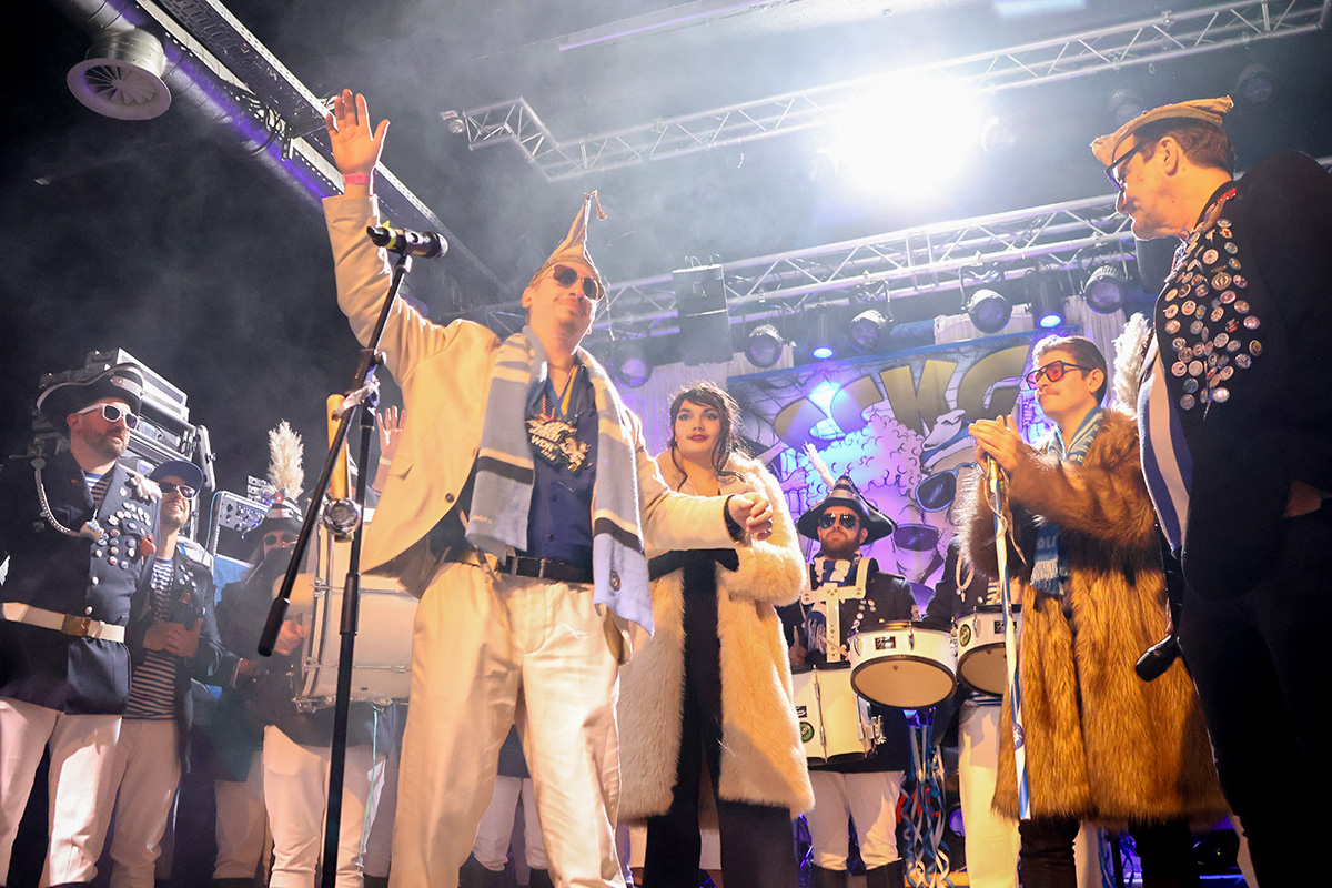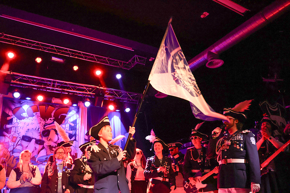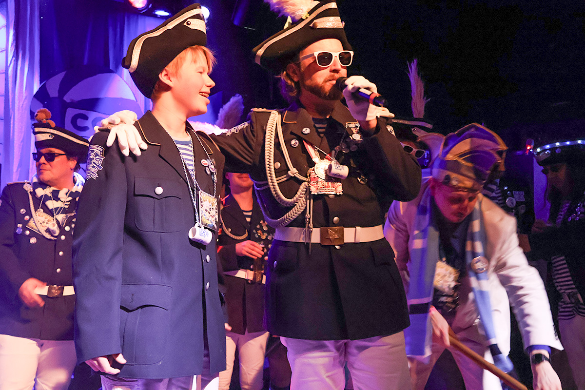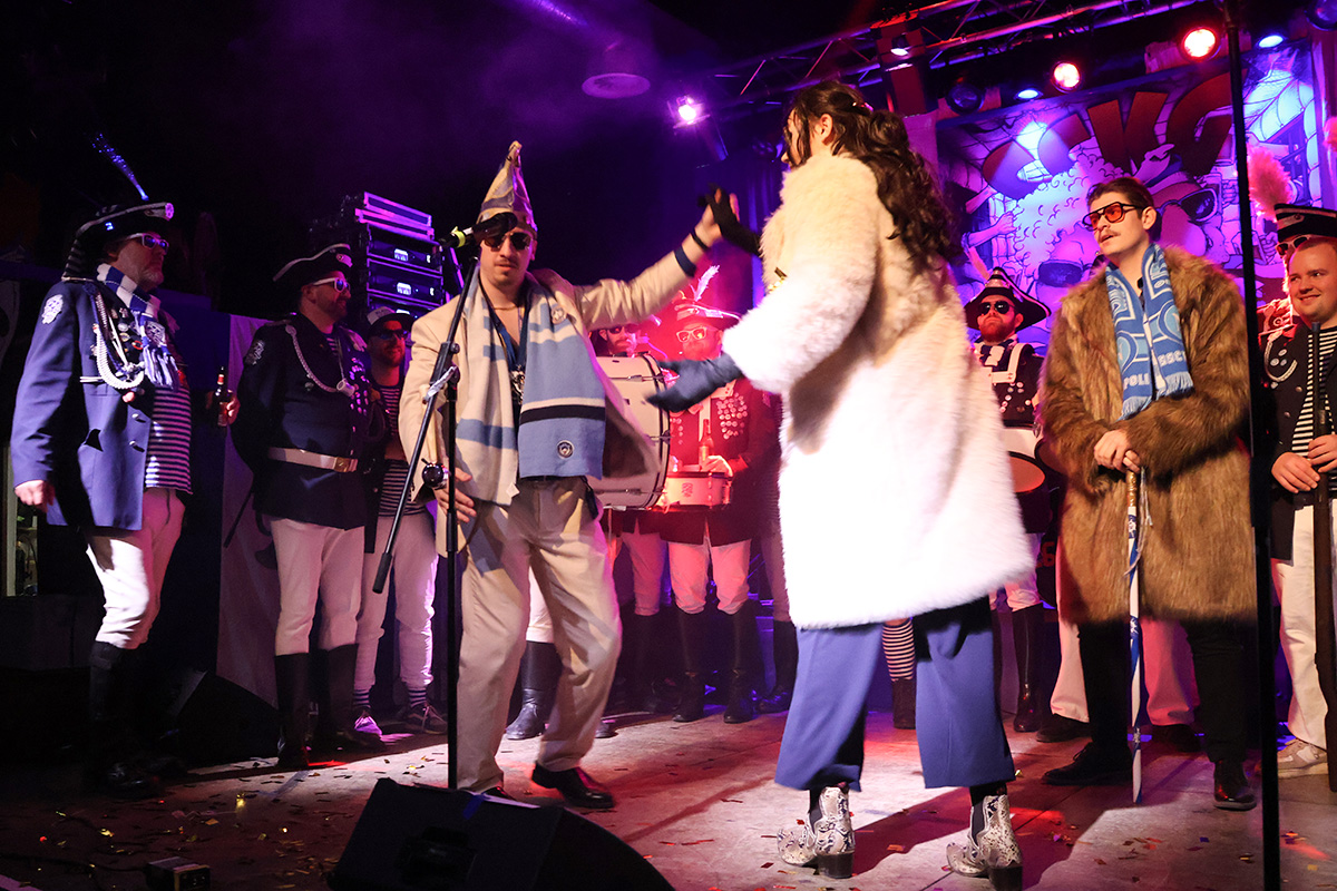 Eine weitere Amtseinführung gab es beim Auftritt der Prinzengarde. Hauptmann Hacky Hackhausen übergab Garde-Mitglied Jona Windels, als einzigem unter 18-jährigem Gardisten, die Aufgabe des Hauptmanns der jungen Garde. Er habe schließlich schon einen Hauptmann-Geburtstag, begründete Hackhausen die Ehrerweisung und verwies auf seinen eigenen. Die Garde spielte in diesem Jahr zudem nicht nur „Alaaf’man“ (unterstützt vom Tanzquintett „Die toten Funken“) auf, sondern brachte erneut ein neues Stück mit: Mit „Bitte nur ein’n Korn“ unter dem Pseudonym „Wir sind Garde“ – auf Grundlage von „Nur ein Wort“ von Wir Sind Helden – brachten sie Stimmung in den KuBa.