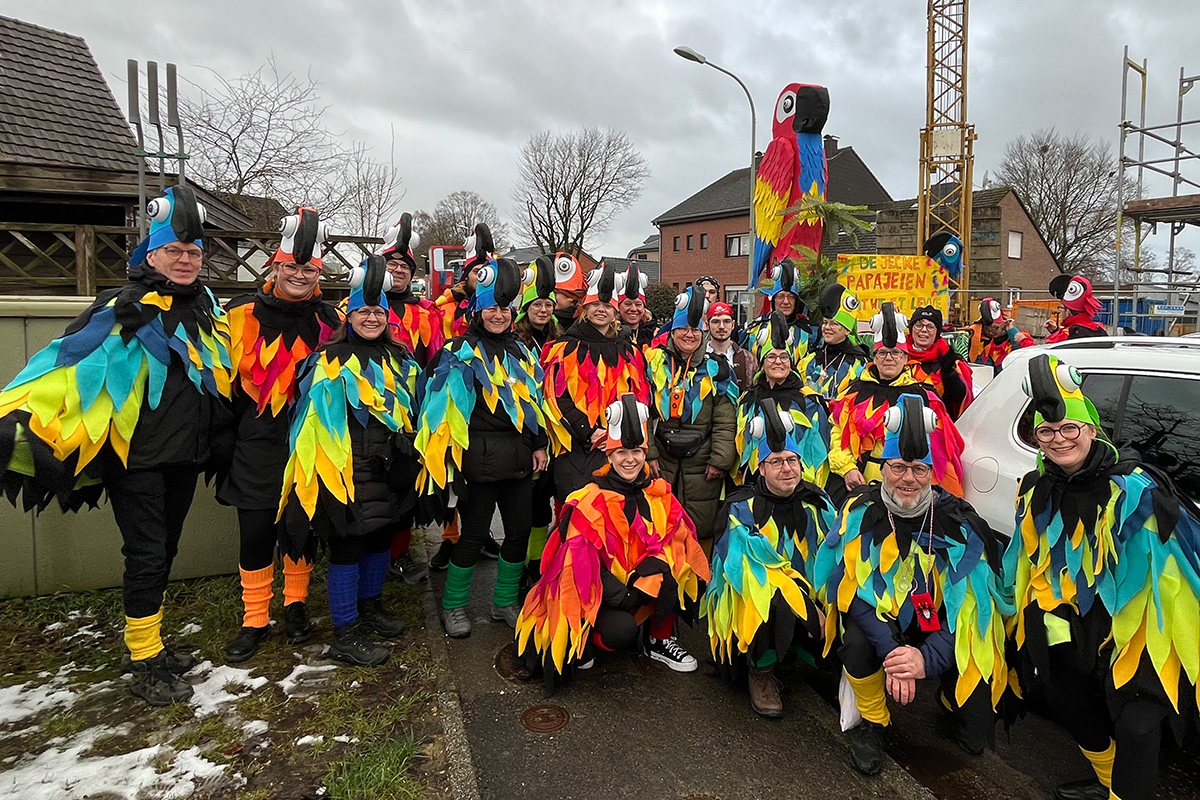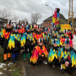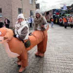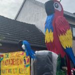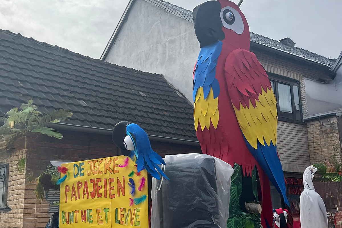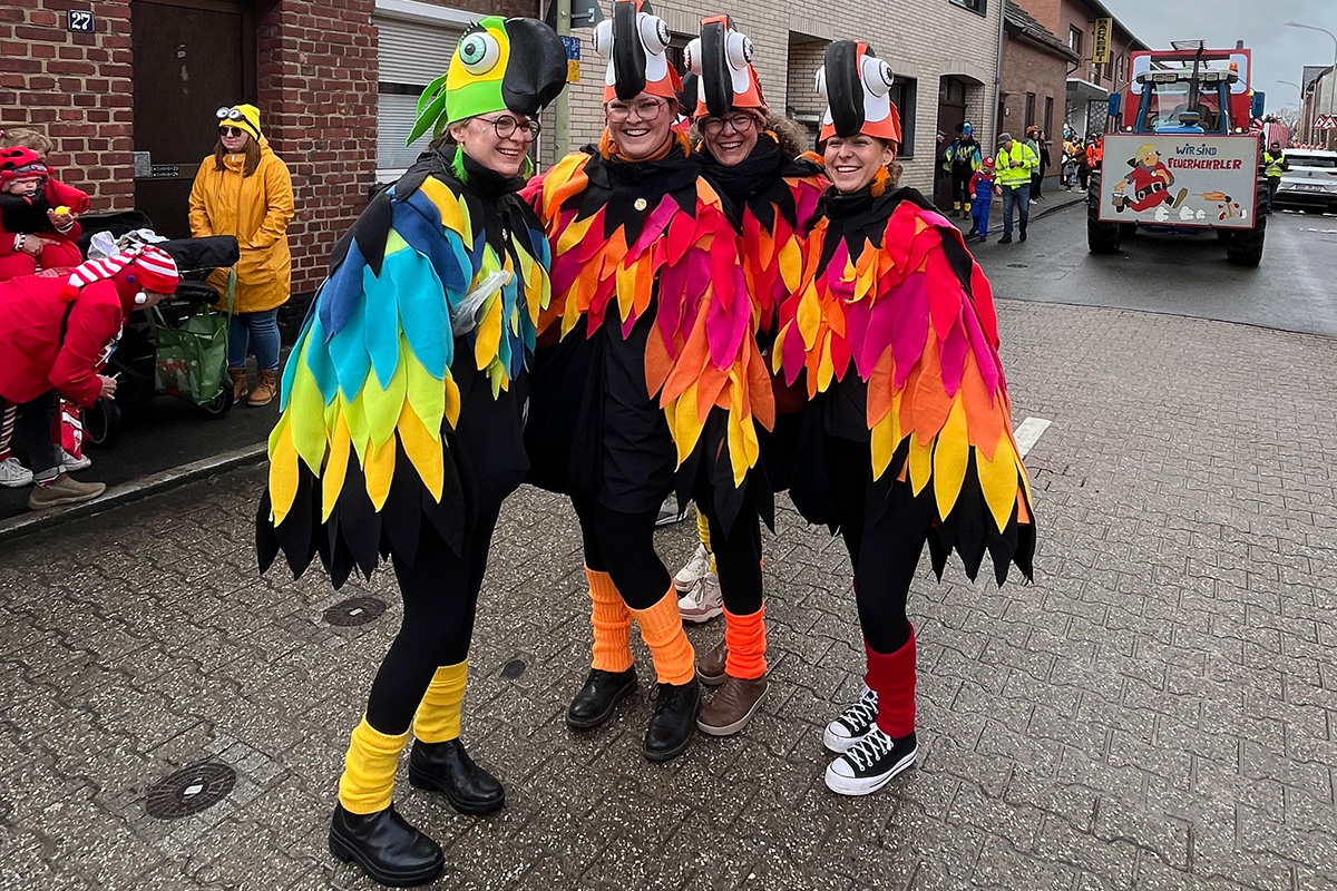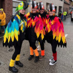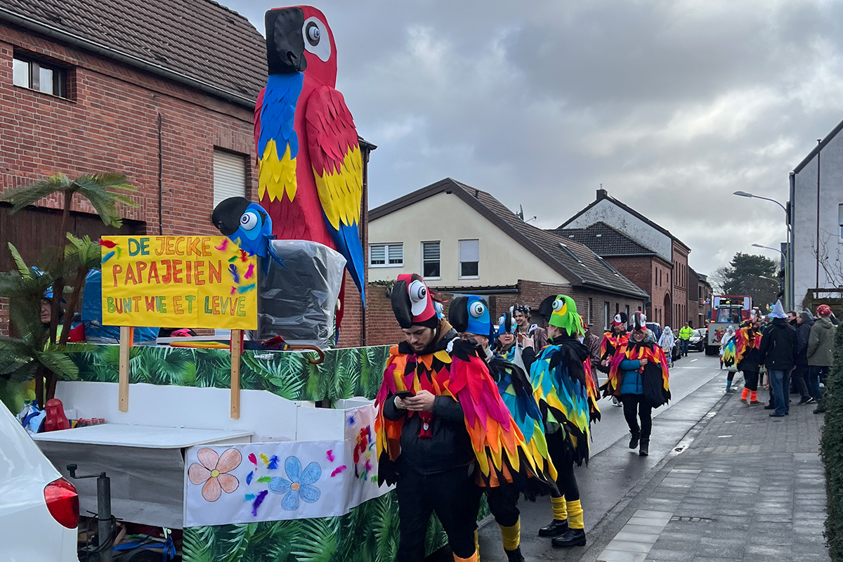 Gleichsam der trüben Kulisse zum Trotze haben sich die Wagen und Fußgruppen im Doppeldorf in besonders farbenfrohe Gewänder geworfen – vor allem die große Gruppe Papageien, die durch den Zoch „flog“, sorgte für ein buntes Spektakel.