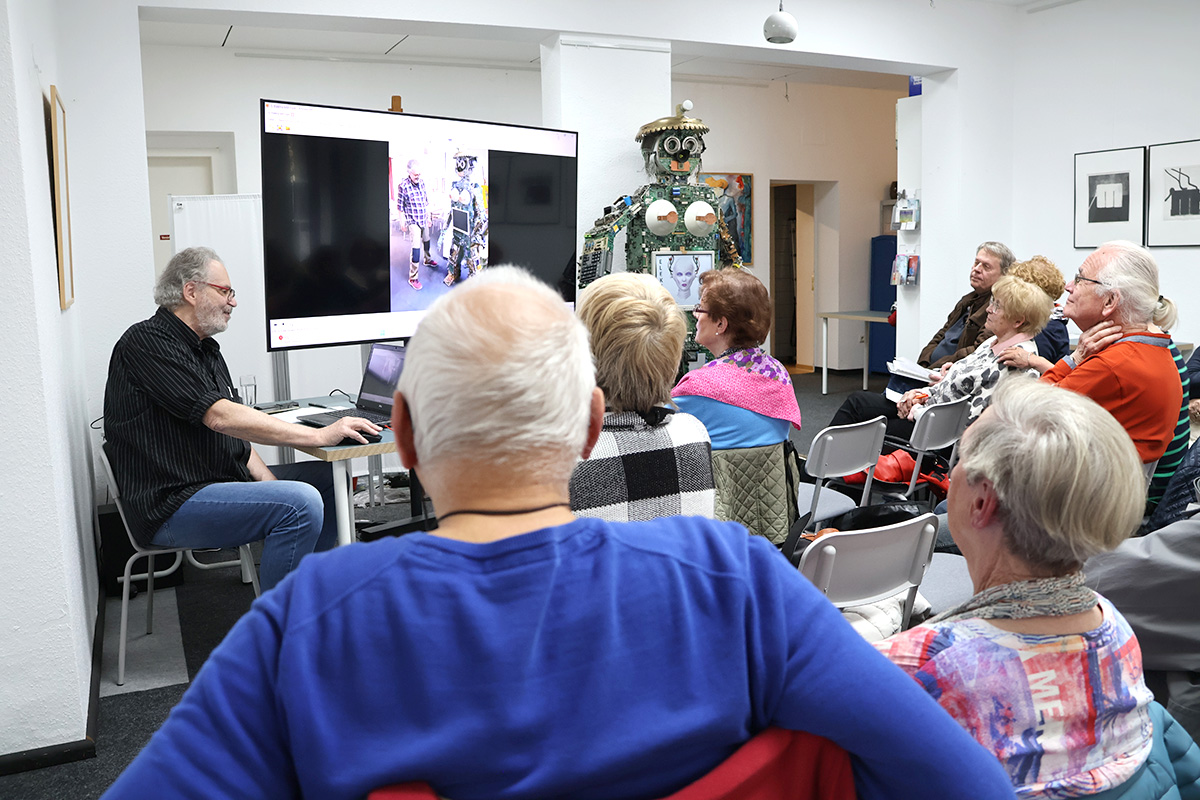 Malß erzählte von KI als seiner Software, um den Überblick nicht zu verlieren. Er verwende mittlerweile fast täglich KI, etwa für die Frage, wie man Ausstellungen attraktiver machen könne. Dazu kam ein Crashkurs über die Funktionsweise von KI, aber auch über künstlerische Möglichkeiten, welche Websites man dafür verwenden kann sowie Hinweise darauf, welche Risiken die künstliche Intelligenz bietet und wie man kritisch mit den Tools umgeht.
