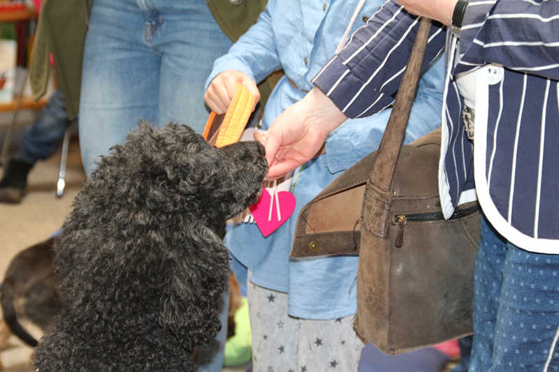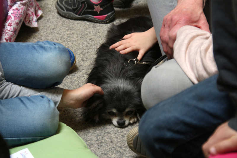 „Tiere öffnen das Tor zur Seele und können uns immer wieder berühren, was auch für die Kinder so wichtig ist in unserer verkopften Welt“, ist Josefine Heckhausen-Reinartz überzeugt und nahm sich als Vorsitzende zu diesem Anlass mit ihren Vereinskolleginnen Zeit für diesen ungewöhnlichen Termin. „Lesen oder Vorlesen wird auch immer weniger praktiziert, beziehungsweise rücken andere Medien in den Vordergrund. Aber so mit allen Sinnen erleben und die Dinge begreifen ist ein ganzheitliches Lernen. Diese Eindrücke bleiben haften und verankern sich leichter in unseren Köpfen.“ Ob der kleine Pumba oder die große verspielte Paula , Buddy der Wuschelige, Bella die grosse schwarze Lockenpracht, Abby als Kampfschmuser, alle haben die Kinder begeistert und sie haben interessiert den Geschichten über die Hunde zugehört. Alle Hunde sind zertifiziert und arbeiten mit ihren Besitzern als Besucherteams in den Projekten des „Vereins Tiere als therapeutische Begleiter“.