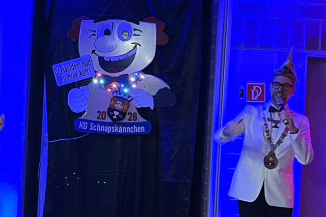 Der Orden zeigt ein stolz lächelndes Schnapskännchen zu sehen, das eine neue Präsidentenkette trägt. Er erzählt damit zum wiederholten Mal eine sehr persönliche Geschichte der Gesellschaft: Präsident Tom Beys hatte bei der Großen Kostümsitzung 2025 die von Goldschmiedemeister Ingo Telkmann geschaffene Präsidentenkette in Empfang nehmen dürfen. Diese wurde am Holzorden farbig beleuchtet – eine ganz besondere Arbeit von Bert Reinartz, der die Holzversion des Ordens gestaltet hat, berichten die Schnapskännchen mit Stolz.