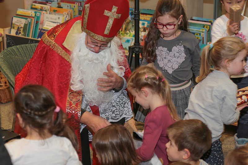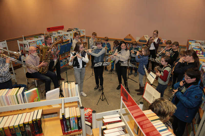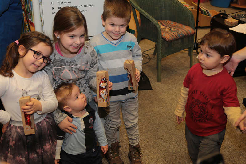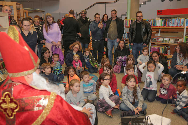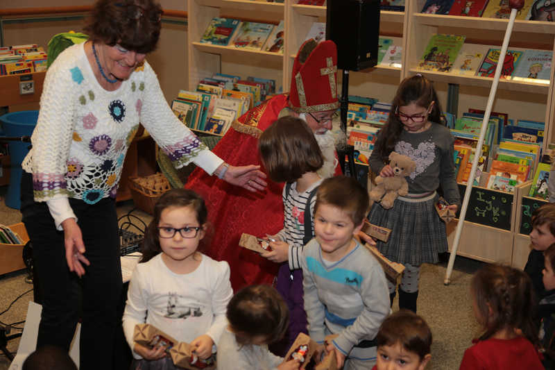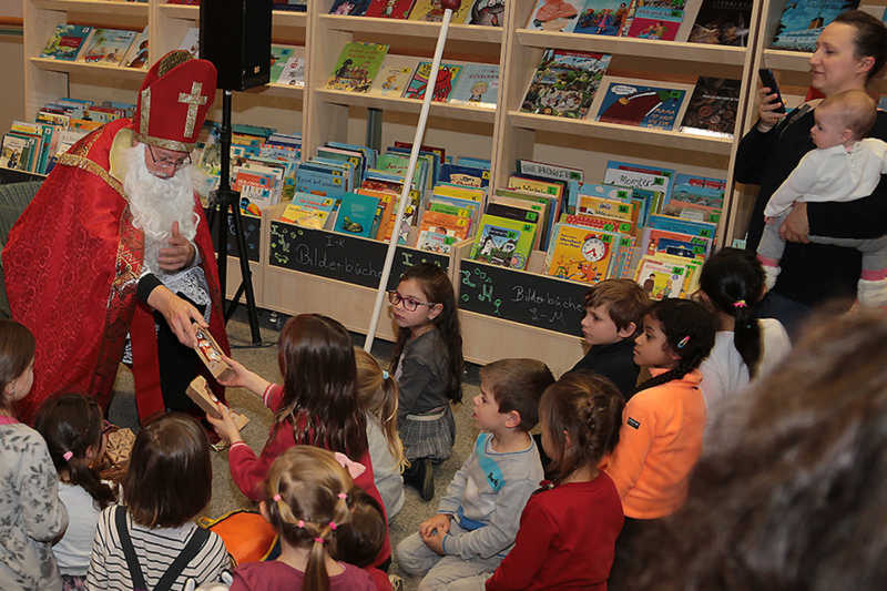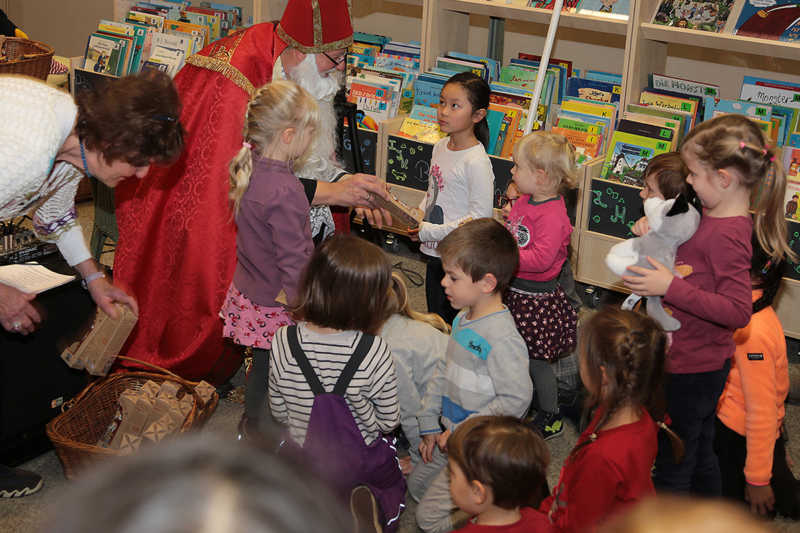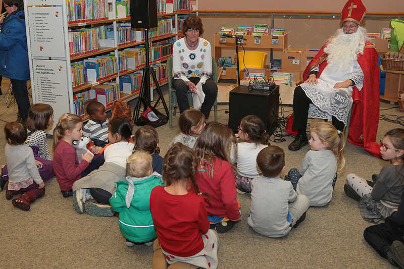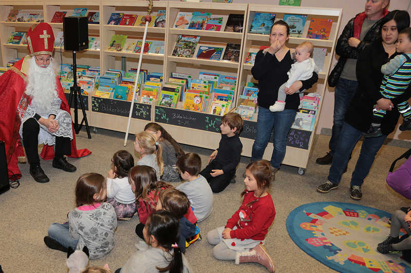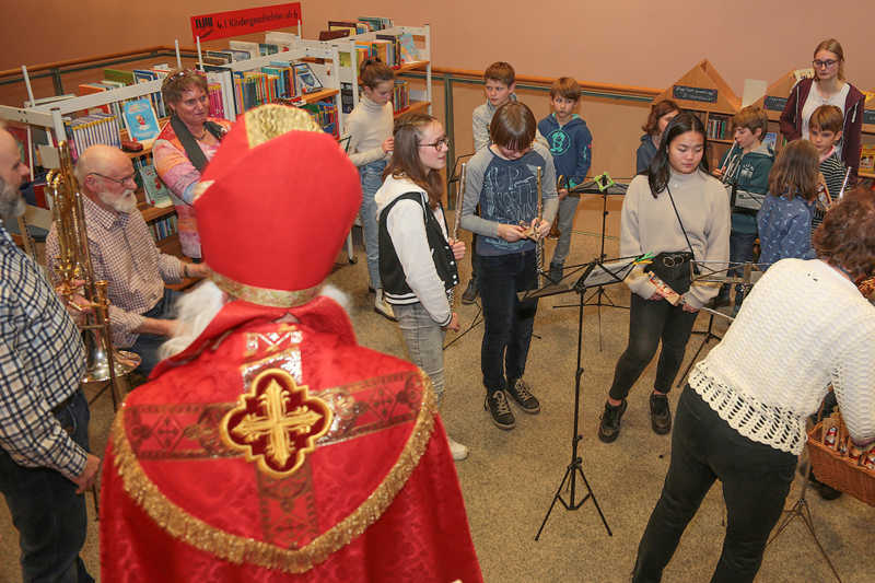 Beschenkt wurden persönlich vom Nikolaus sowohl die Kinder als auch die Mitglieder des Blasorchesters mit großen Schokoladennikoläusen. Im Lesecafé verwöhnten Mitglieder des Förderverein Stadtbücherei im Anschluss Kinder und Erwachsene mit heißem Kinderpunsch und leckeren Weihnachtsplätzchen.