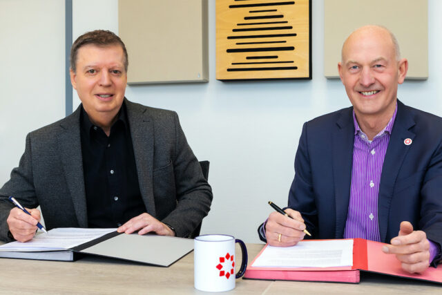 TZJ-Geschäftsführer Carlo Aretz und SWJ-Geschäftsführer Ulf Kamburg unterschreiben den Kaufvertrag für das Grundstück. Dort soll ein Batteriespeicher gebaut werden. Foto: Looping Media/Stadtwerke Jülich Foto: Looping Media/Stadtwerke Jülich