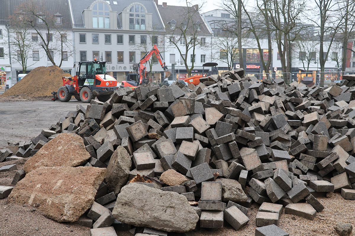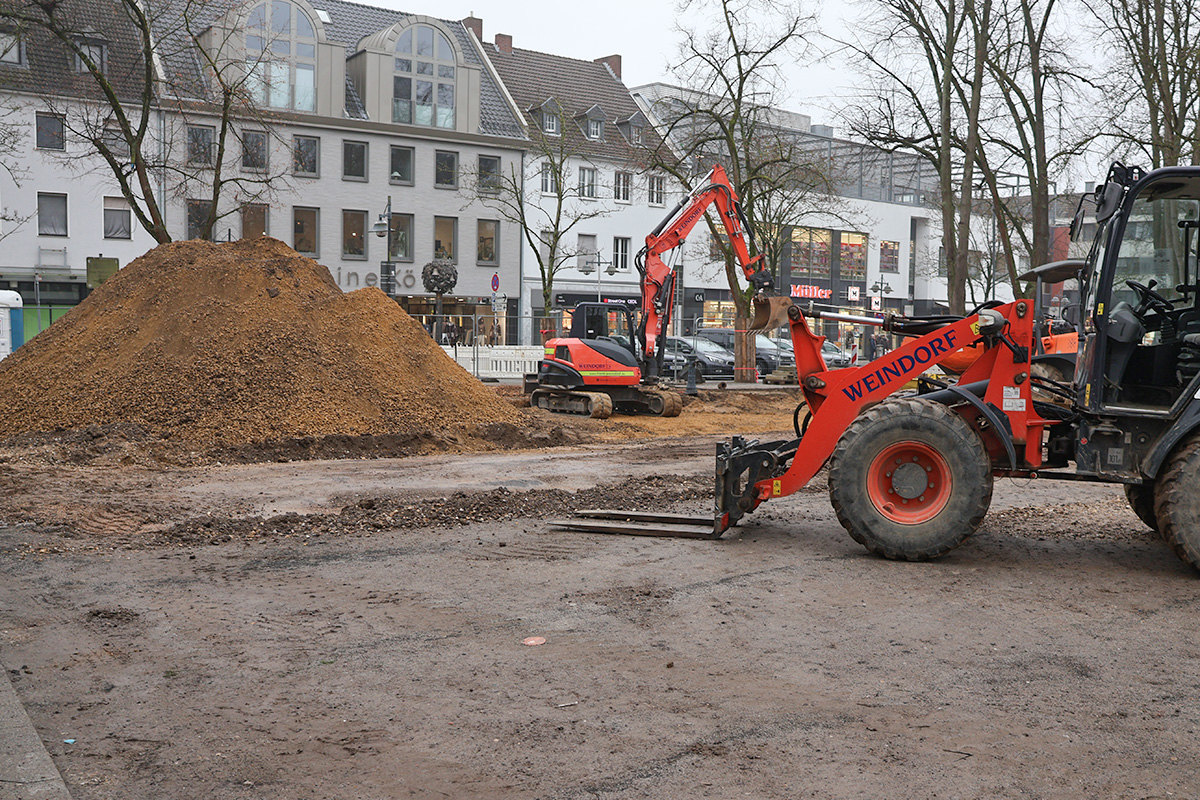 Ab Montag geht es tiefer – buchstäblich. Dann beginnen die Arbeiten für den Kanalanschluss an der Kölnstraße, anschließend wird der Entwässerungskanal für das Oberflächenwasser über den Platz hinweg verlegt. In denselben Graben kommen Strom, Glasfaser und weitere Versorgungsleitungen. Alles, was später gebraucht wird: für Veranstaltungen, für Buden beim Weinfest, für den Kunsthandwerkerinnen-Markt, für WLAN-Hotspots, die künftig über die Lampen laufen sollen.