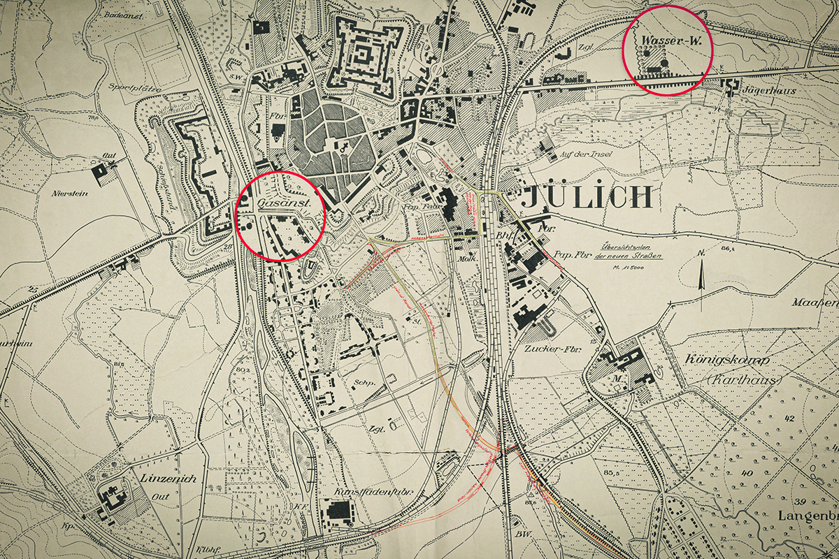 Ein Blick zurück: Eine städtische Gasanstalt gab es in Jülich schon seit 1869, also noch weit vor 1911. Diese Anstalt befand sich am heutigen Standort der Stadtwerke an der Straße An der Vogelstange. Für eine Stadt mit der Größenordnung Jülichs war der Bau damals durchaus eine Besonderheit. Der Ort hatte um die 4500 Einwohner. Zwar entstanden zu der Zeit sehr viele städtische Gasanstalten im damaligen Preußen, die meisten davon aber eher in größeren Städten.