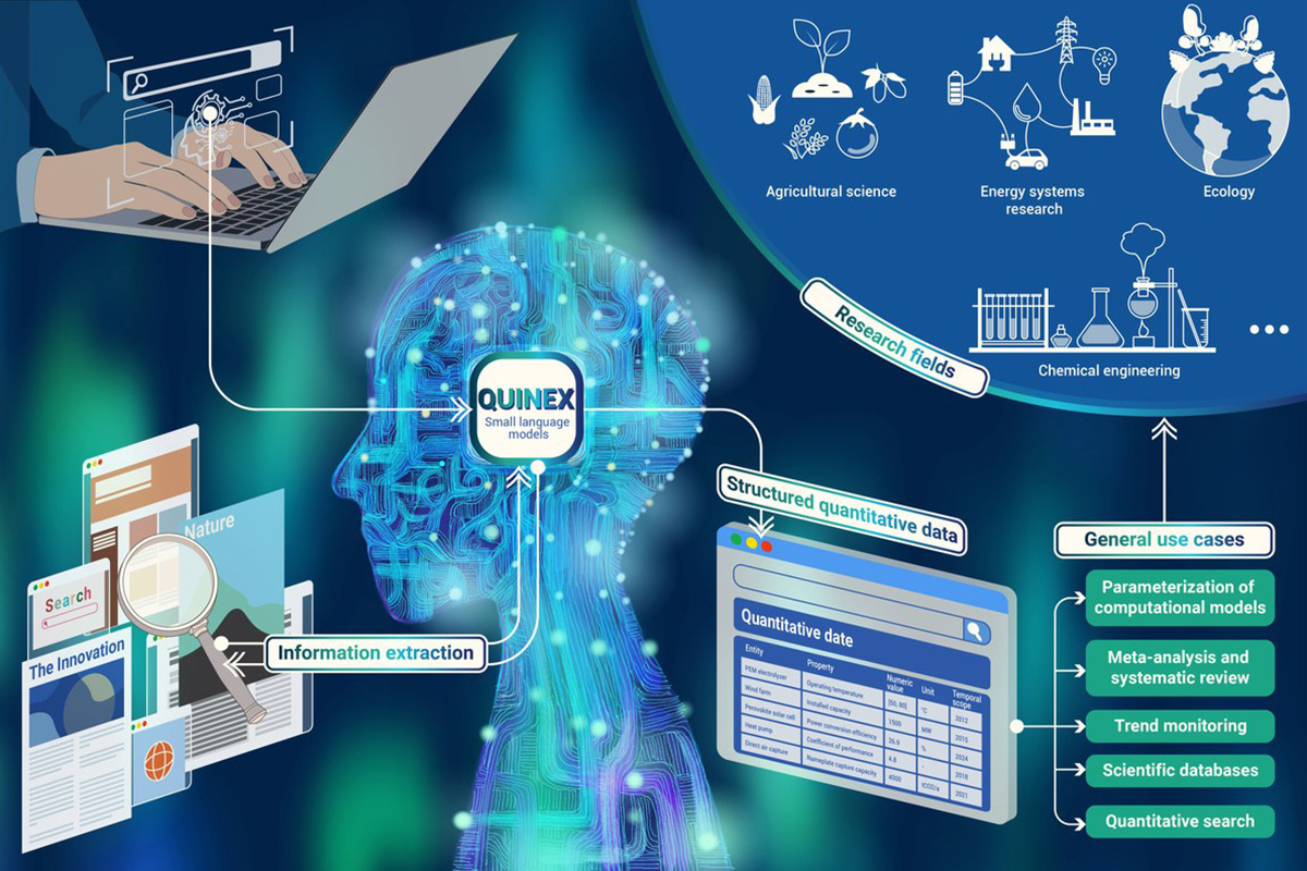 Das von Jülicher Systemforschenden entwickelte Framework Quinex („Quantitative Information Extraction“) basiert auf Sprachmodellen und automatisiert diesen Prozess: Die Künstliche Intelligenz identifiziert Zahlenwerte, ordnet sie passenden Einheiten zu und erkennt, was gemessen wurde, wann, wo und wie. So wird aus einem Satz wie „Für 2025 werden Wirkungsgrade von 63 bis 71 Prozent angenommen“ ein strukturierter Datensatz mit allen relevanten Kontextinformationen – vom Jahr über die Messmethode bis zur Quelle.