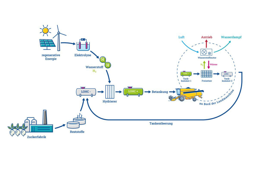 „Das Rheinische Revier ist für die Demonstration solcher Technologiekonzepte prädestiniert. Hier gibt es reichlich biologische Reststoffe, Windräder und Photovoltaik-Anlagen. Landwirte können mit dem grünen Strom Elektrolyseure betreiben, den Wasserstoff auf den biogenen Träger laden und damit ihre Traktoren und Maschinen antreiben“, erklärt Peter Wasserscheid.