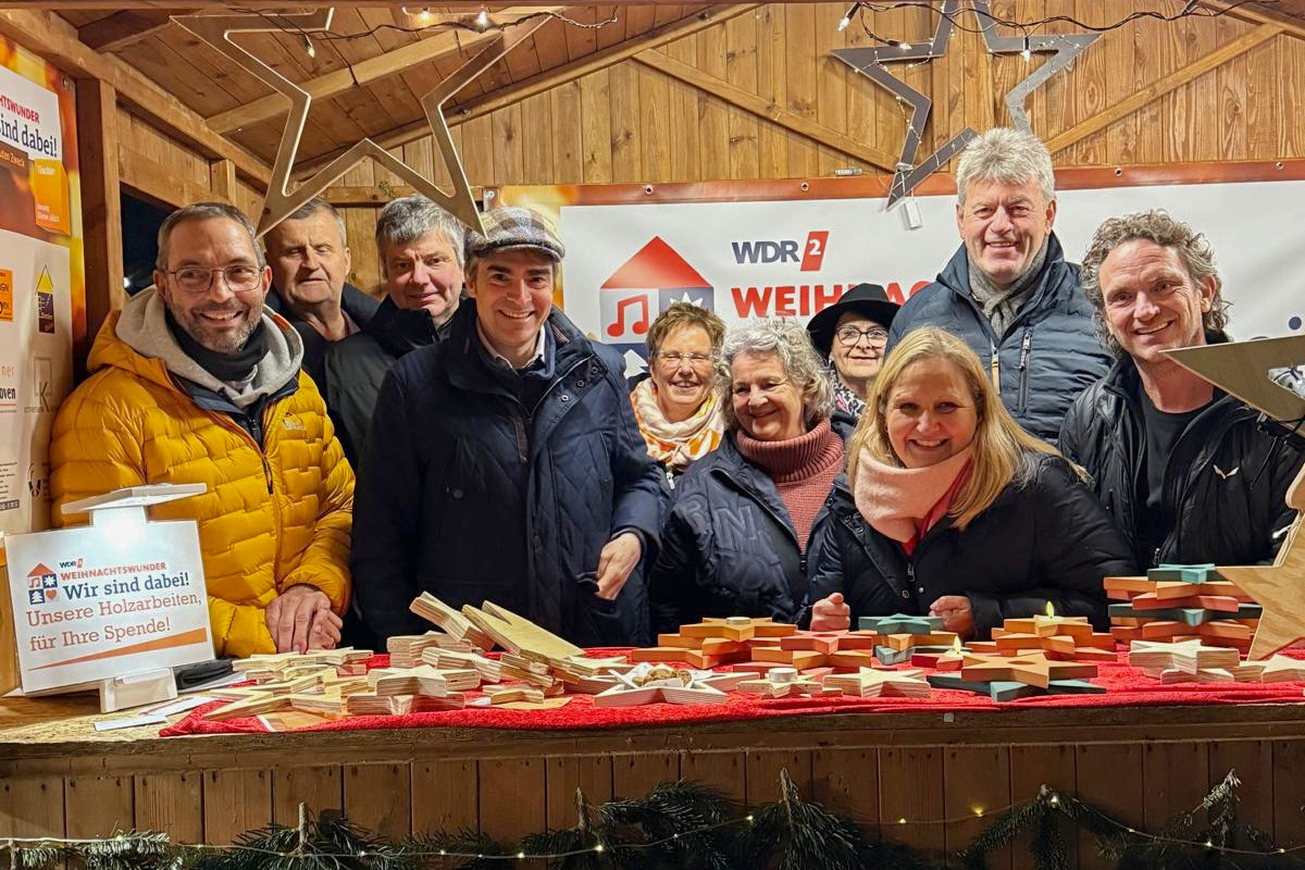 Zwei Wochen lang war die Tischler-Innung Düren-Jülich auf dem romantischen Weihnachtsmarkt am Schloss Merode präsent – und erlebte dort ihr eigenes Weihnachtswunder. Mit viel Herzblut und ehrenamtlichem Einsatz sammelten die Tischlerinnen und Tischler aus der Region Düren-Jülich gemeinsam eine Spendensumme von unglaublichen 16.200,52 Euro für das WDR2-Weihnachtswunder.