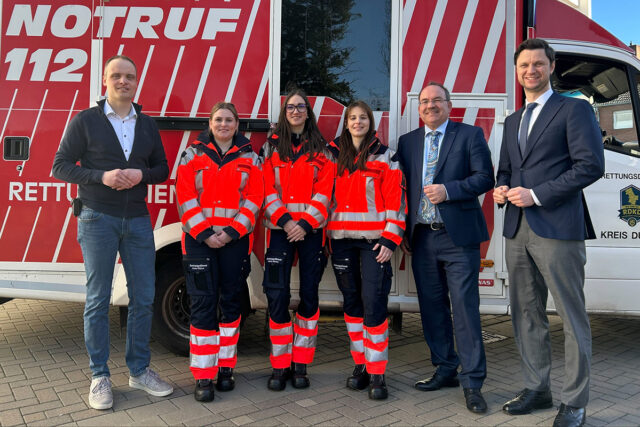 Der Notfallsanitäter ist die höchste nichtärztliche Qualifizierung im Rettungsdienst. Ausgebildet werden die drei Frauen sowohl in den Rettungswachen vor Ort, in den Kliniken als auch im NOBIZ, dem Notfallbildungszentrum Eifel-Rur gGmbH, am Campus in Stockheim. Für andere da sein, helfen, etwas bewirken und eine hohe Verantwortung tragen – das sind einwandfrei die Gründe, weshalb sich die drei neuen Auszubildenden für diesen beruflichen Werdegang entschieden haben. Und sie müssen ihn nicht alleine gehen. An ihrer Seite sind Robert Engels, Leiter des Einsatzdienstes, sowie sein Stellvertreter Guido Kühler, Michael Wimberger, leitender Praxisanleiter, sein Stellvertreter Thomas Wagner und Andrea Holz, RDKD-Verwaltungsleitung. „Es gibt wenige Jobs, in denen man Leben retten kann. Diese Ausbildung ist ein gutes Rüstzeug, von dem Sie in Ihrem Berufsleben immer profitieren werden“, sagte Kreisdirektor Dr. Martin Stiller.