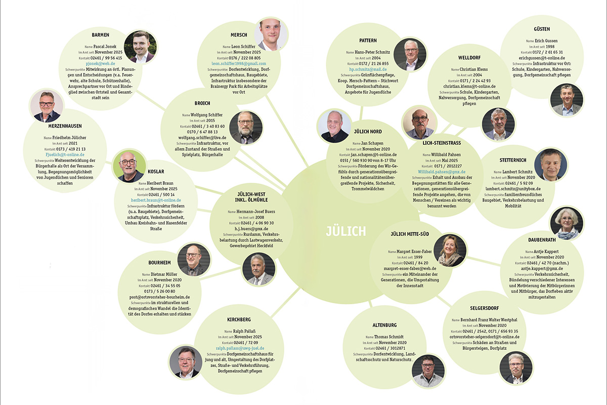 … ein Ortsvorsteher? In der Stadt Jülich sind 3 Ortsvorsteher in der Innenstadt und 15 in den Stadtteilen im Einsatz. Sie sind Ehrenbeamte, die vom Bürgermeister beauftragt sind, und für die Menschen die ersten Ansprechpartner vor Ort. Sie werden vom Stadtrat gewählt. Die Amtszeit ist an die Dauer der Wahlzeit des Rates gebunden. Für die jetzigen Amtsträgerinnen und -träger hat sie entsprechend im November 2025 begonnen.