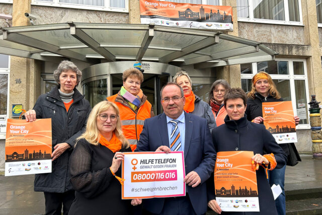 Rückhalt erhielten sie dabei von Landrat Dr. Ralf Nolten: „Es ist wichtig, dass wir die Thematik ,Gewalt gegen Frauen‘ ins Bewusstsein rufen. Die Zahlen sind immer noch erschreckend hoch, daher brauchen wir viele, die sich solidarisieren und das Signal schicken. Wir müssen darüber sprechen und es transparent machen, damit diese Mechanismen in den Familien gebrochen werden.“ Seine Worte unterstreichen den Ernst und die Dringlichkeit des Anliegens.