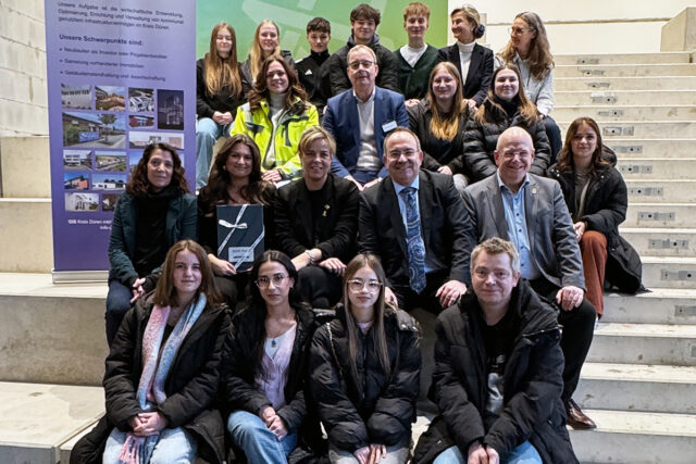 Mona Neubaur, Ministerin für Wirtschaft, Industrie, Klimaschutz und Energie des Landes Nordrhein-Westfalen, unterstrich die landesweite Bedeutung des Projektes, das sowohl die Bildungslandschaft als auch die nachhaltige Strukturentwicklung und Wirtschaft stärke: „Zukunft entsteht hier – mitten in Düren. Mit Unterstützung der EU schaffen wir einen modernen Lernort, der jungen Menschen Chancen gibt, Fachkräfte ausbildet und unserer Region neue Stärke verleiht. Das Nelly-Pütz-Berufskolleg steht für zeitgemäße Bildung, nachhaltiges Bauen und den Wandel im Rheinischen Revier. Sonnenenergie, Wärmepumpen und moderne Lernräume zeigen: Wir denken heute schon an morgen. Diese Investition lohnt sich – für die Schülerinnen und Schüler, für die Wirtschaft und für die Zukunft unserer Heimat.“ Im Gespräch mit Schülersprecherin Maria-Briana Moldovanu beantwortete die Ministerin Fragen über die Entwicklung und Wichtigkeit derartiger Investitionen und Förderungen.