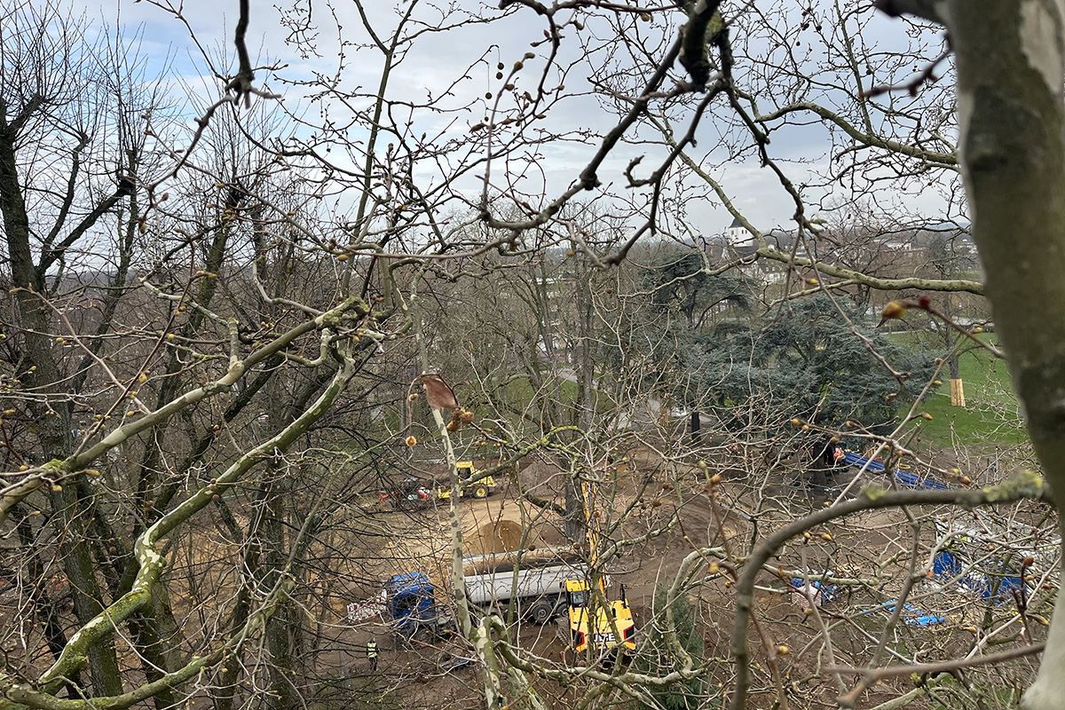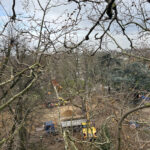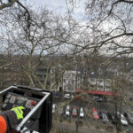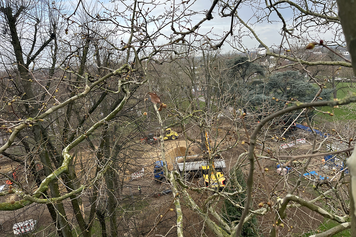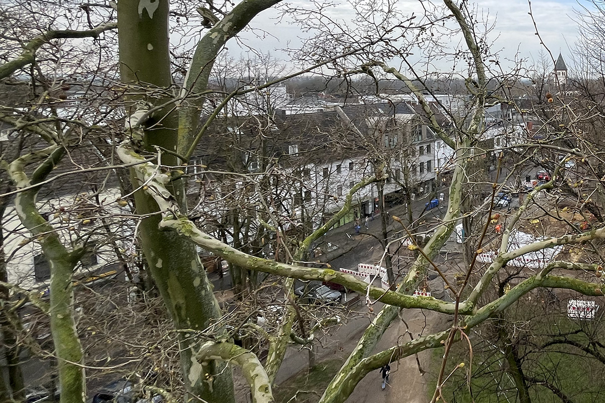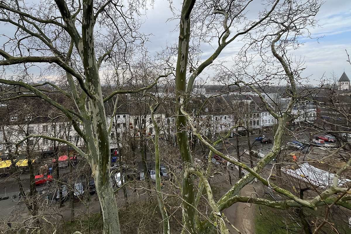 Am gestrigen Montag und heutigen Dienstag geht es für die Baumpfleger 23 Meter hoch, zwischen die Äste des Jülicher Schlossplatzes.