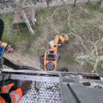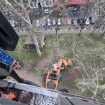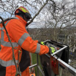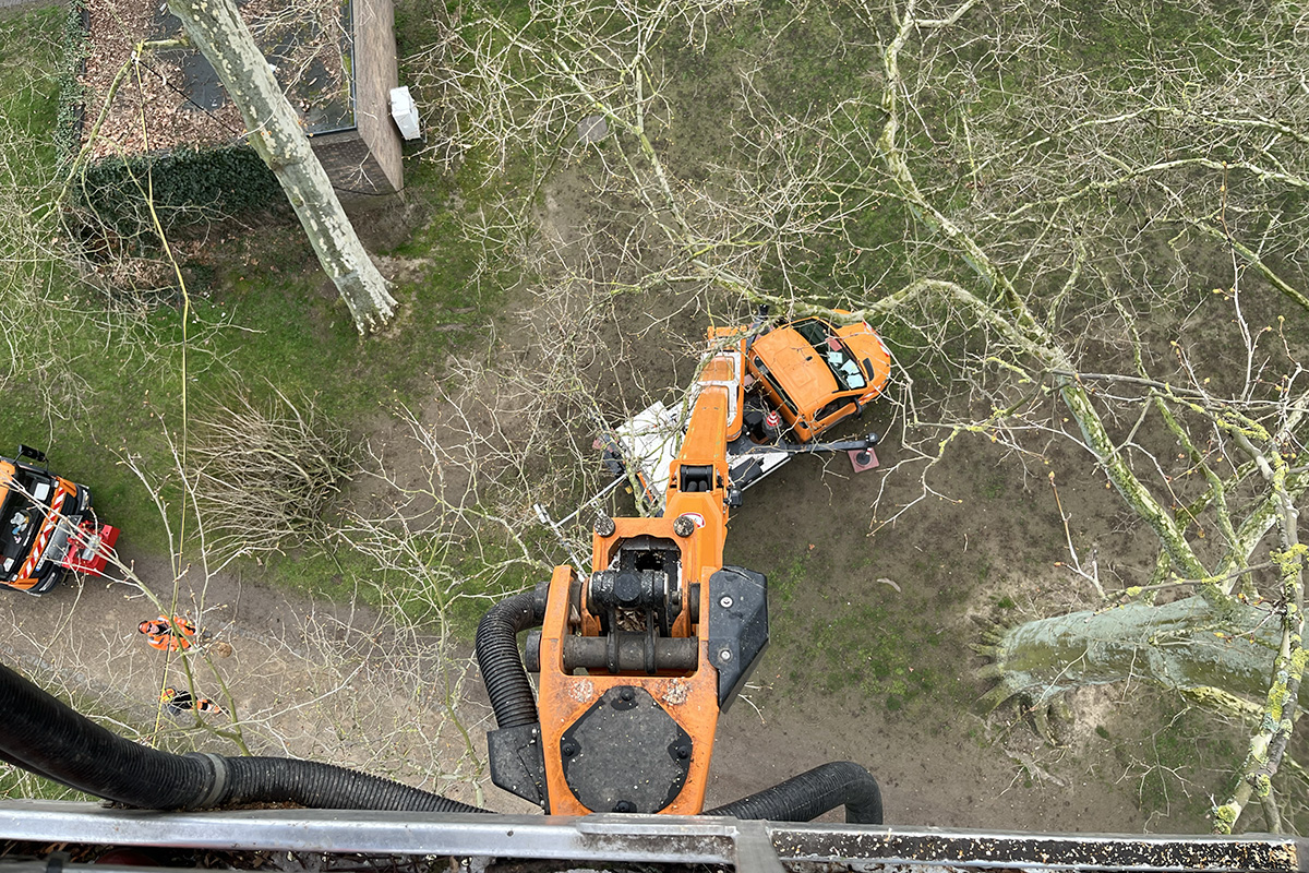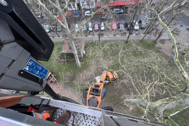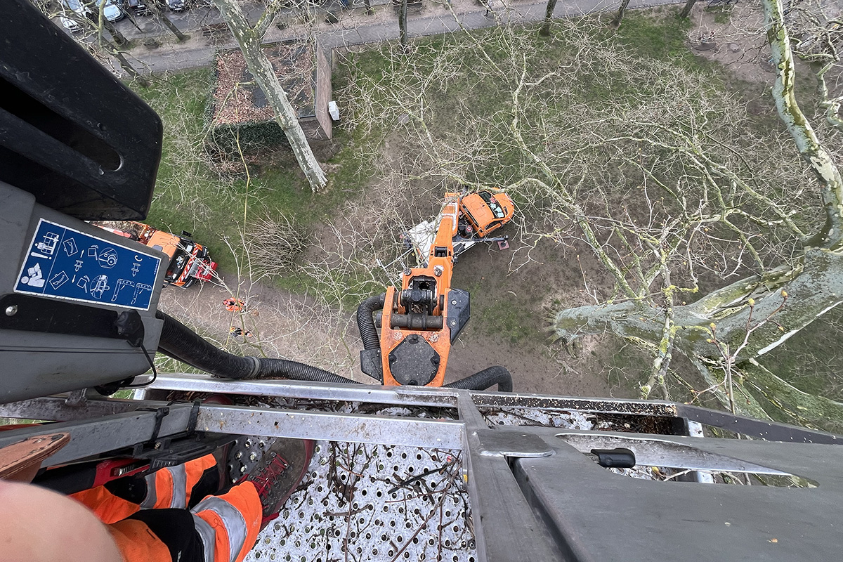 Der Steiger oder fachsprachlich die Hubarbeitsbühne wird von dem Mitarbeiter gesteuert, der damit hoch in die Bäume fährt und sich durch die Zweige manövriert. Durchaus fordert diese Aufgabe Erfahrung und Nerven.
