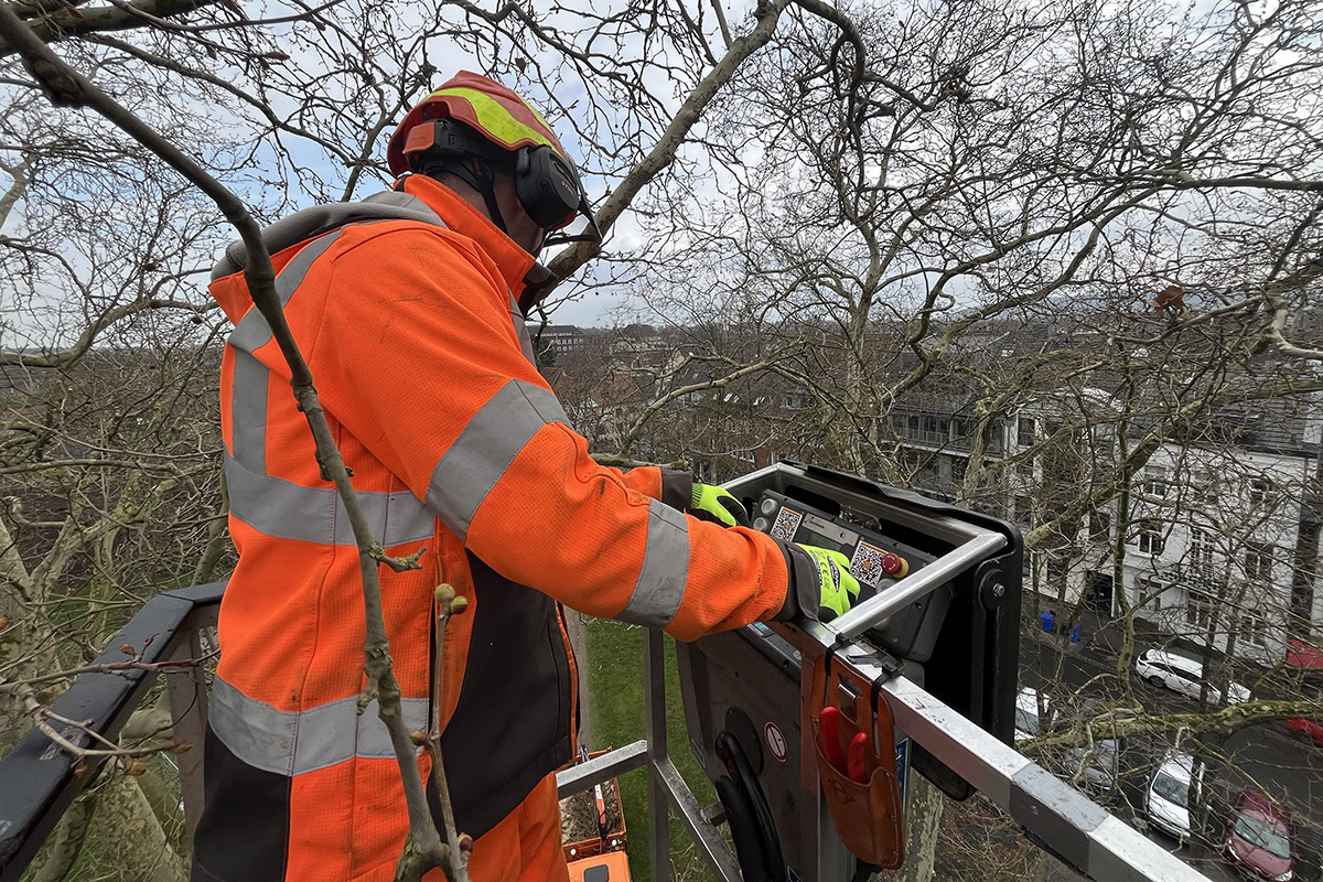 Marcel Krings erklärt, dass die Intention dabei ist, die toten Äste der Bäume abzuschneiden und schädlichen Pilzen entgegenzuwirken. Mit gegebenen Werkzeugen können weitere vier Meter Höhe erreicht werden, um den Schlossplatz verkehrssicher zu halten.