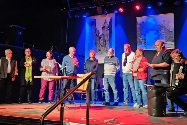 Nach der kurzen Unterbrechung übernahmen die Mundartfreunde aus Kirchberg mit einem Sketch das Zepter. Die lebhaften Dialoge „op Platt“ im Supermarkt ließen die Gäste Tränen lachen. Der zweite Teil des Abends stand unter einem vorweihnachtlichen Stern und begann erneut musikalisch. Schorsch Thevessen trug die „Moritat vom wisse Kning“ vor, bevor Margret Mönch mit einem frei erzählten Beitrag über die abenteuerliche Premiere eines frischgebackenen Weihnachtsmanns das Publikum begeisterte – ganz im Sinne des Mottos: „Wenn me hällepe well…“