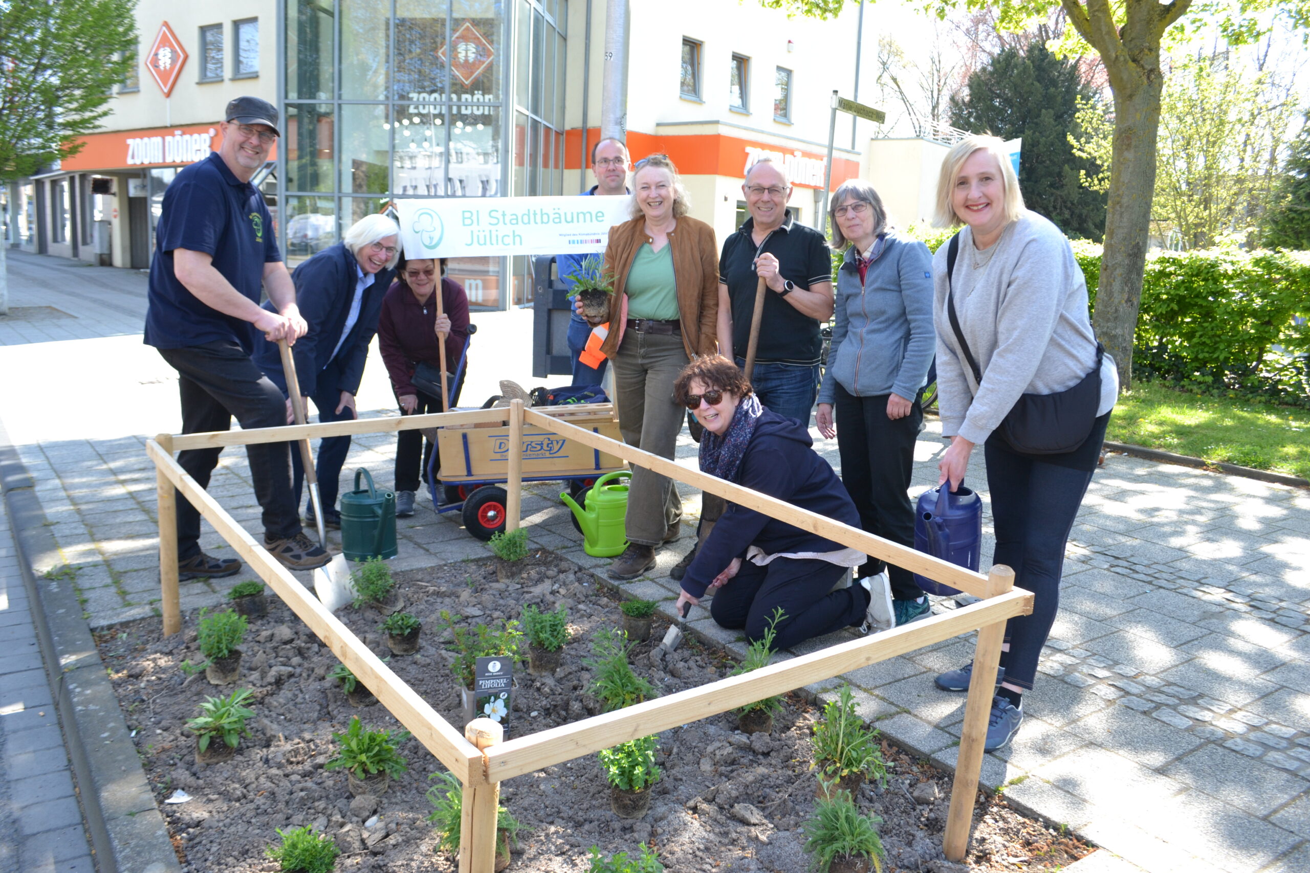 Bei guter Laune und viel Sonnenschein arbeiteten zahlreiche Mitglieder der Bürgerinitiative Stadtbäume Jülich kürzlich an der großen Rurstraße Höhe Walramplatz an einem neuen Beet für Pflanzen und Insekten.