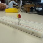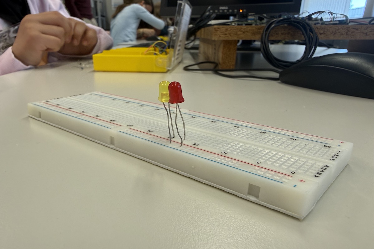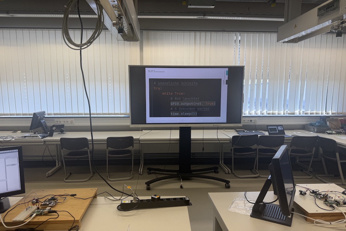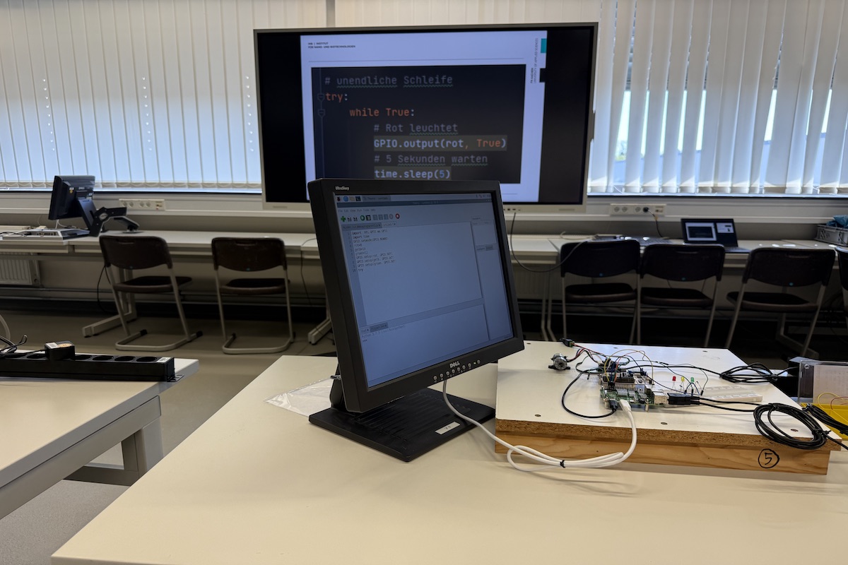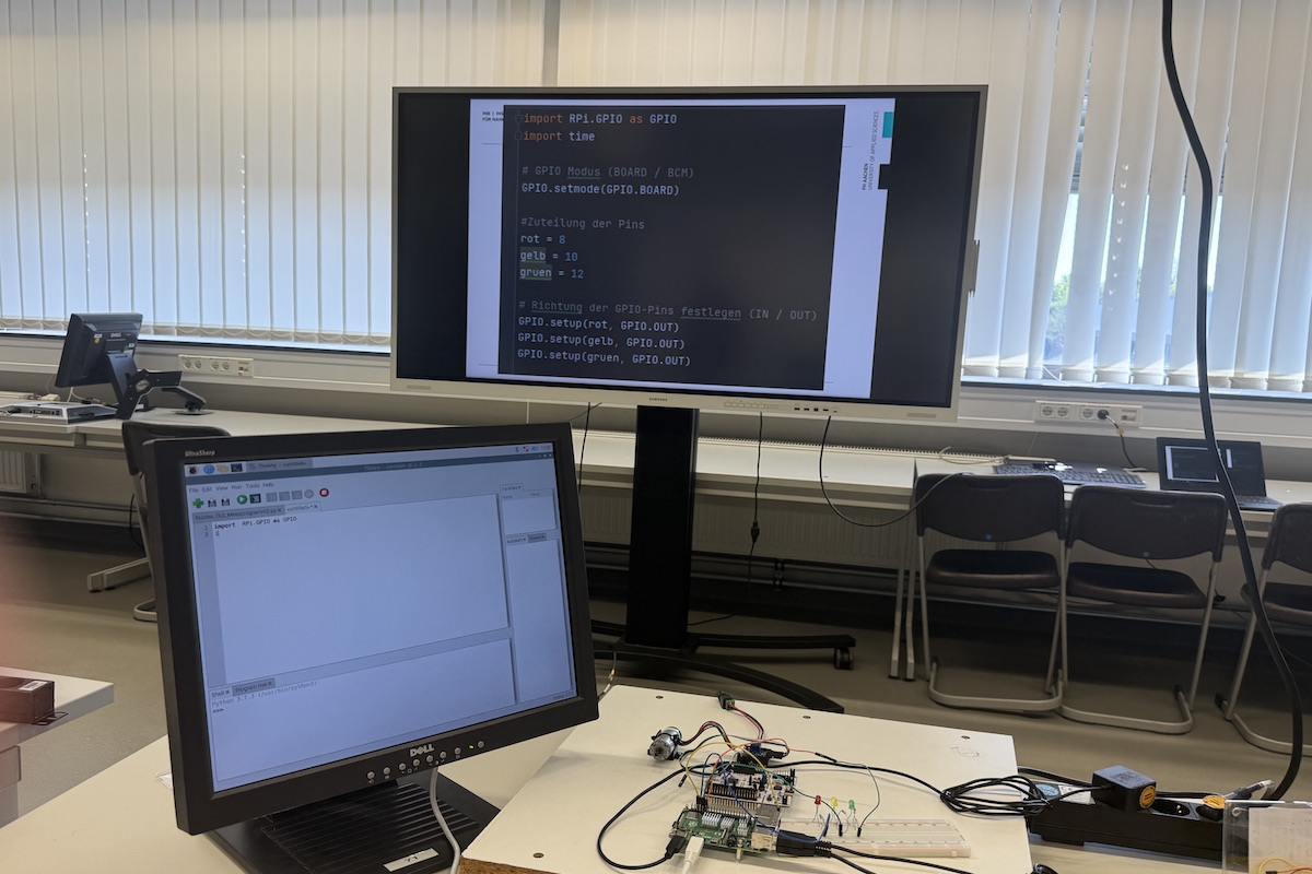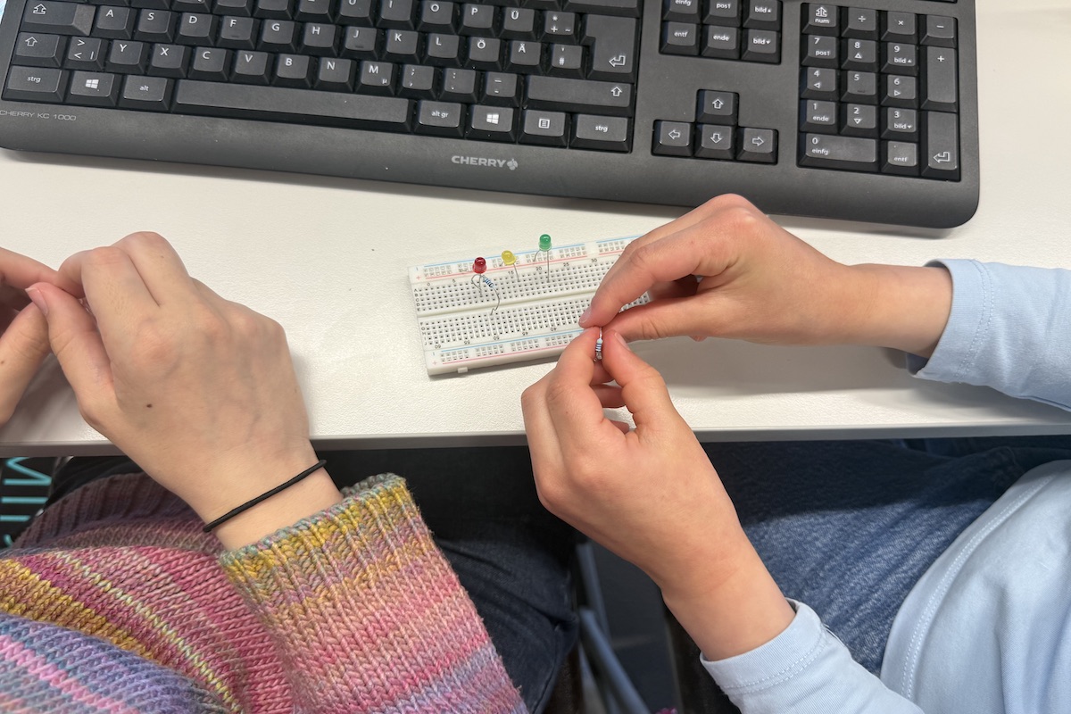 Die Teilnehmerinnen durften sich hier selbt am Progammieren eines Microcontroller in Form einer Ampel versuchen. Dafür benötigten sie ein sogenanntes „Raspberry Pi“ (den Microcontroller), ein Steckboard, LEDs und verschiedenen Widerstände. Nachdem die Ampel zusammengesteckt wurde, ging es an die Programmierung. Dafür haben die Mädchen sogar richtige Codes in die Skriptconsole eintippen dürfen. Dabei lag der Fokus vor allem auf dem Schaltzyklus der Ampel.