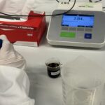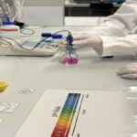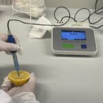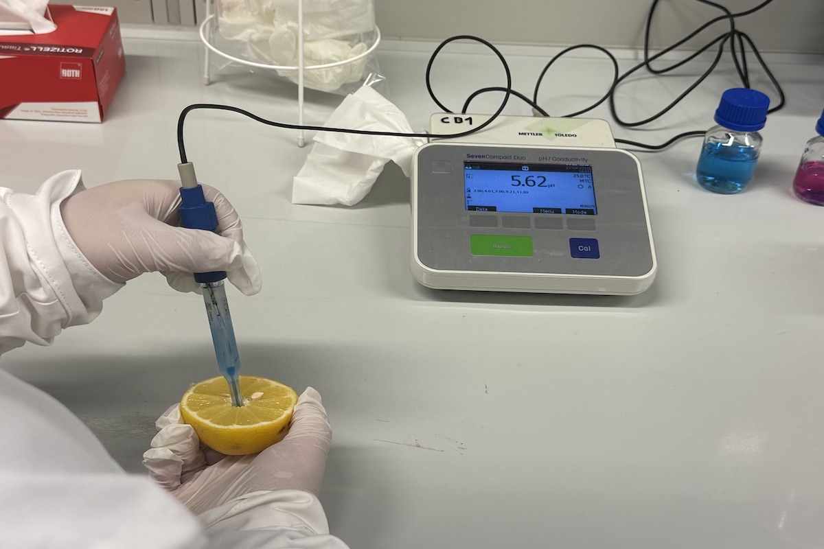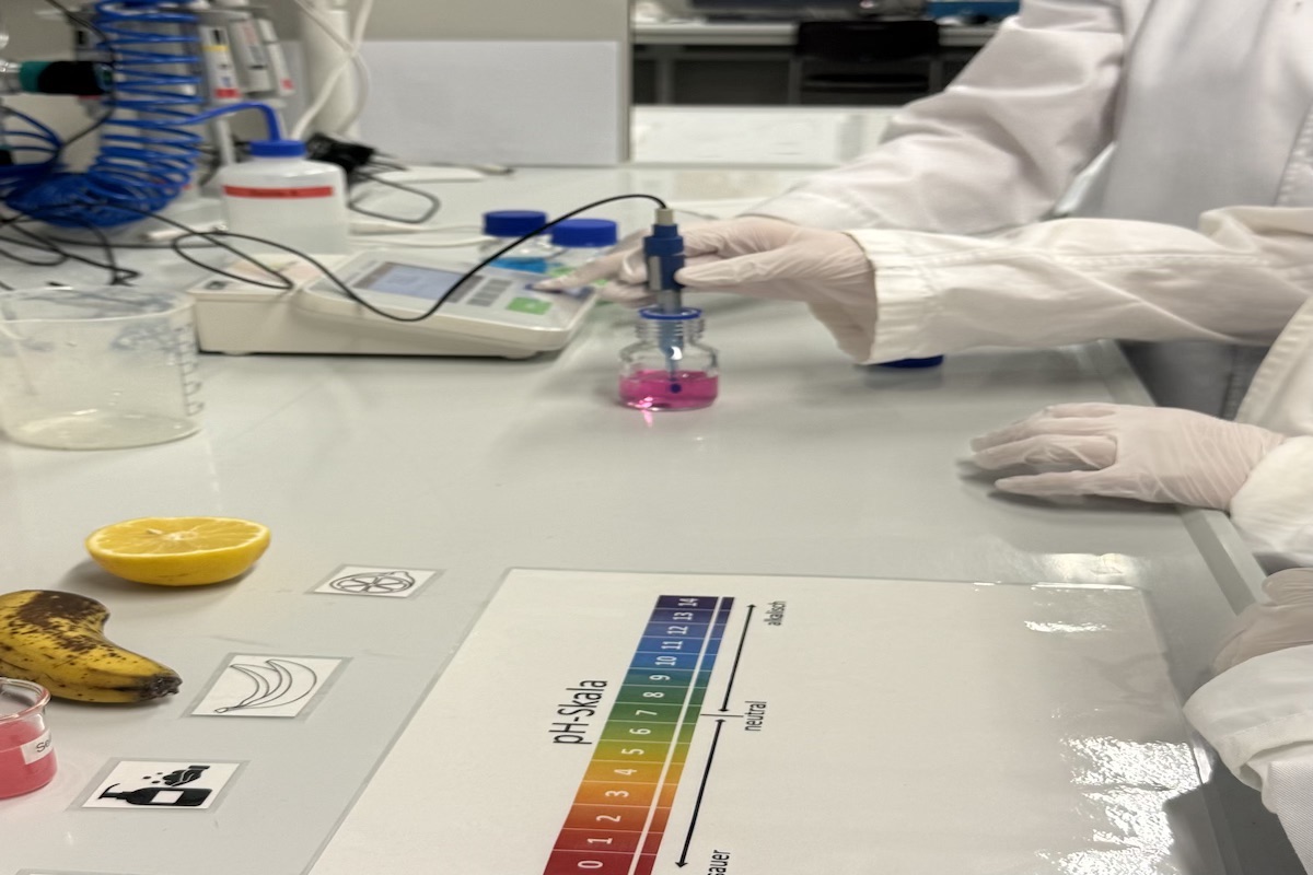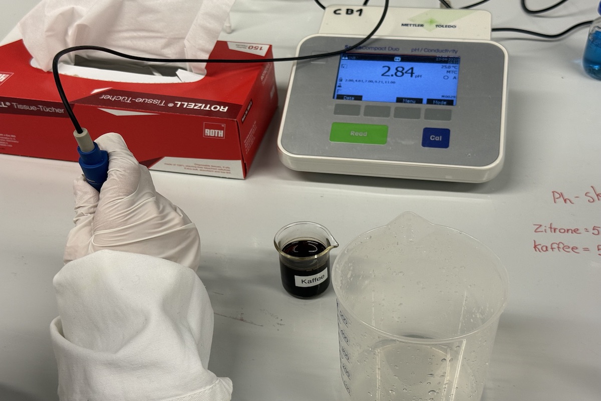 Auch bei einer pH-Wert-Messung waren die Mädchen dabei. Dort wurde zuerst die pH-Wert-Skala besprochen. Dieser Wert wird mit einer Elektrode gemessen. Bevor die eigentliche Messung beginnen konnte, musste die Elektrode jedoch zuerst kalibriert werden. Dafür wurden Phiolen mit unterschiedlichen Flüssigkeiten befüllt, deren pH-Werte bereits bekannt sind. Nachdem die Elektrode dann kalibriert war, ging es ans Messen verschiedener Werten. Die Mädchen durften nun selbst ans Werk. Sie haben die Werte von Zitrone, Seife, Spülmittel und einigen weiteren Lebensmitteln ermessen. Dabei war das Highlight, die Ergebnisse auf der beschreibbaren Tischplatte zu dokumentieren.