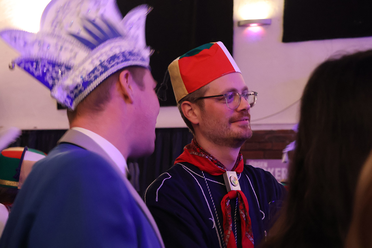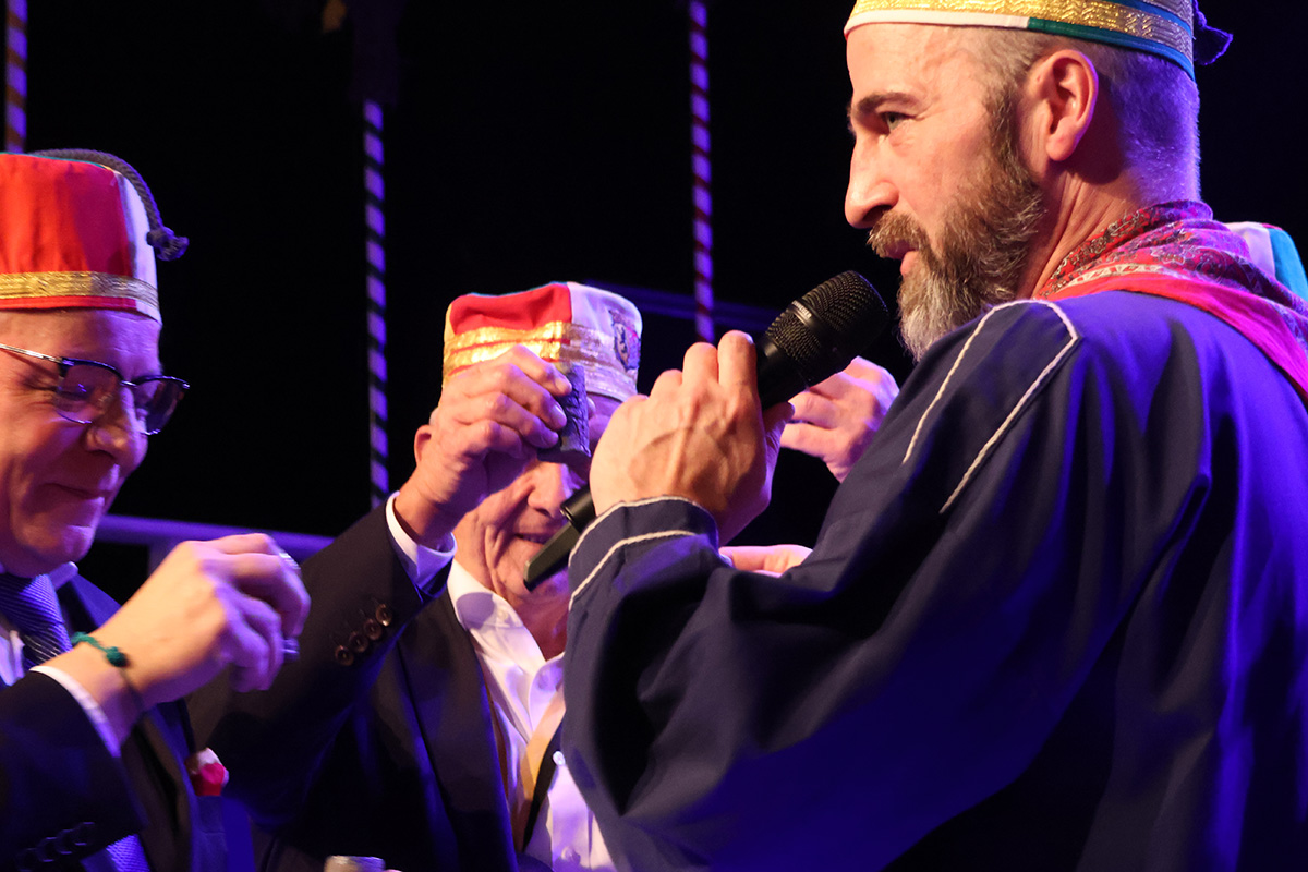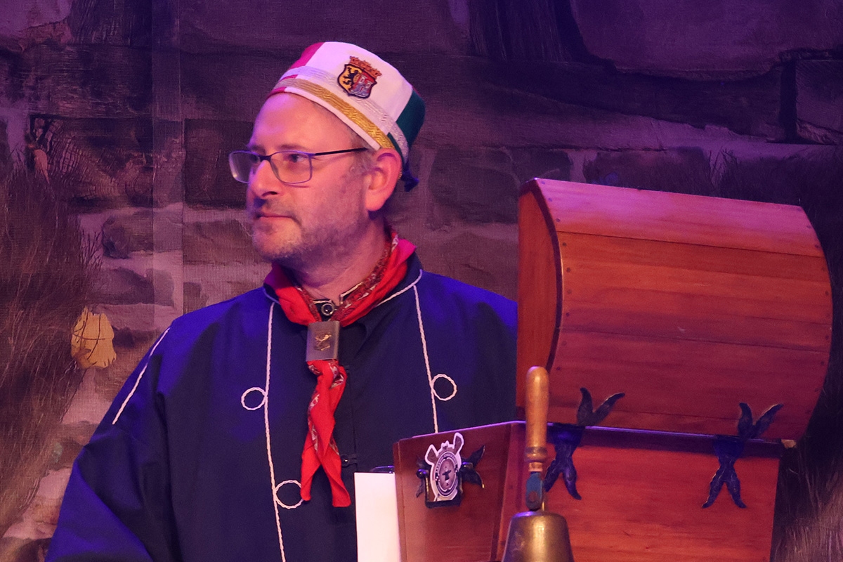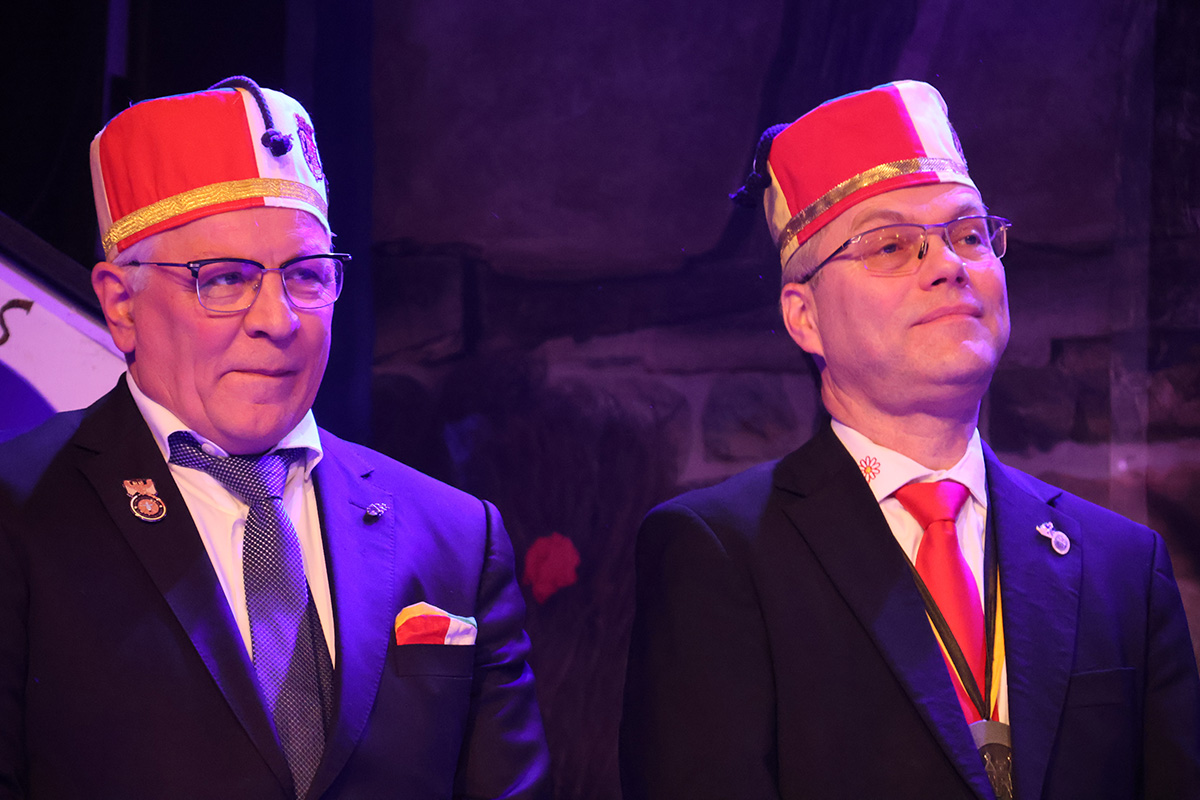 Wie es gute Tradition ist, gab Vorjahres-Ordensträger Uwe Groteklaes warme Worte mit auf den Weg. Es war hörbar, wie sehr ihn dieses Amt immer noch bewegt. Im Klartext formulierte der Pate von „Lazarus Auvenius“ wie sehr er die Session genossen habe und dass es „etwas mit einem macht“. Was, das sei kaum in Worte zu fassen. Zumindest über den Taufpaten wird er aber einige Worte finden müssen, denn – auch das ist Tradition – wenn Patthühm Jörg Bücher am Tulpensonntag als äußeres Zeichen seiner Patenschaft den Hexenturmorden erhält, wird die Laudatio vom Vorjahres-Paten gehalten.