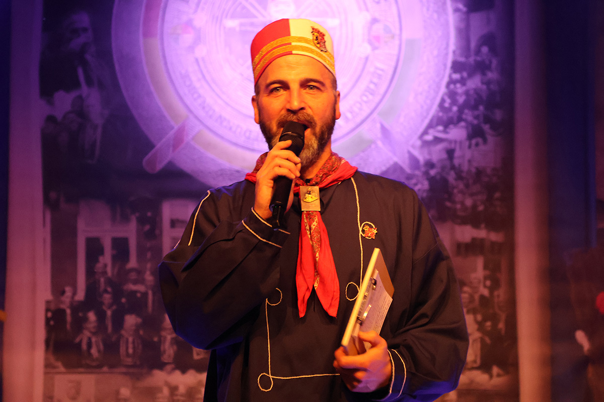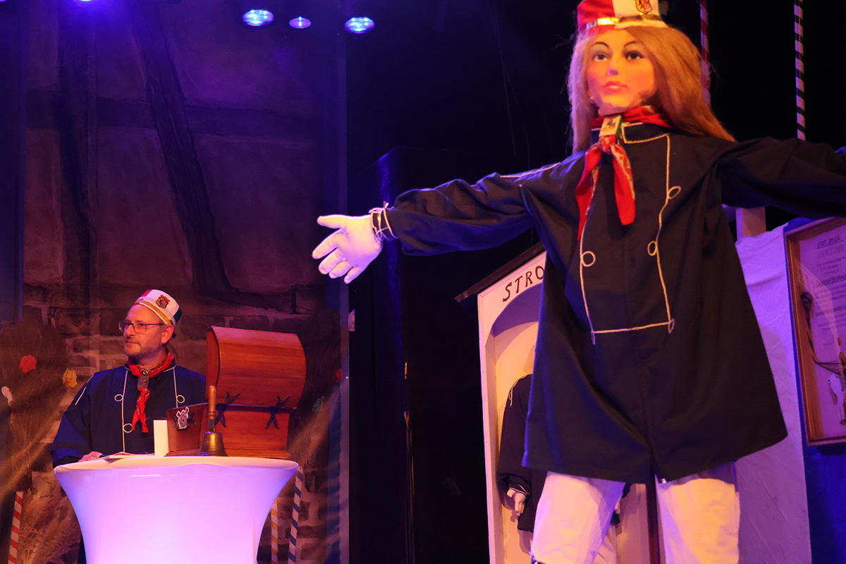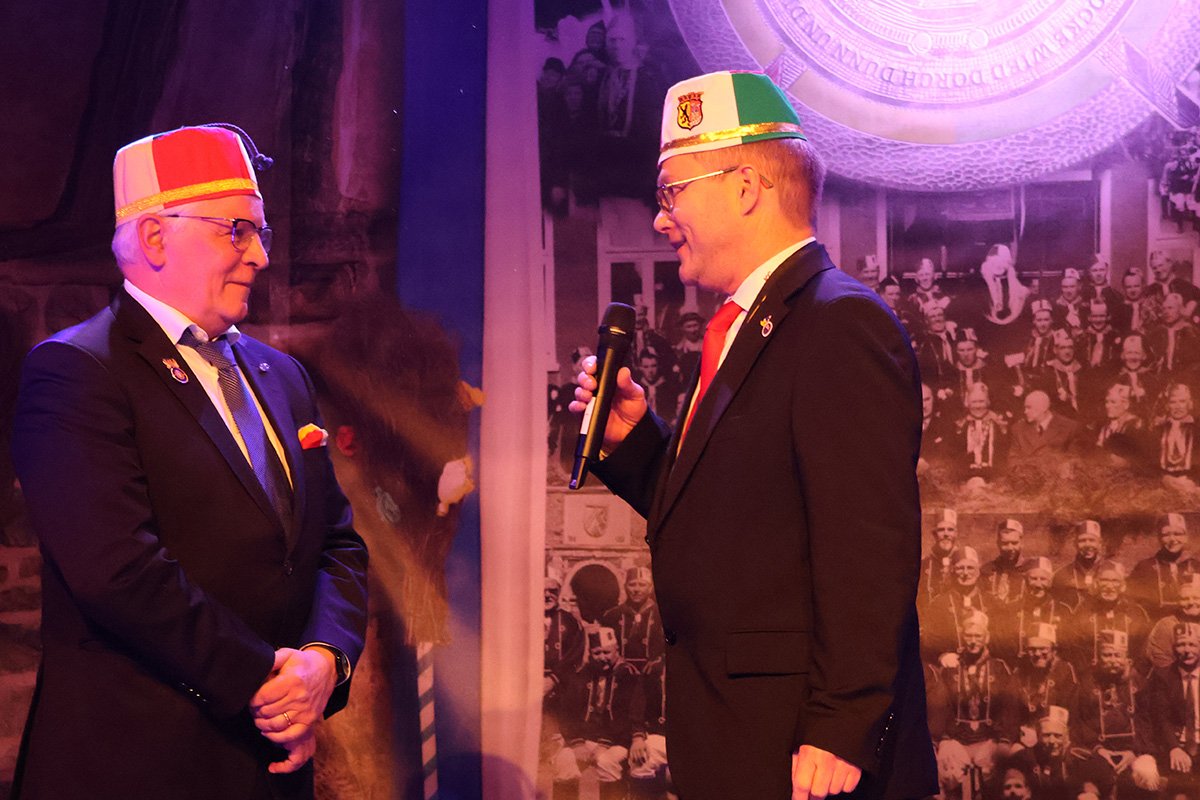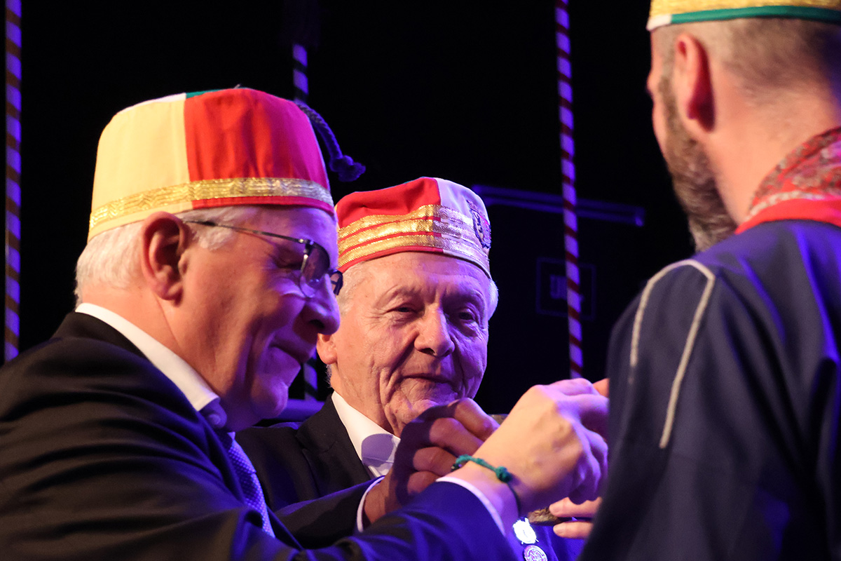 Wie es gute Tradition ist, gab Vorjahres-Ordensträger Uwe Groteklaes warme Worte mit auf den Weg. Es war hörbar, wie sehr ihn dieses Amt immer noch bewegt. Im Klartext formulierte der Pate von „Lazarus Auvenius“ wie sehr er die Session genossen habe und dass es „etwas mit einem macht“. Was, das sei kaum in Worte zu fassen. Zumindest über den Taufpaten wird er aber einige Worte finden müssen, denn – auch das ist Tradition – wenn Patthühm Jörg Bücher am Tulpensonntag als äußeres Zeichen seiner Patenschaft den Hexenturmorden erhält, wird die Laudatio vom Vorjahres-Paten gehalten.