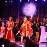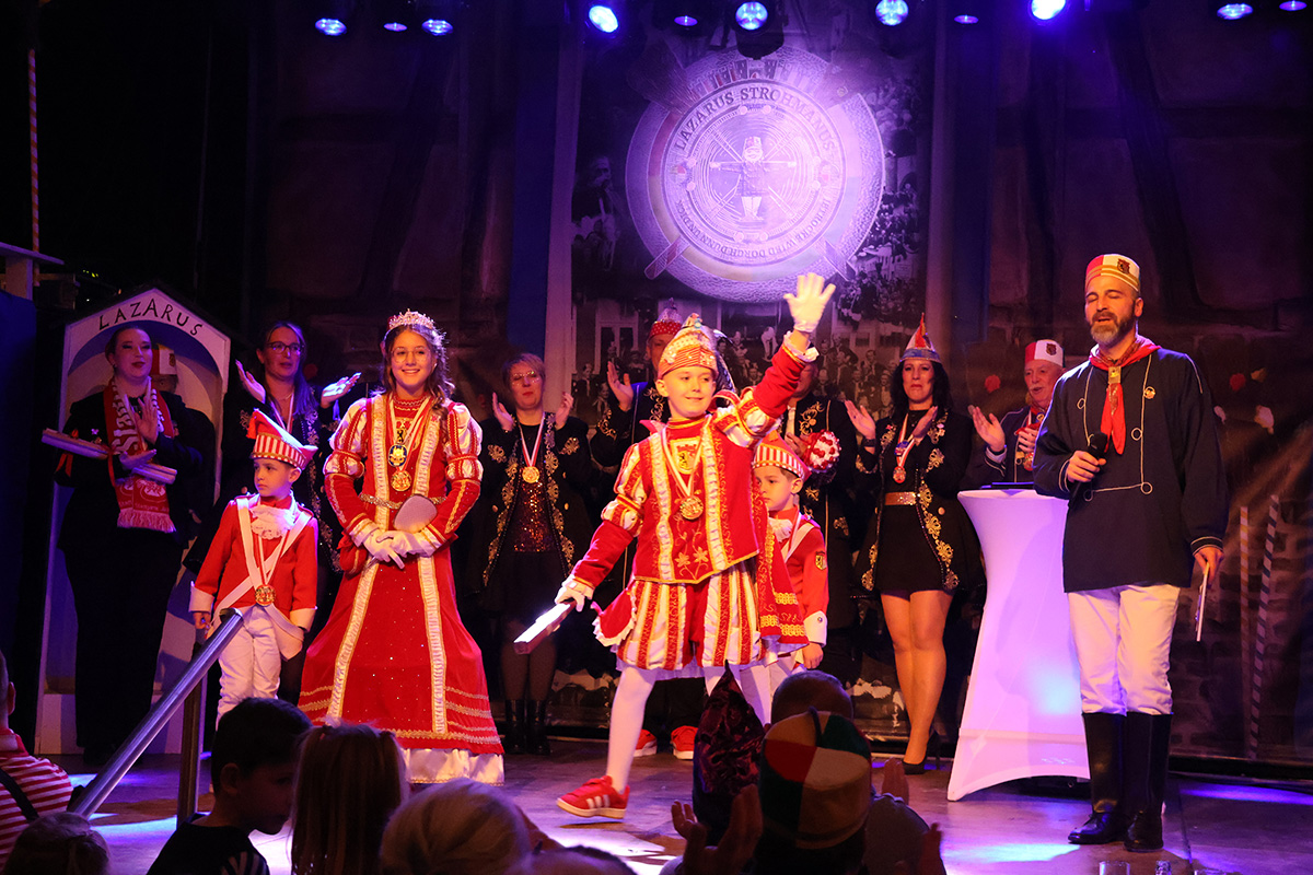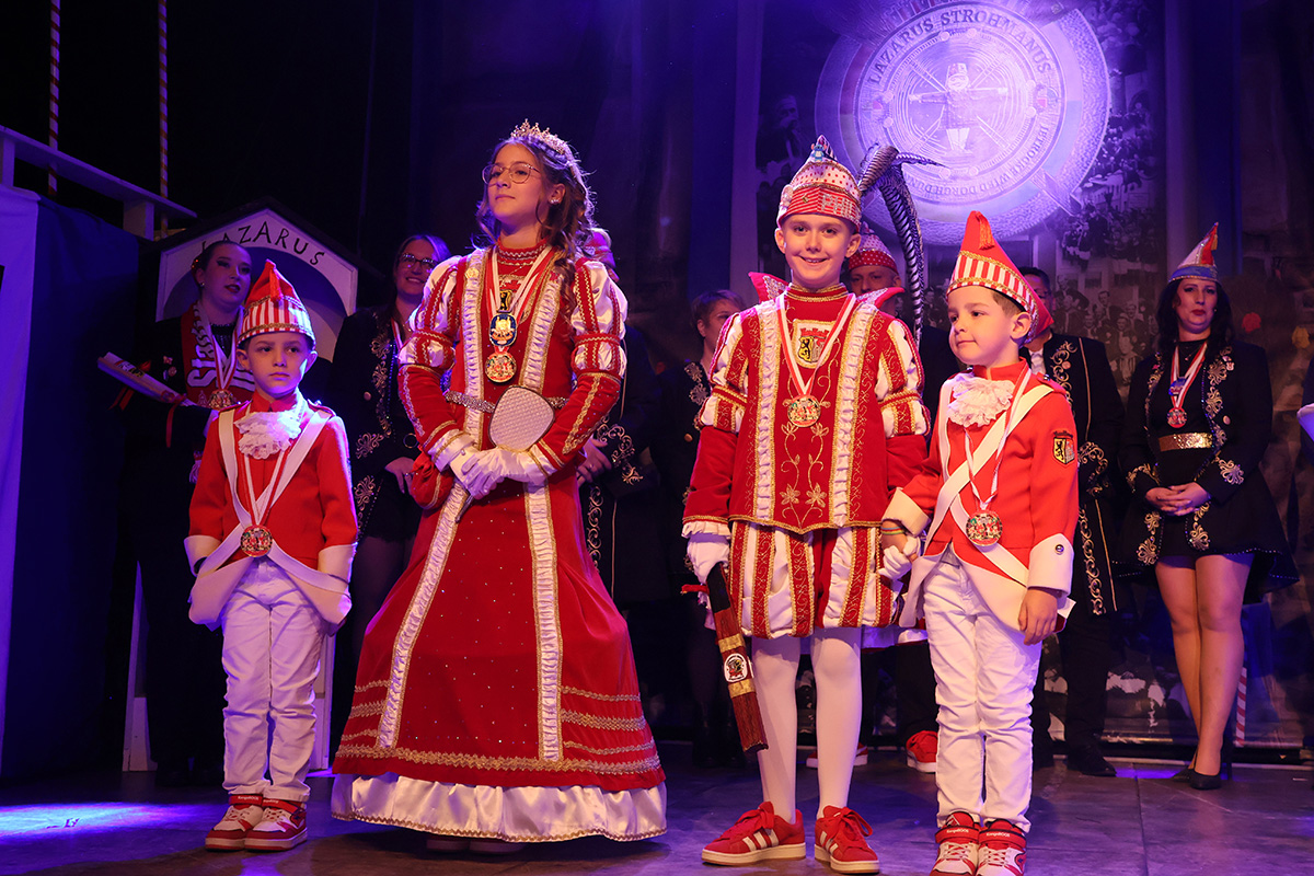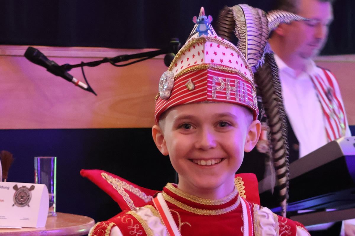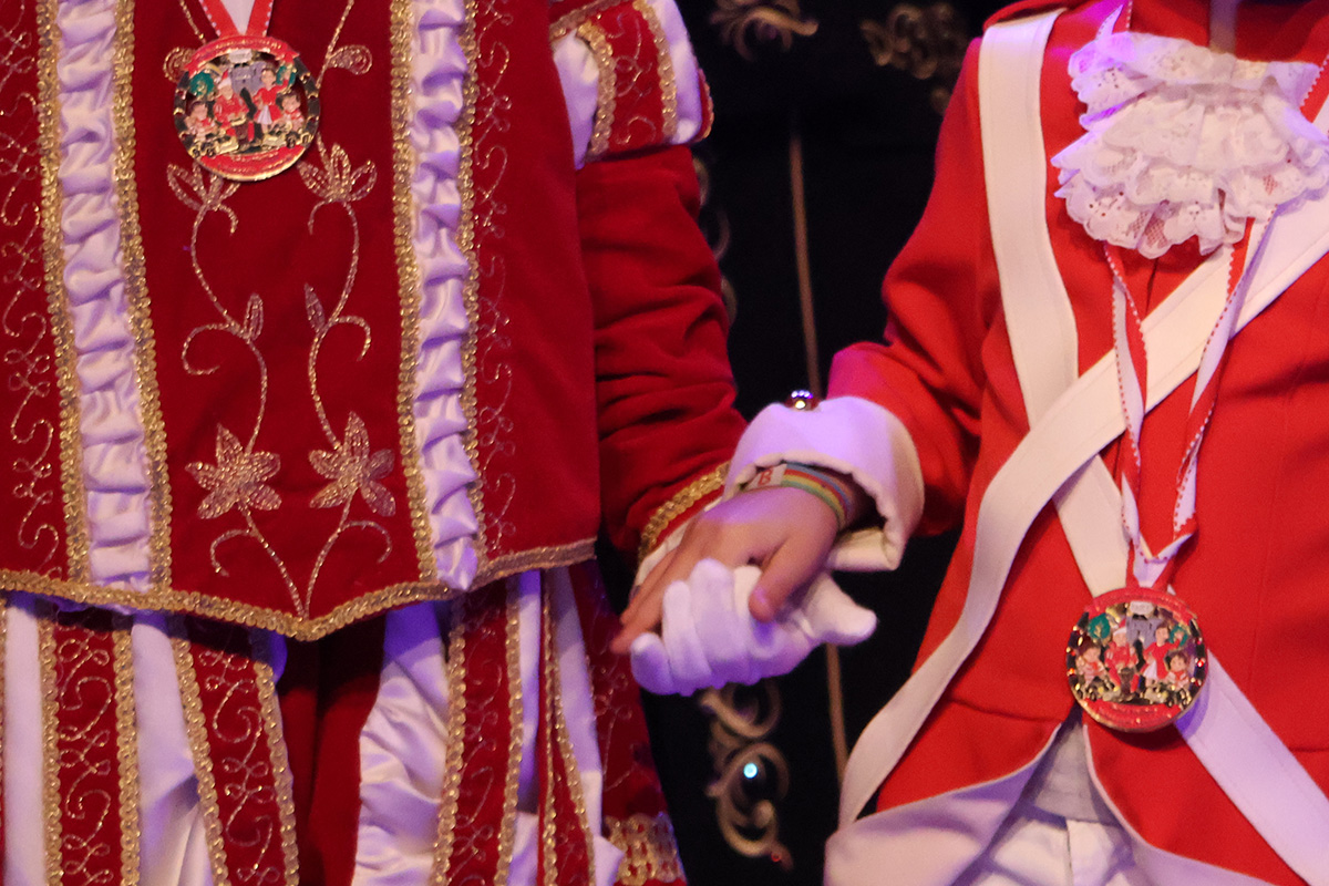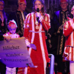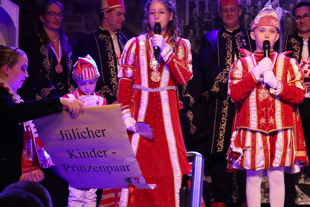 Unter den gekrönten närrischen Häuptern, die sich als Festgäste eingefunden haben, waren selbstredend auch die Regenten Prinzessin Anastasia und Prinz Philipp – dem die Gesellschaft zum 11. Geburtstag sogar ein Ständchen brachte – samt Pagen Ben und Felix Schröder. Im Gefolge des närrischen Prinzenpaares, das sich in diesem Jahr aus dem Jubiläums-Verein Stadtgarde Jülich rekrutiert, brachten sie ihre Garde mit, die zu „Konfetti in der Luft“ die Tanzbeine in ebendiese schwangen.