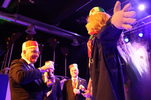 Wie es gute Tradition ist, gab Vorjahres-Ordensträger Uwe Groteklaes warme Worte mit auf den Weg. Es war hörbar, wie sehr ihn dieses Amt immer noch bewegt. Im Klartext formulierte der Pate von „Lazarus Auvenius“ wie sehr er die Session genossen habe und dass es „etwas mit einem macht“. Was, das sei kaum in Worte zu fassen. Zumindest über den Taufpaten wird er aber einige Worte finden müssen, denn – auch das ist Tradition – wenn Patthühm Jörg Bücher am Tulpensonntag als äußeres Zeichen seiner Patenschaft den Hexenturmorden erhält, wird die Laudatio vom Vorjahres-Paten gehalten.