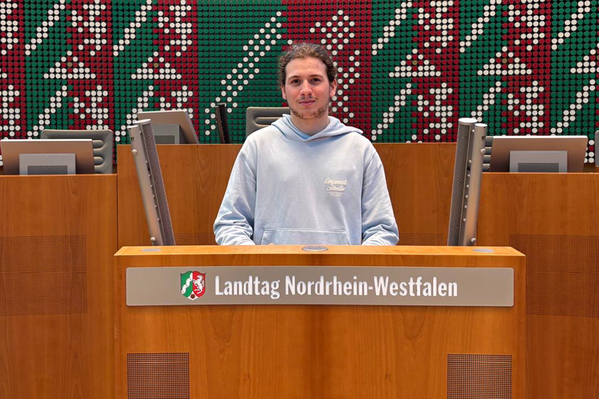 Noch ehe er nach Düsseldorf fuhr, begann die Vorbereitung: Klar war, dass es um die Installierung eines Jugendparlamentes gehen würde und um das Deutschlandticket. Hierzu gab es im Vorfeld digital entsprechenden Lesestoff zur Vorbereitung. Ganz schön anspruchsvoll. Mit 200 Gleichgesinnten ging es dann freitags los.