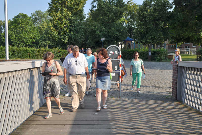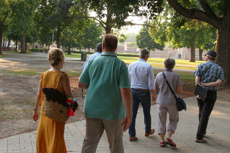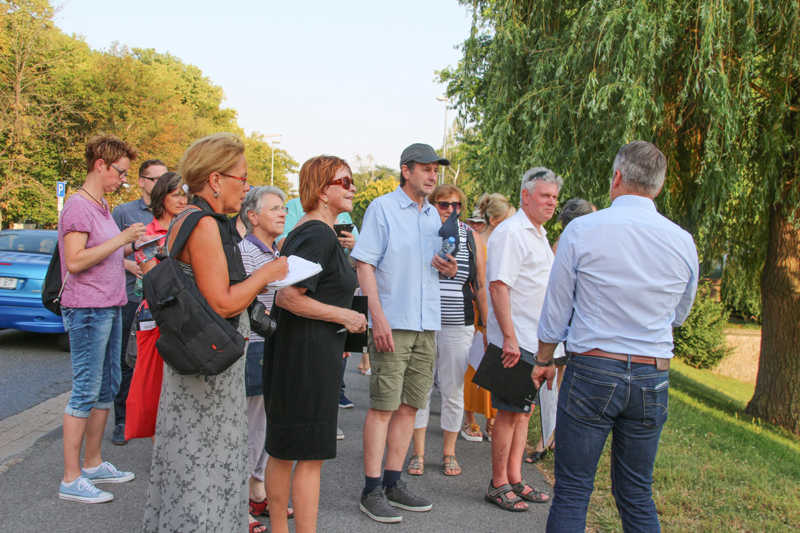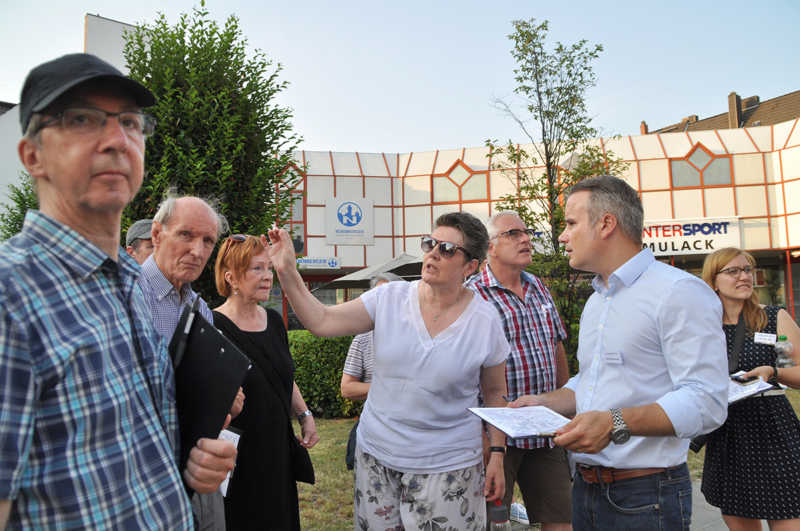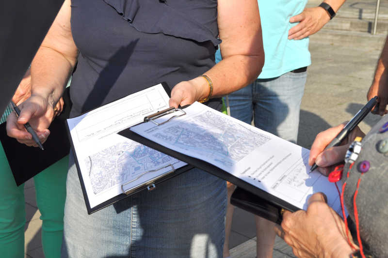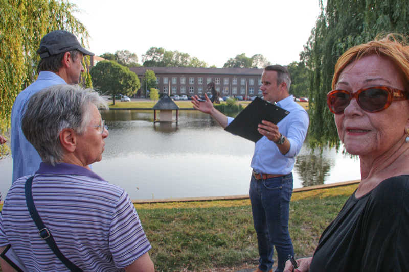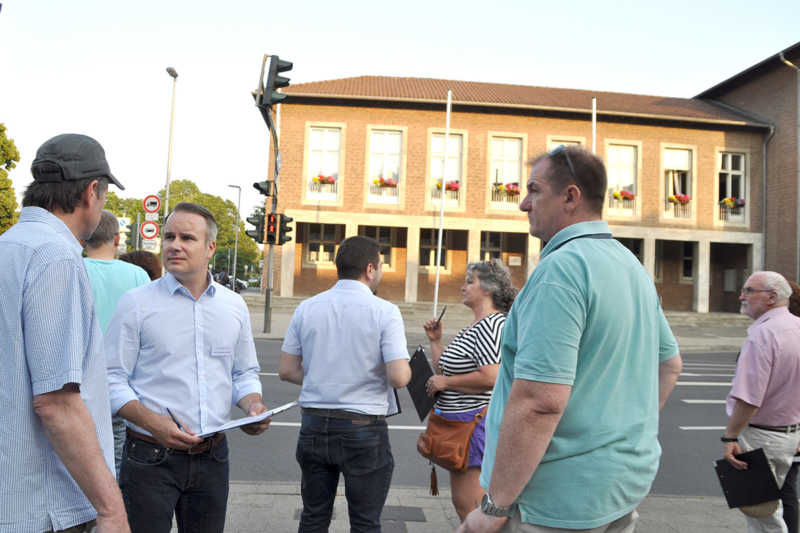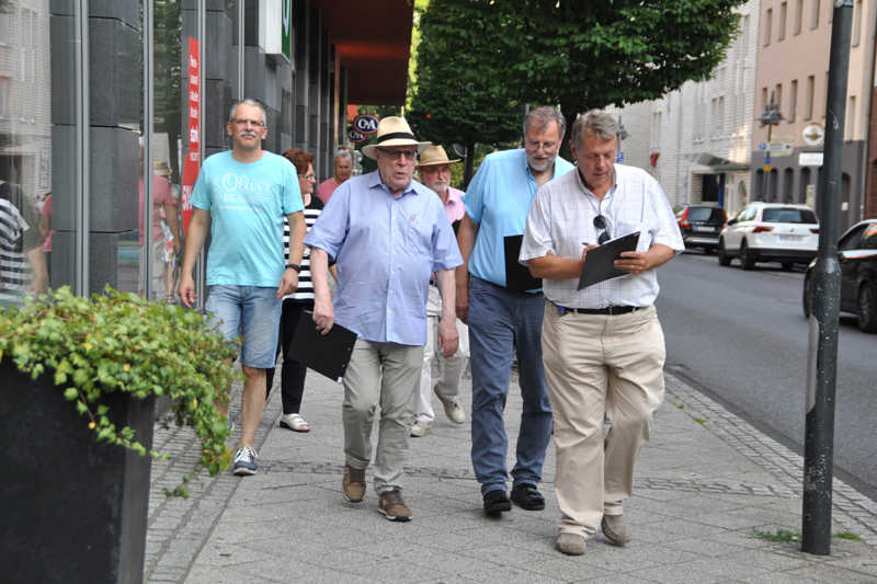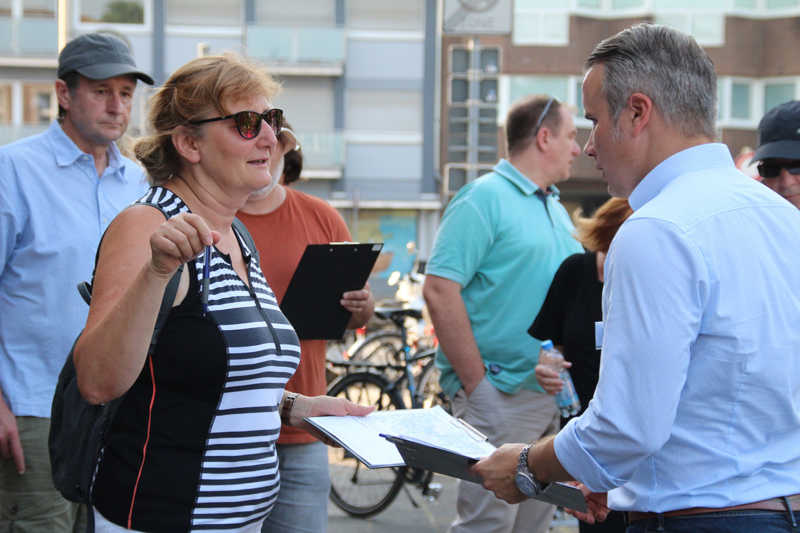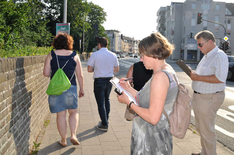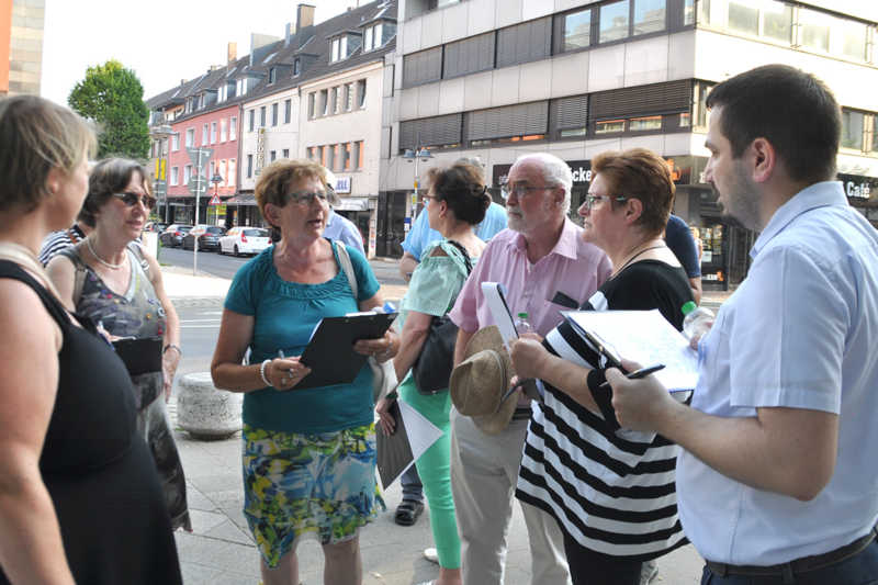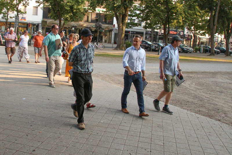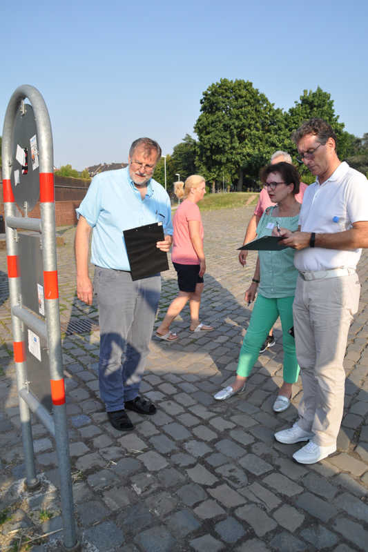Trotz Hitze machen sich rund 30 Jülicher mit Bernd Niedermeier und seinem Team auf den Weg. Die Aufgabe: Im Kernbereich der Innenstadt vor Ort zu überlegen, wo Handlungsbedarf und Chancen zu sehen sind. Zwei Routen waren im Angebot, die sich im zentralen Bereich Innenstadt und Zitadelle überschnitten. Aber während bei der einen Gruppe Rurdamm und Brückenkopf auf dem Weg lagen, marschierte Gruppe 2 entlang der Promenade zum Bahnhof und vorbei am Schwanenteich.