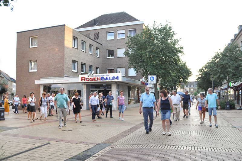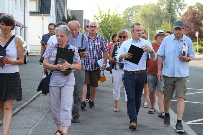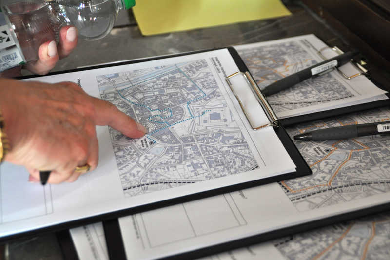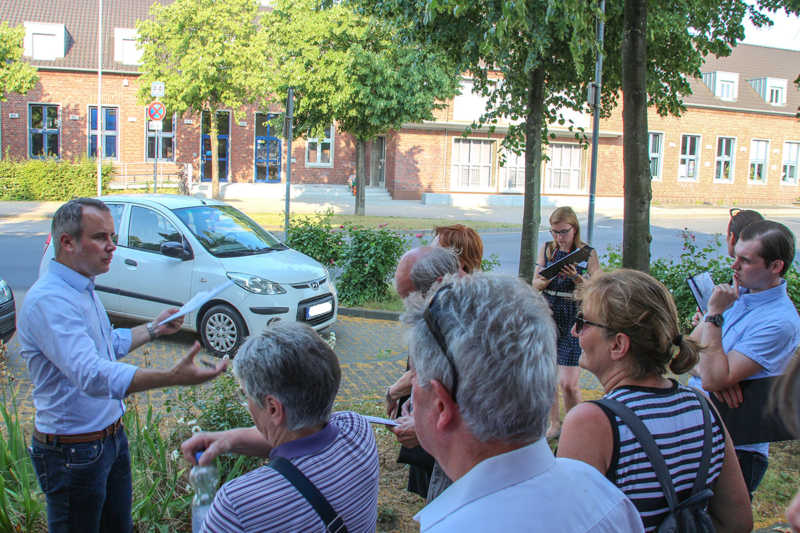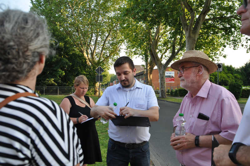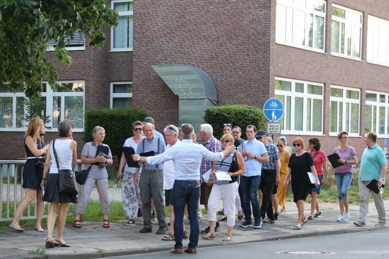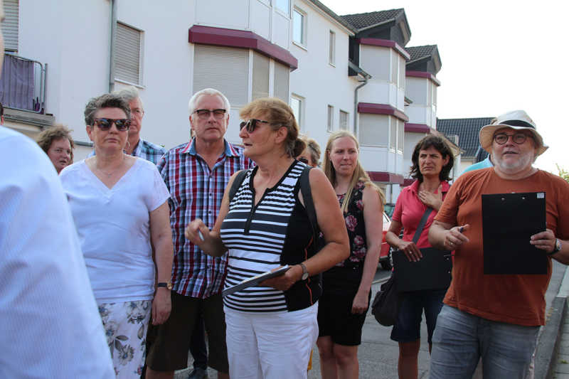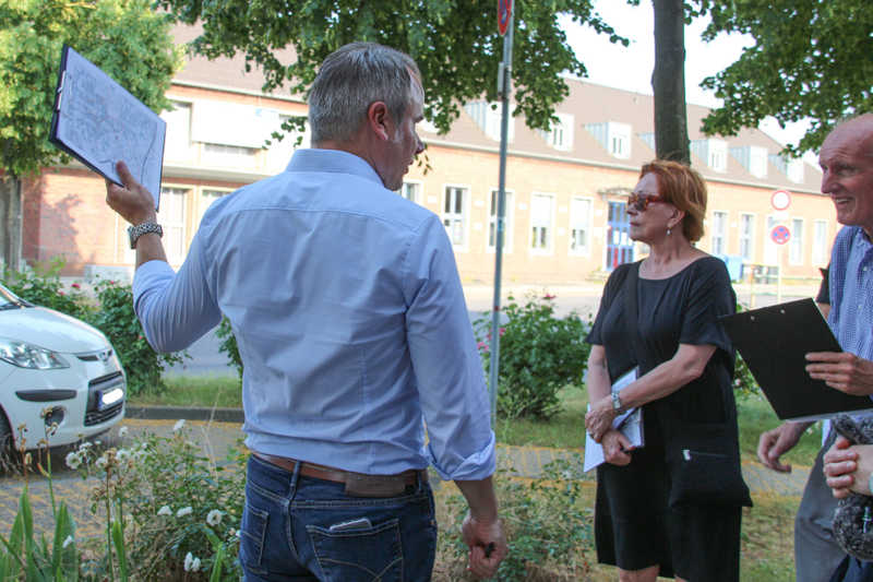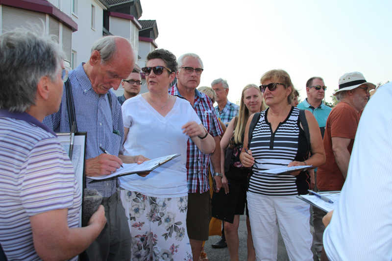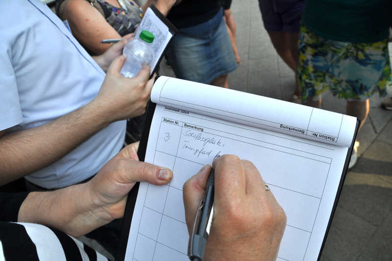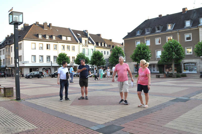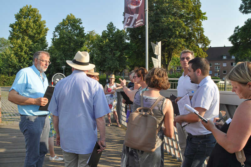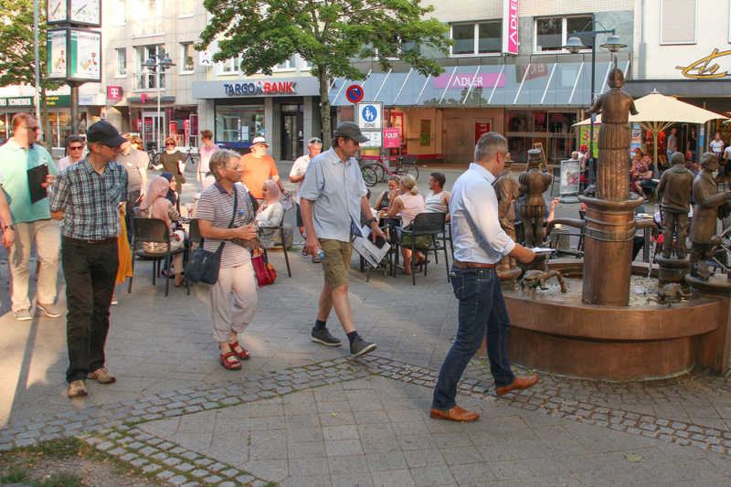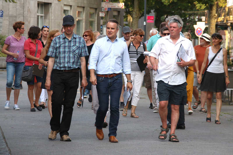 Trotz Hitze machen sich rund 30 Jülicher mit Bernd Niedermeier und seinem Team auf den Weg. Die Aufgabe: Im Kernbereich der Innenstadt vor Ort zu überlegen, wo Handlungsbedarf und Chancen zu sehen sind. Zwei Routen waren im Angebot, die sich im zentralen Bereich Innenstadt und Zitadelle überschnitten. Aber während bei der einen Gruppe Rurdamm und Brückenkopf auf dem Weg lagen, marschierte Gruppe 2 entlang der Promenade zum Bahnhof und vorbei am Schwanenteich.