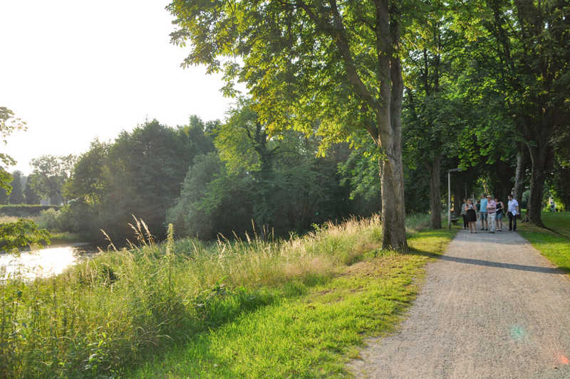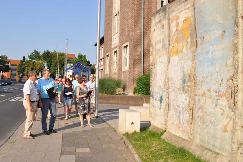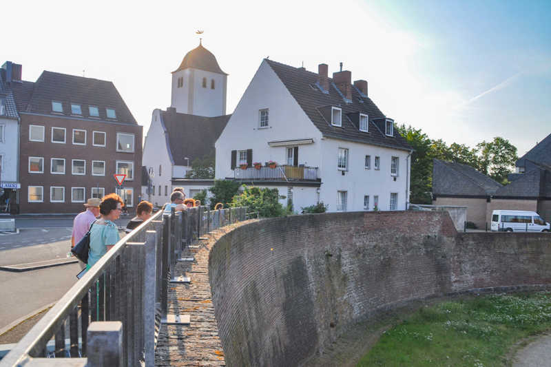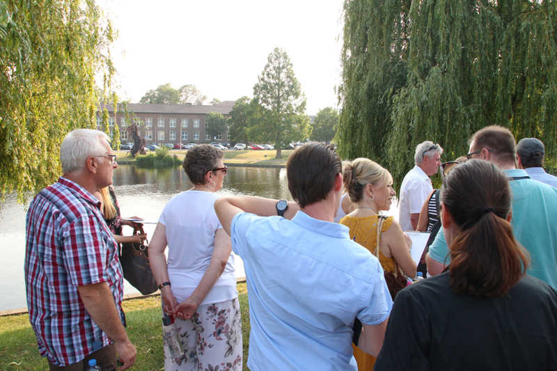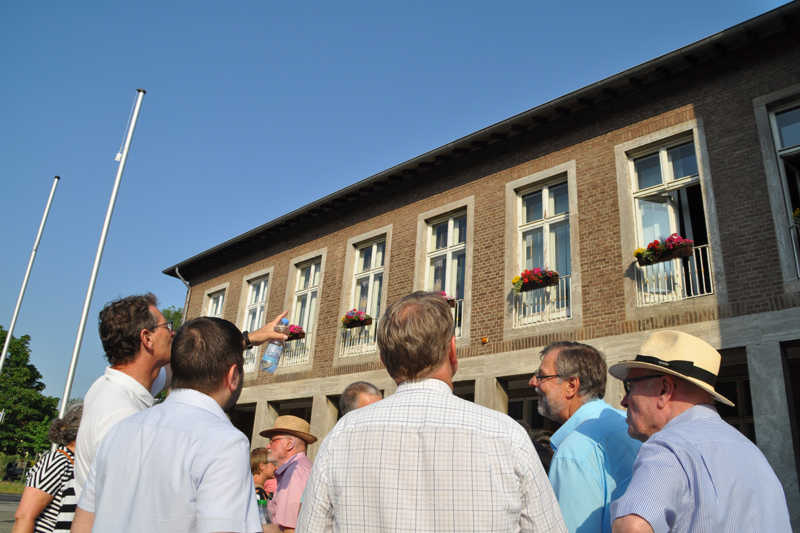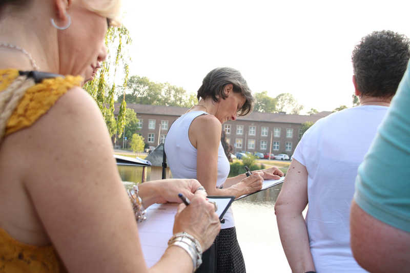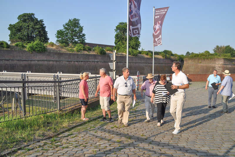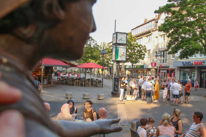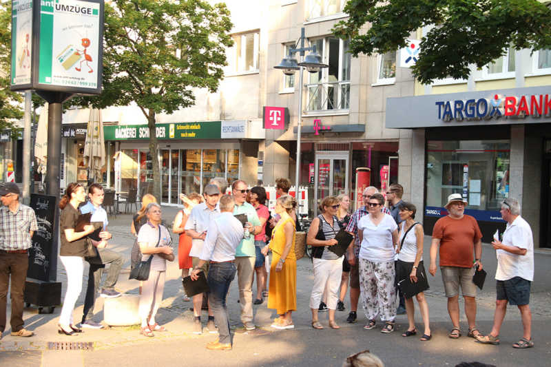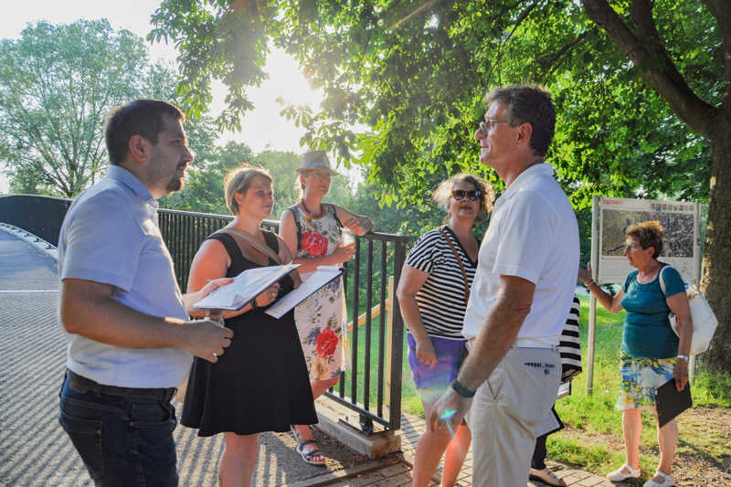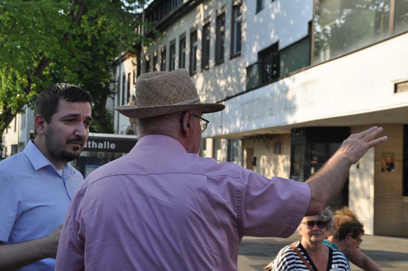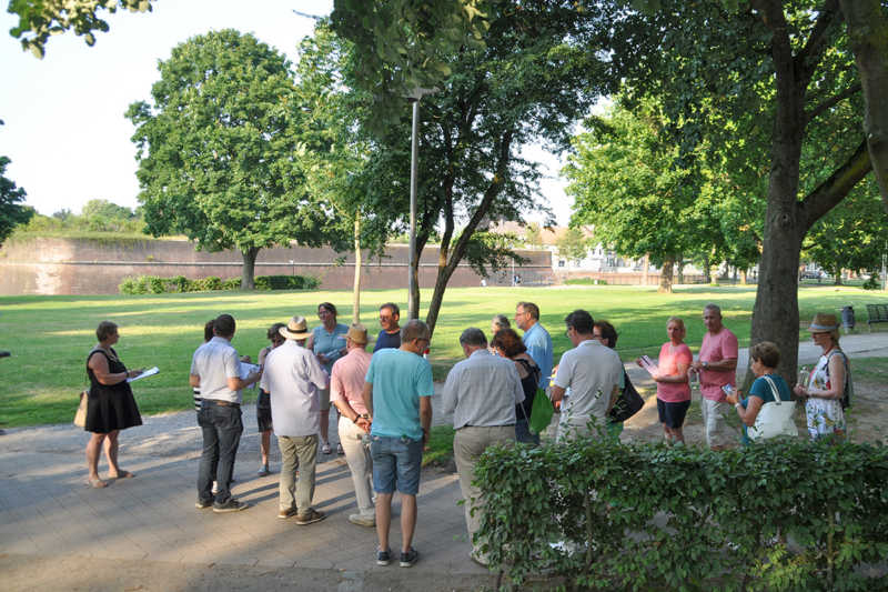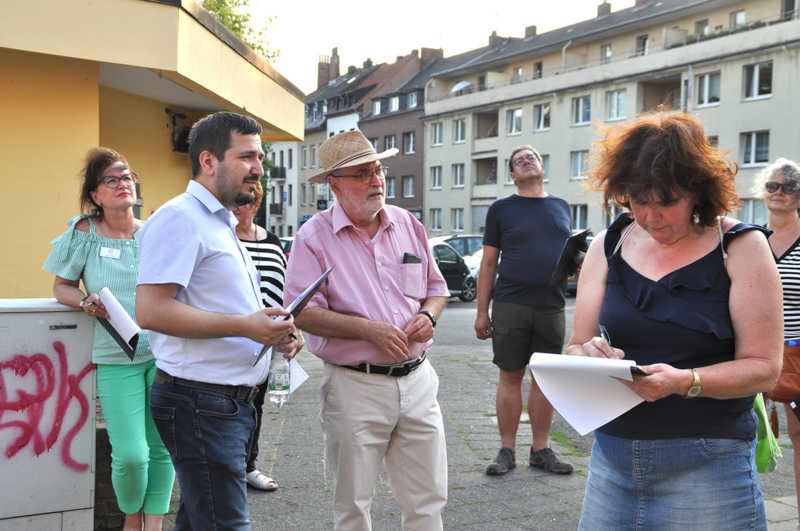 Trotz Hitze machen sich rund 30 Jülicher mit Bernd Niedermeier und seinem Team auf den Weg. Die Aufgabe: Im Kernbereich der Innenstadt vor Ort zu überlegen, wo Handlungsbedarf und Chancen zu sehen sind. Zwei Routen waren im Angebot, die sich im zentralen Bereich Innenstadt und Zitadelle überschnitten. Aber während bei der einen Gruppe Rurdamm und Brückenkopf auf dem Weg lagen, marschierte Gruppe 2 entlang der Promenade zum Bahnhof und vorbei am Schwanenteich.