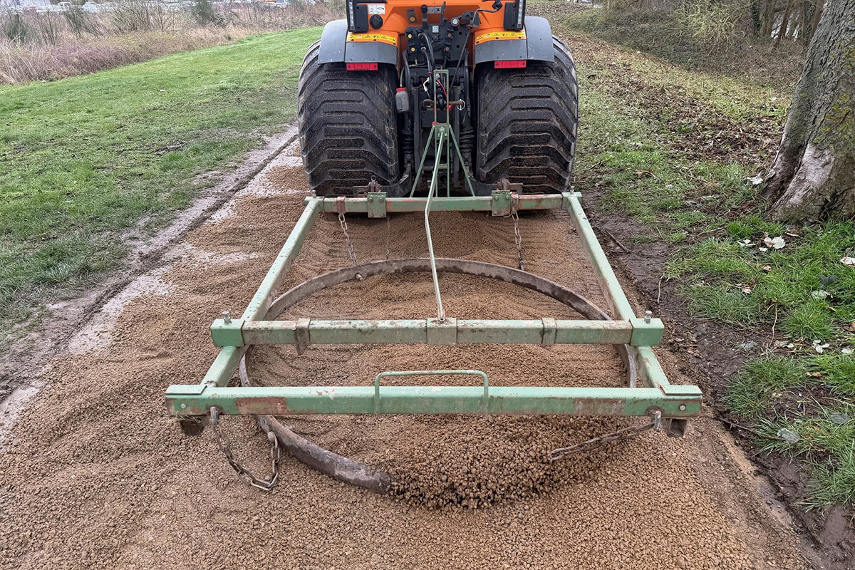 Die Raiffeisen Warenzentrale in Rommerskirchen stellte der Stadt Jülich die Maschine testweise zur Verfügung, damit der Bauhof den praktischen Einsatz sowie den möglichen Nutzen einer Anschaffung prüfen kann. Das Wegepflegegerät wird als Anbaugerät an einem Kommunalschlepper betrieben. In einem Arbeitsgang wird die oberste Schicht der wassergebundenen Fläche abgetragen durchmischt, neu profiliert und verdichtet. Dadurch entsteht ein gleichmäßiger und stabiler Untergrund.