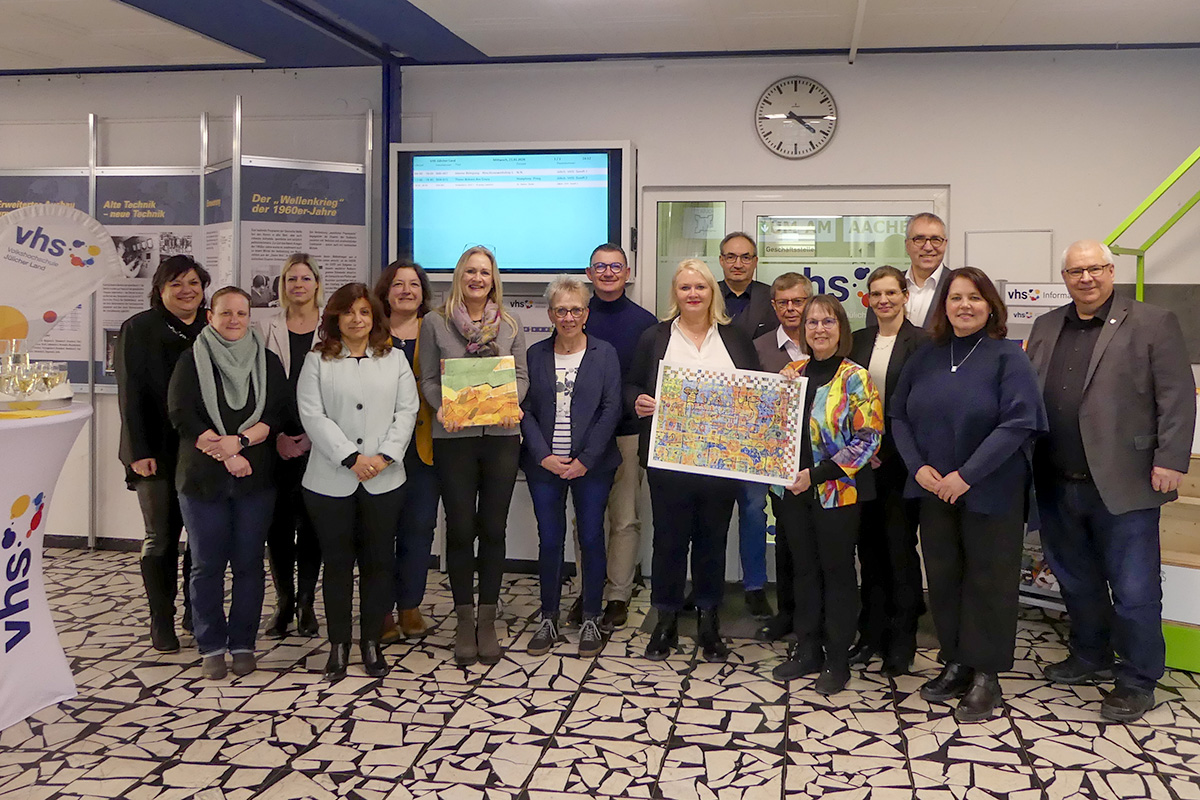 Im Forum Aachener Tor überreichte die Gutachterin Lieselotte Berthold dem Team der Volkshochschule Jülicher Land das Testat, das bis 2030 die Qualität der Erwachsenenbildungseinrichtung besiegelt. Marion Schunck-Zenker, Bürgermeisterin der Stadt Linnich, Ralf Claßen, Bürgermeister der Gemeinde Aldenhoven, Jürgen Frantzen, Bürgermeister der Landgemeinde Titz und Thomas Mülheims, Dezernent der Stadt Jülich, waren dabei, um ihrer Volkshochschule zu diesem Erfolg zu gratulieren.